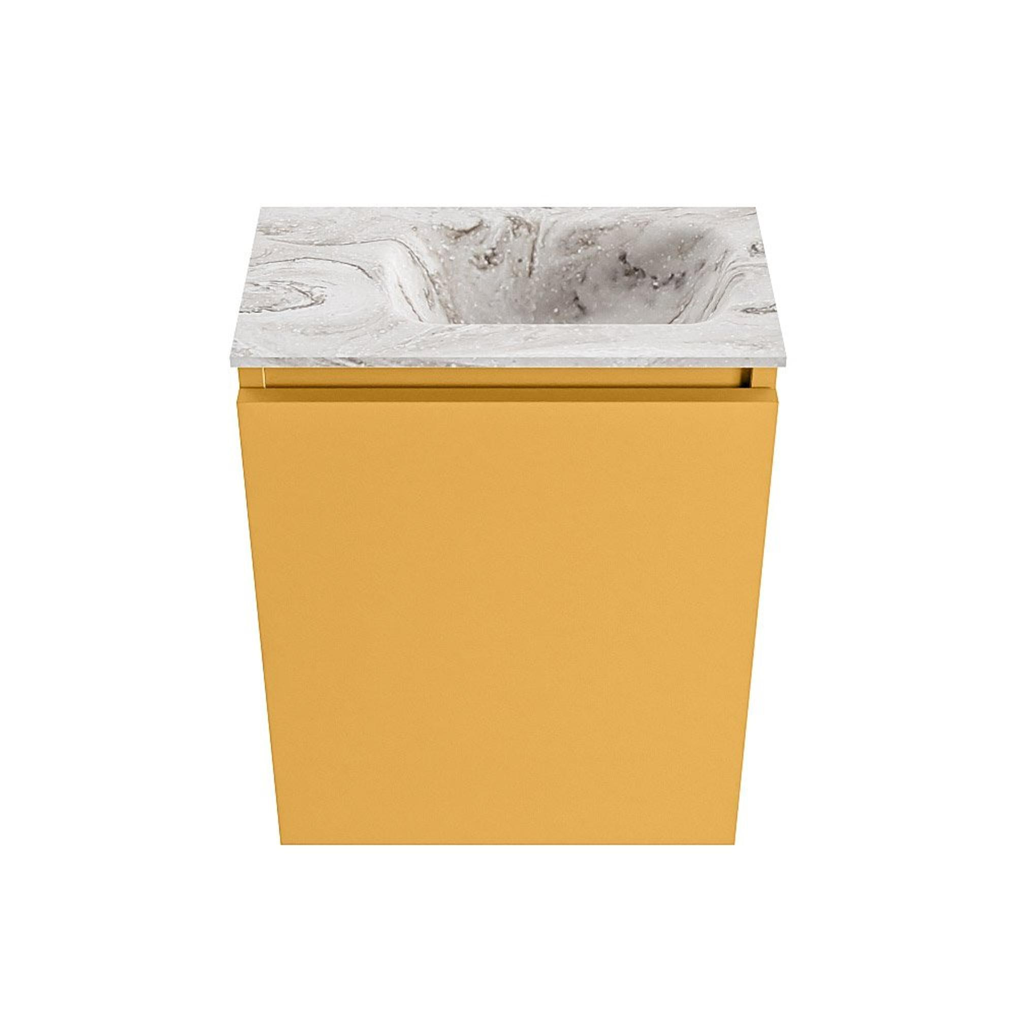 La couleur moderne Ocher du meuble donne immédiatement à vos toilettes une apparence chaleureuse et contemporaine. Cette teinte jaune douce se marie à merveille avec des carreaux neutres, des accents noirs ou encore des essences de bois chaudes. Le lavabo EDEN en Glace avec plan vasque aspect marbre ajoute un détail luxueux et chic, comme si vous créiez une mini-salle de bains d’hôtel. Grâce aux façades sans poignées, l’ensemble paraît épuré et minimaliste, sans lignes perturbatrices ni poignées saillantes. Cela rend ce meuble particulièrement adapté aux intérieurs modernes, aux amateurs de design et à tous ceux qui souhaitent créer un effet marquant dans le plus petit espace, sans que l’ensemble paraisse chargé ou désordonné.