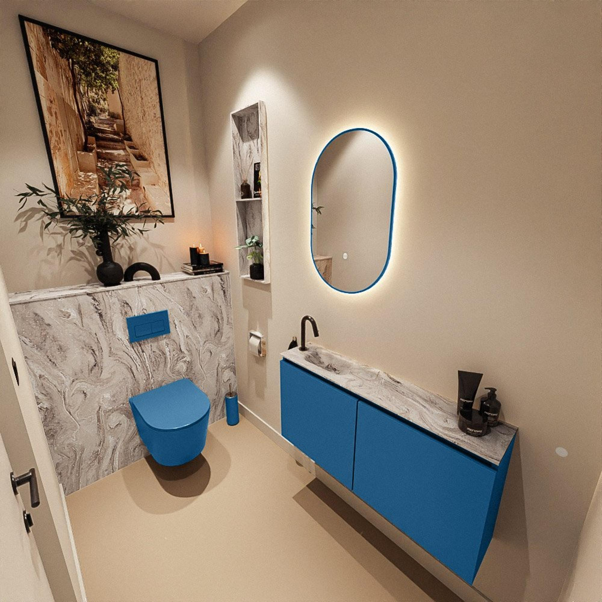 Si vous recherchez un meuble élégant et intelligent pour vos toilettes ou une petite salle de bains, alors ce meuble de toilettes compact est un choix très bien étudié. Grâce à sa faible profondeur, il s’intègre parfaitement dans un espace étroit ou à côté des toilettes, sans perdre d’espace de circulation. La couleur bleue moderne donne immédiatement du caractère à vos toilettes, tandis que le plan vasque aspect marbre avec lavabo intégré apporte une touche de luxe. Grâce au montage en pose apparente, l’ensemble paraît épuré et suspendu, ce qui agrandit visuellement l’espace. Ce meuble est idéal si vous souhaitez créer un point d’eau pratique dans des toilettes d’invités, une salle de bains compacte ou un city-loft moderne où chaque centimètre compte, sans faire de compromis sur le design et la qualité.