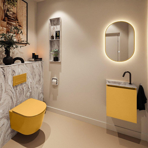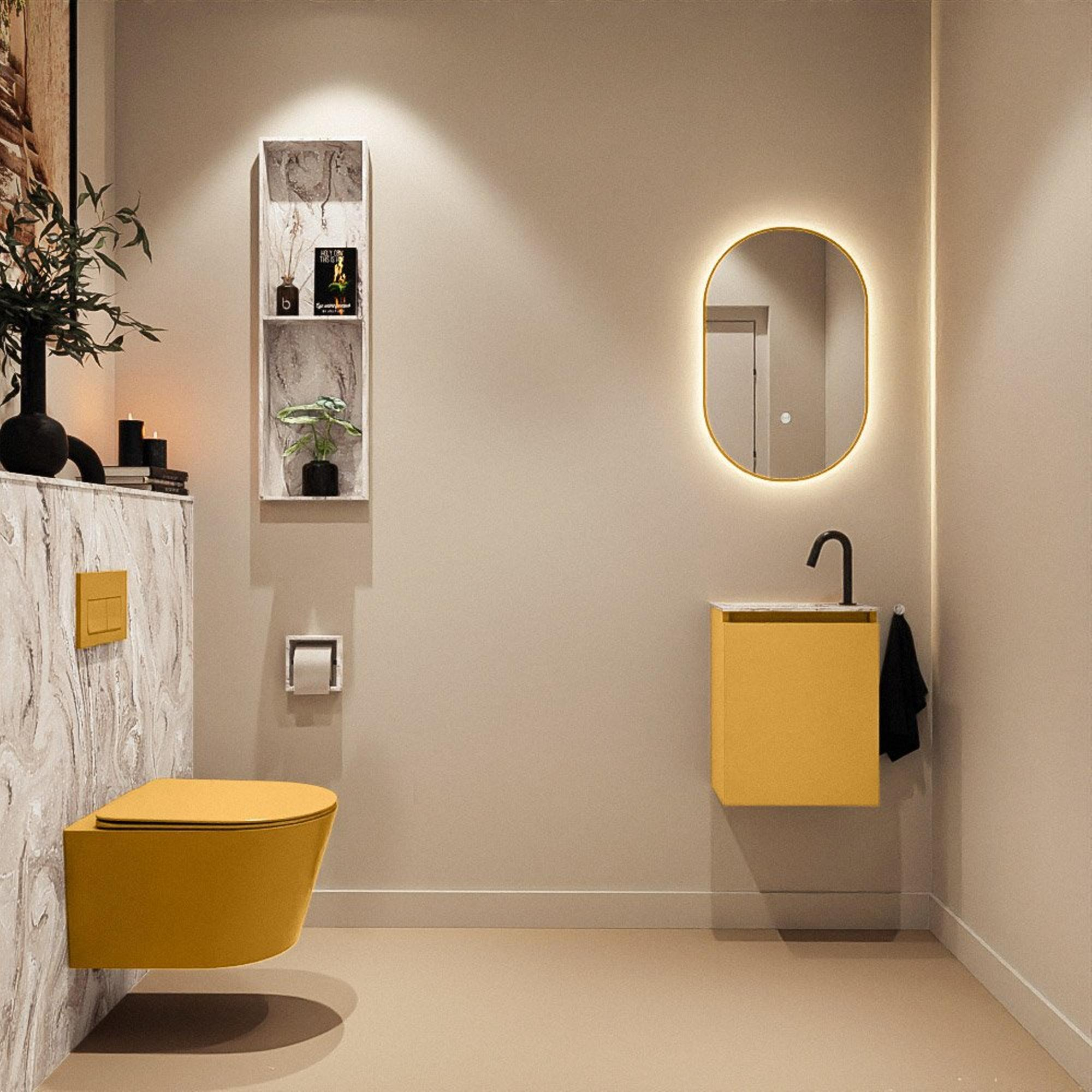 La chaleureuse teinte ocre du meuble, combinée au plan en solid surface couleur marbre et au lavabo glace, donne immédiatement à vos toilettes une allure luxueuse et personnalisée. L’ocre s’accorde à merveille avec des robinets et accessoires noirs, laiton ou chromés, mais aussi avec des carreaux clairs et sobres pour un style scandinave ou un look hôtel moderne. L’accent marbre du plan crée une apparence chic et intemporelle, tandis que les lignes épurées de l’armoire et du lavabo gardent l’ensemble calme et harmonieux. Ainsi, avec un seul meuble compact, vous créez un véritable point de mire dans vos toilettes, sans que cela ne devienne trop chargé ou criard.