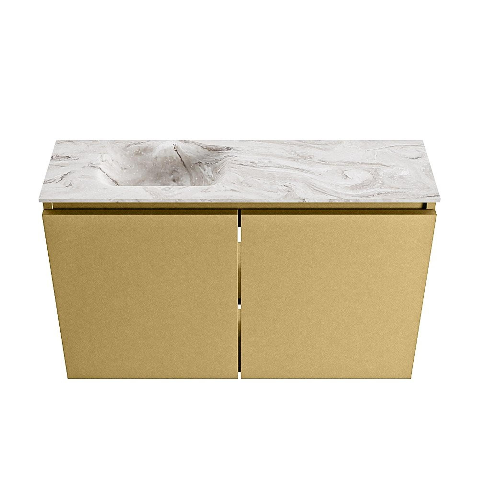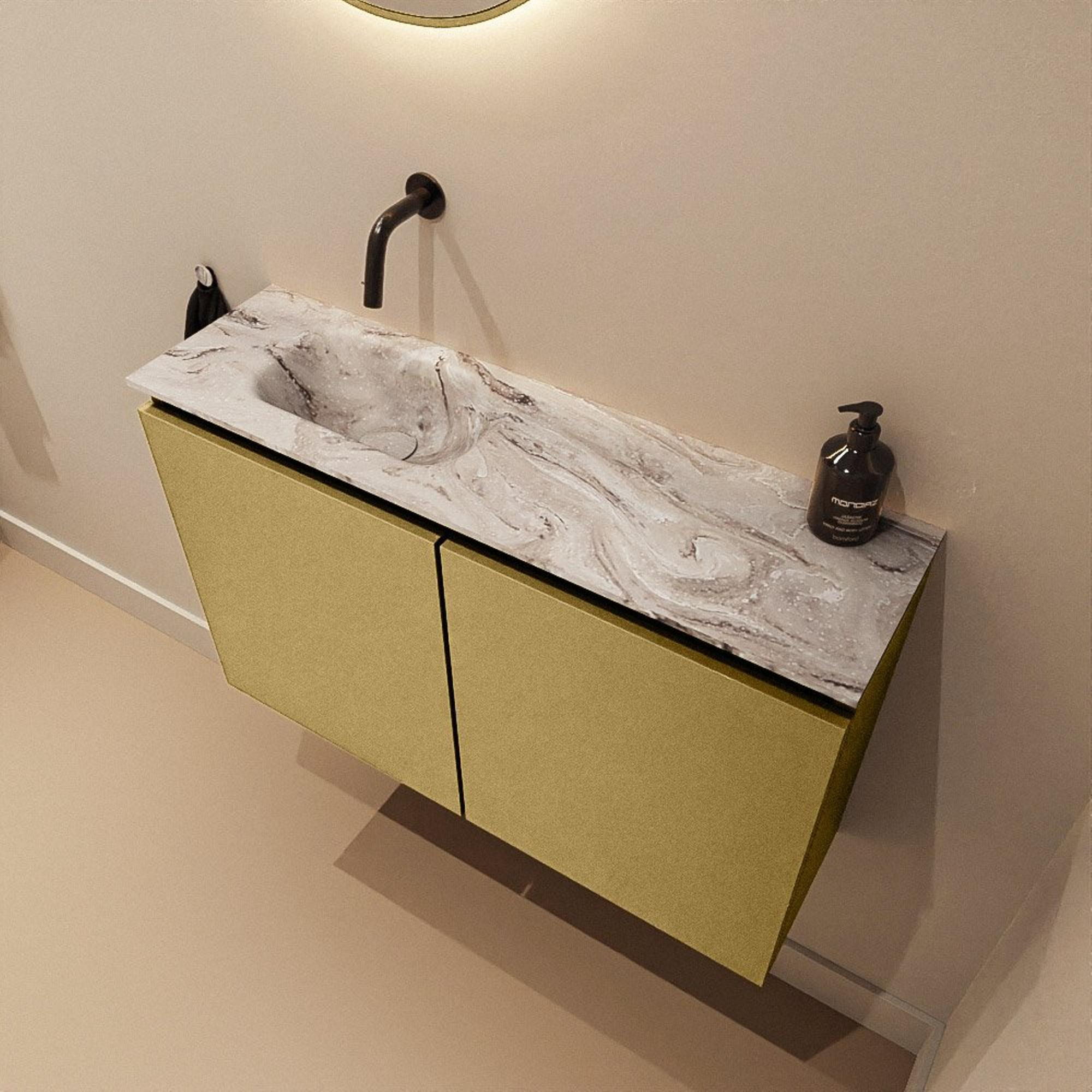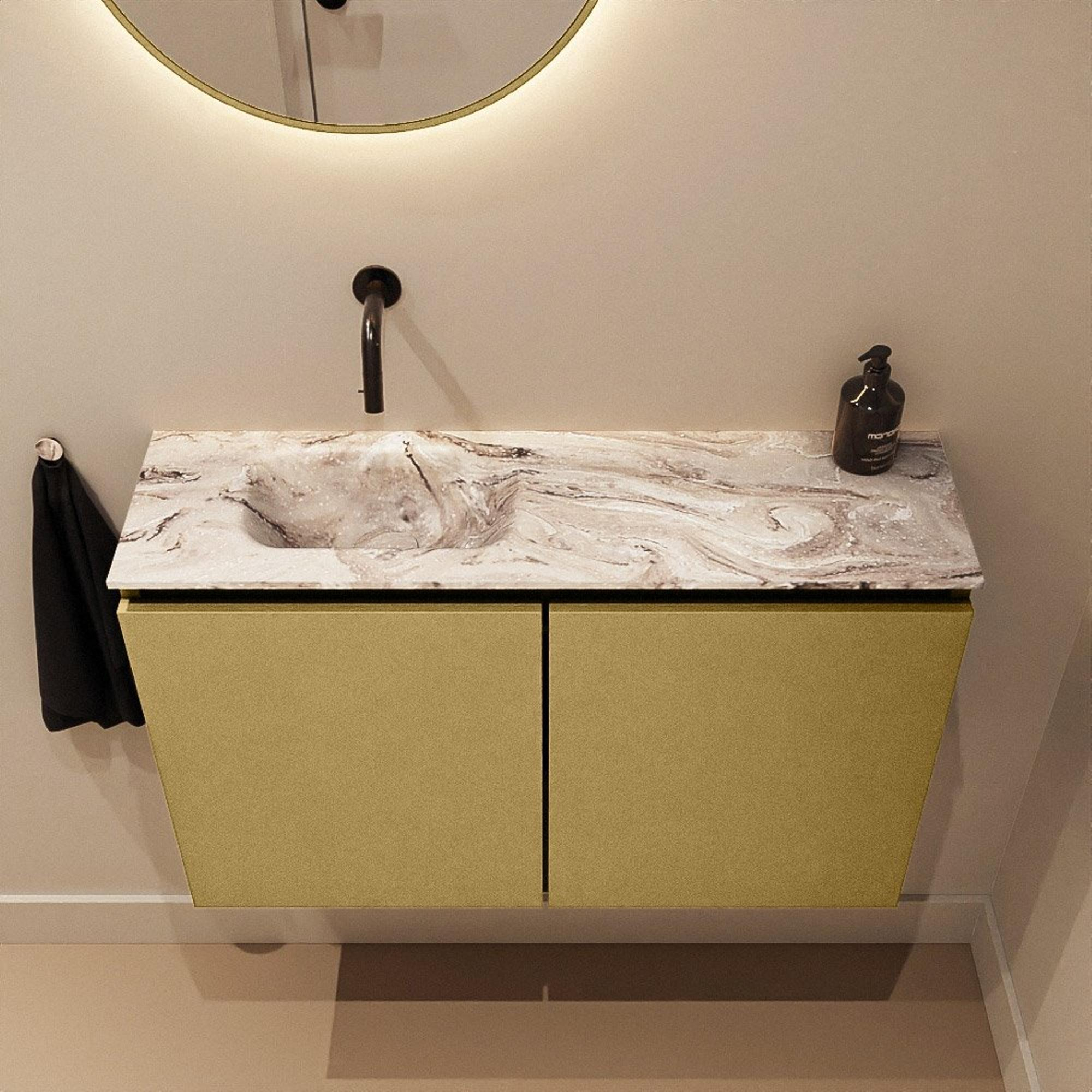 Vous recherchez un meuble compact et élégant qui apporte une touche de luxe même dans un petit espace WC ou sur un mur de salle de bains étroit ? Alors ce meuble WC peu profond est un choix judicieux. Avec une largeur de 80 cm et une profondeur de seulement 23 cm, vous créez un véritable espace de lavage sans compromettre le passage. La combinaison d’un meuble doré et d’un lavabo aspect marbre dans une teinte chaude glacée s’intègre parfaitement dans les intérieurs modernes et design, mais apporte également plus de classe à un style classique ou hôtel chic. Grâce au montage en saillie et à l’agencement bien pensé, ce meuble est idéal pour ceux qui souhaitent un look épuré et ordonné, avec suffisamment d’espace de rangement derrière les portes et un beau lavabo sans joint ni trou de robinet. Une solution élégante et pratique si vous accordez de l’importance au confort, à l’hygiène et au design.