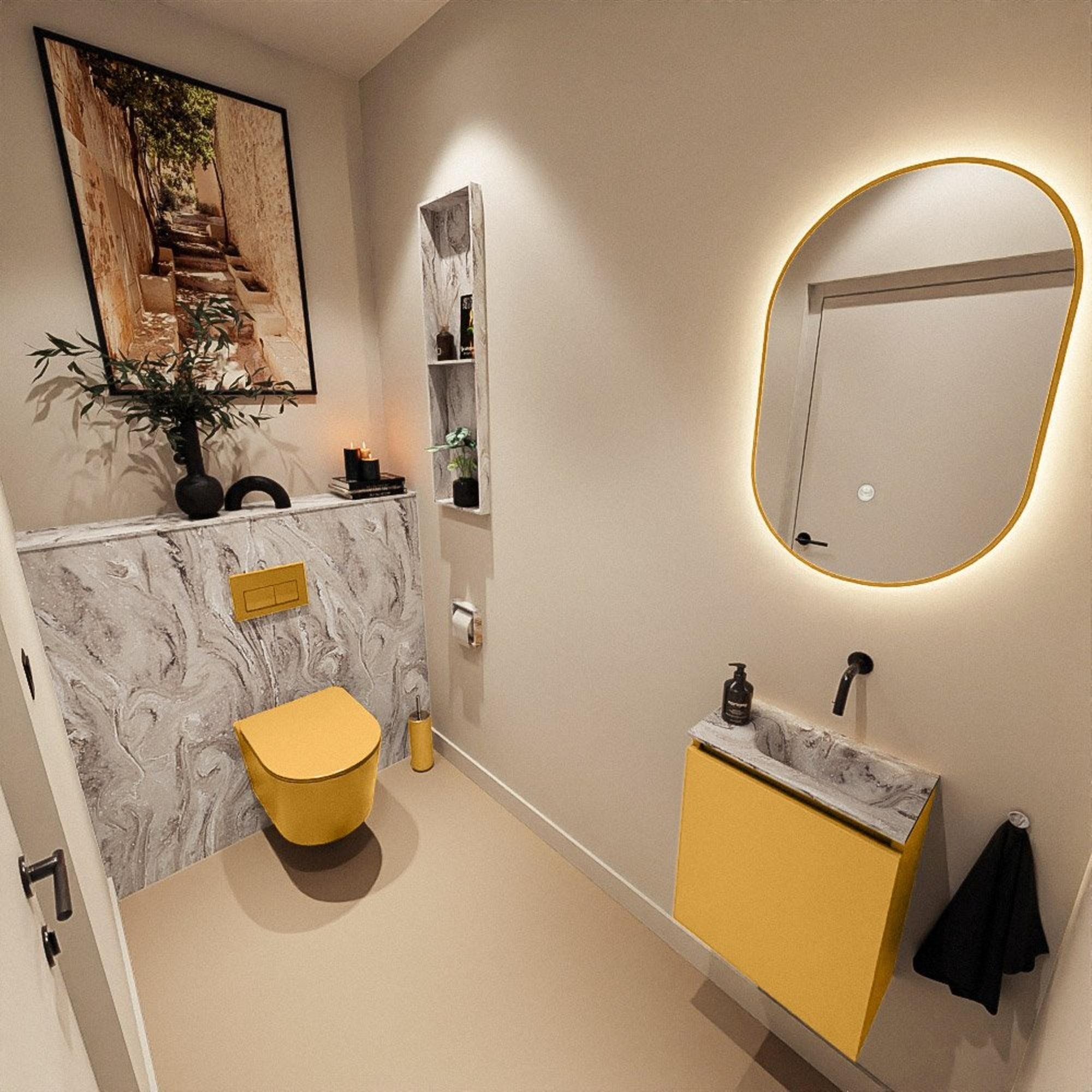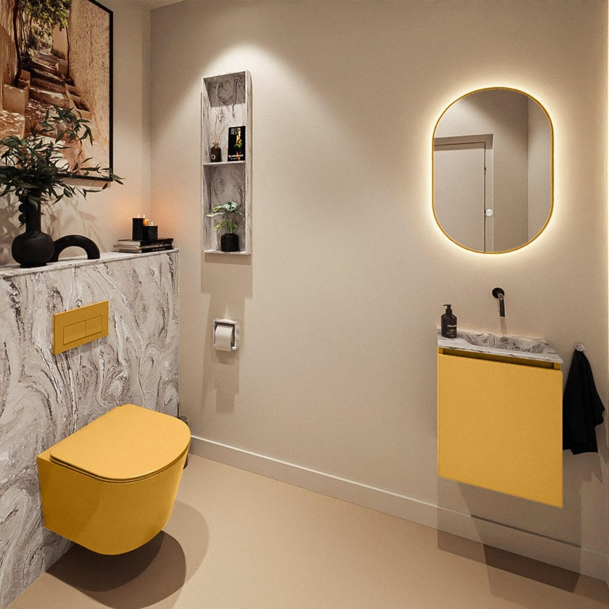 Si vous recherchez un meuble compact mais élégant pour vos toilettes ou une petite salle de bains, c’est un choix judicieux. Grâce à sa faible profondeur, il s’intègre facilement dans les espaces étroits, tout en vous offrant un lavabo complet pour vous laver rapidement les mains ou remplir un verre. La chaleureuse couleur ocre crée immédiatement une ambiance agréable, particulièrement mise en valeur dans les intérieurs modernes ou dans des toilettes où vous souhaitez un peu plus de cachet. Grâce à la combinaison bien pensée du meuble et du lavabo, vous profitez d’un espace de rangement pratique derrière une porte, sans que la pièce ne paraisse chargée. Cela rend ce meuble idéal pour ceux qui veulent combiner fonctionnalité, design et confort dans une configuration compacte, par exemple dans des toilettes sous l’escalier ou une deuxième, plus petite salle de bains.