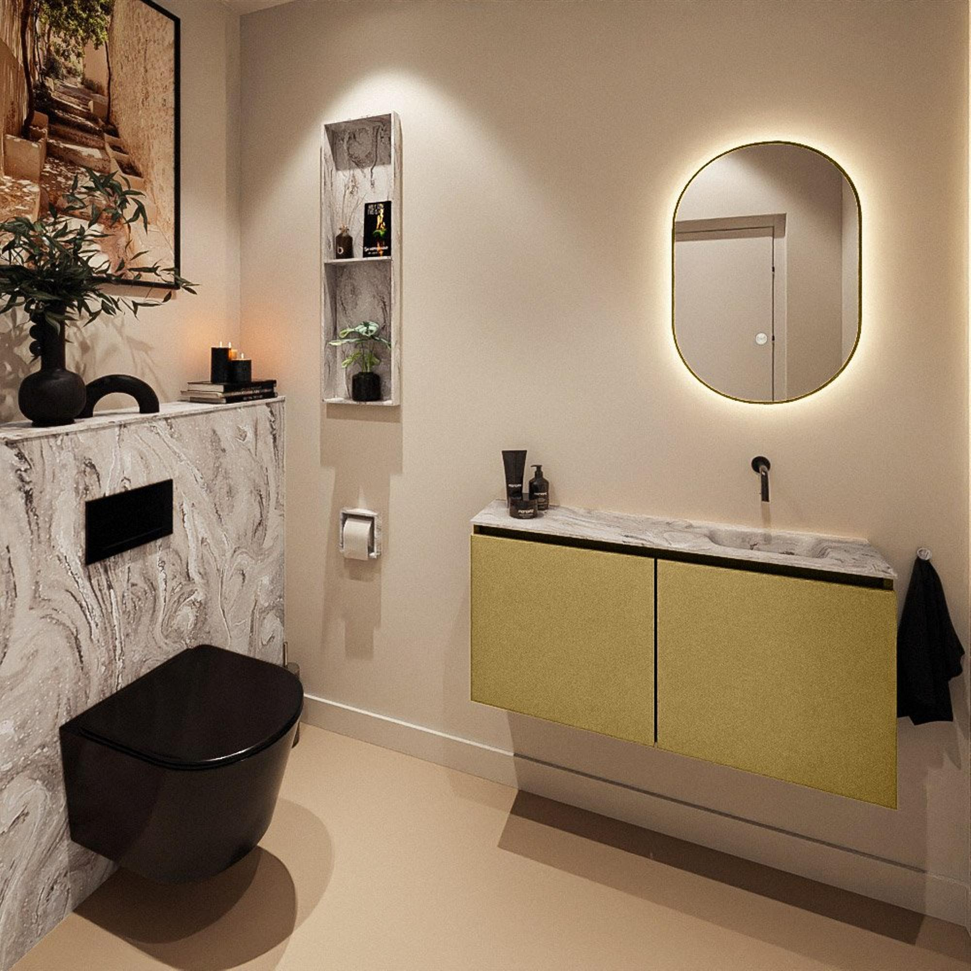 La teinte dorée Oro donne immédiatement à votre espace WC un aspect haut de gamme, presque de boutique. En combinaison avec le plan de couleur marbre et le lavabo Glace, il se crée un contraste subtil entre chaleur et fraîcheur, ce qui permet au meuble de bien s’intégrer aussi bien avec des carreaux muraux clairs que foncés. Les lignes modernes et épurées s’accordent parfaitement avec des tendances telles que l’hôtel chic et le luxe moderne, tout en restant suffisamment neutres pour rester belles pendant des années, même si vous changez parfois d’accessoires. Pensez à des robinets et accessoires noirs, dorés ou couleur inox : cette combinaison de couleurs est étonnamment polyvalente. Vous transformez ainsi un espace souvent oublié de la maison en une carte de visite élégante qui s’accorde parfaitement avec le reste de votre intérieur.