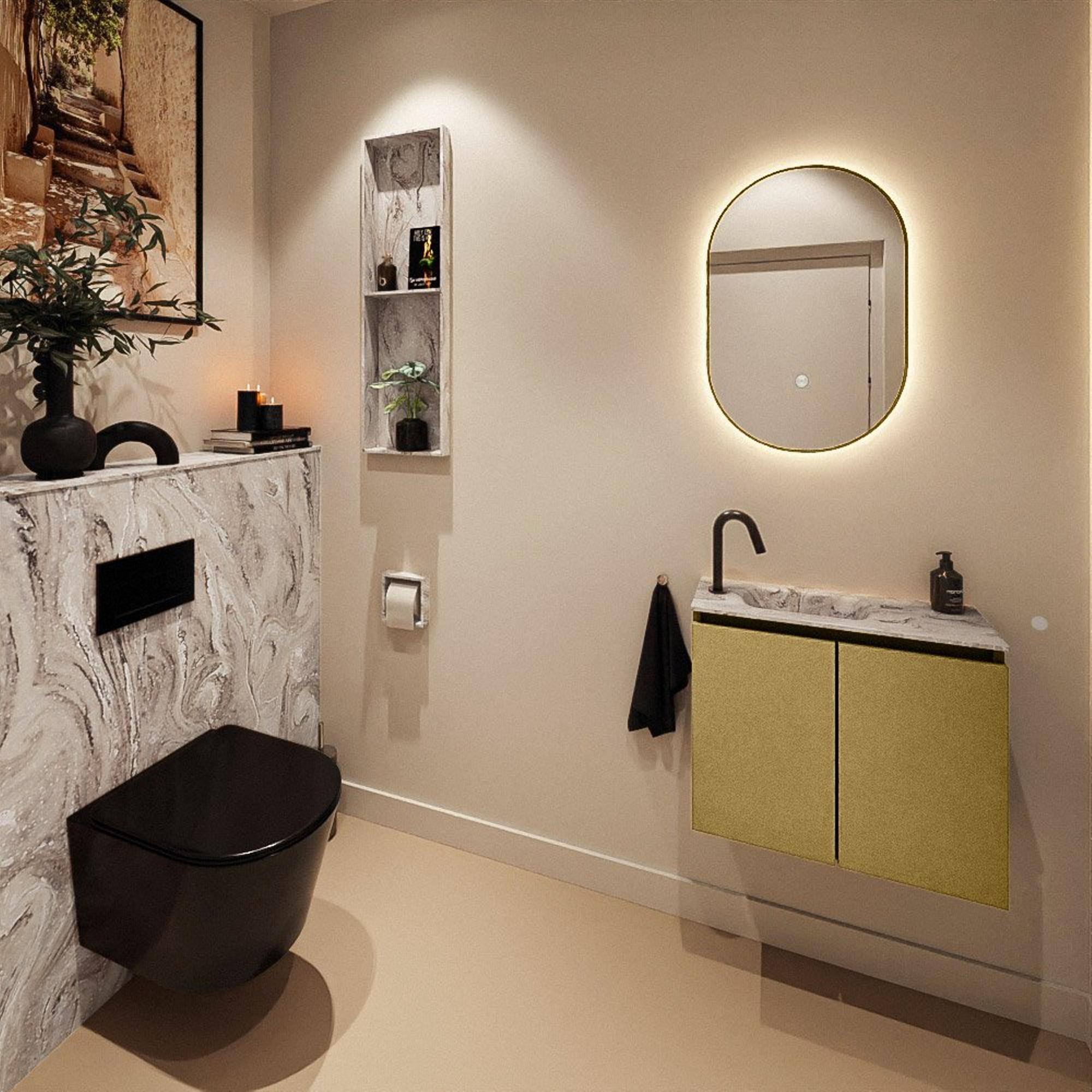 La couleur dorée (Oro) combinée à l’accent marbre du plan de travail crée un effet chic digne d’un hôtel, même dans un petit espace. Les façades épurées et sans poignées s’intègrent parfaitement dans un style d’intérieur moderne ou luxueux et se marient très bien avec des robinets et accessoires noirs, dorés ou chromés. Avec une largeur de 60 cm, le meuble paraît généreux, tandis que la profondeur limitée ne gêne pas la zone de passage dans vos toilettes ou votre salle de bains. Vous obtenez ainsi avec un seul meuble à la fois un véritable élément accroche-regard et une solution qui donne une impression d’espace.