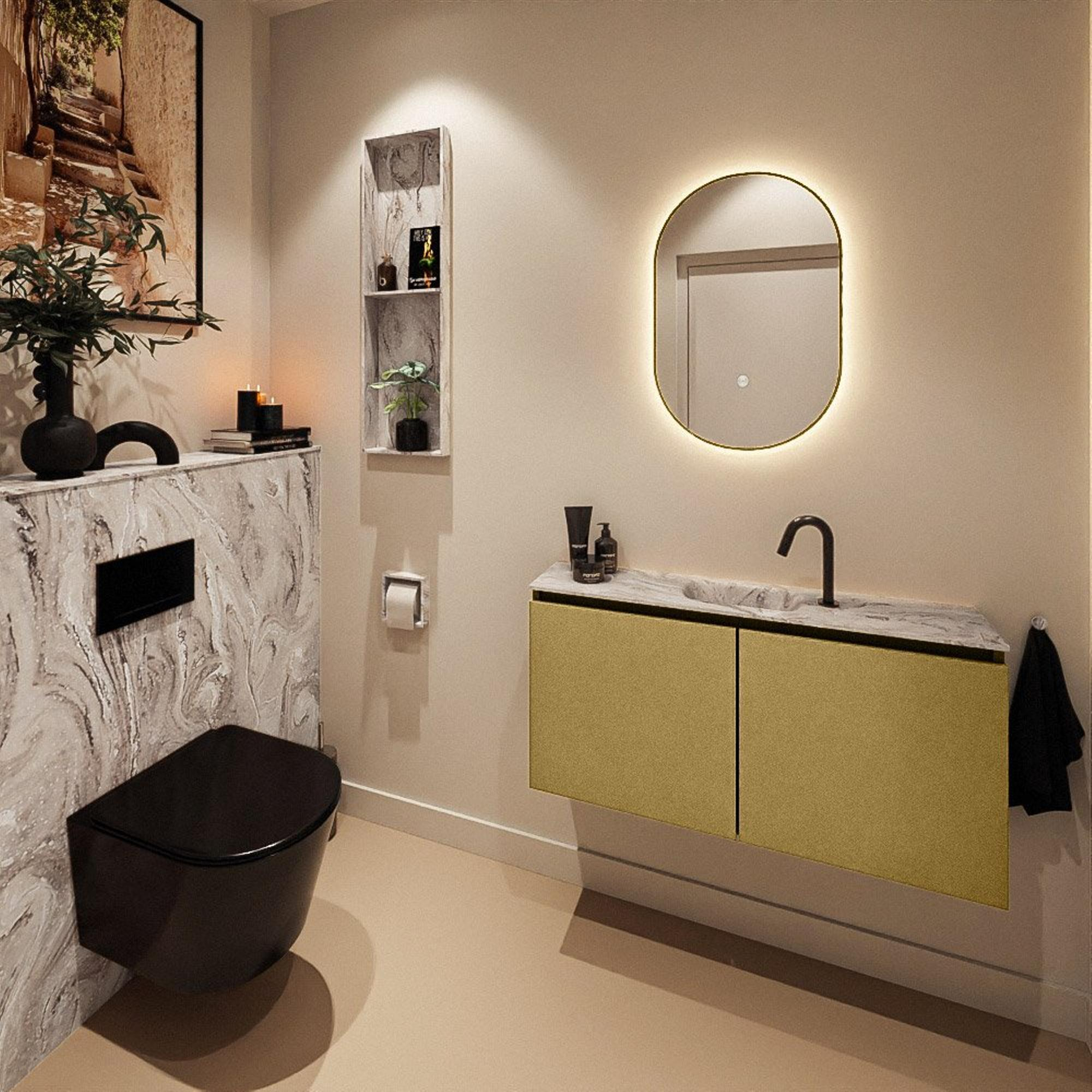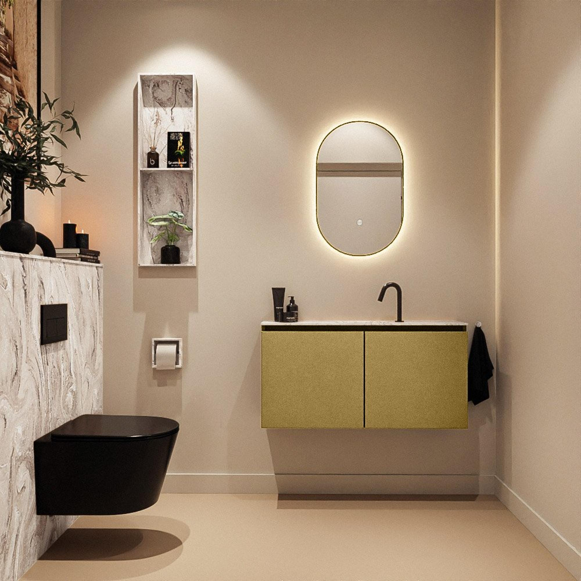 La couleur dorée du meuble (Oro), combinée au plan aspect marbre et au lavabo Glace, donne immédiatement à vos toilettes une apparence luxueuse et chaleureuse. Cette combinaison de couleurs s'intègre parfaitement dans les intérieurs modernes et hôtel chic, mais crée également un contraste saisissant dans une salle de bains industrielle et robuste avec des carreaux foncés. Comme le meuble est sans poignées, la façade reste épurée et linéaire, sans interruption visuelle. La couleur est ainsi pleinement mise en valeur et l'espace paraît plus grand et plus ordonné. Même dans les petites toilettes, vous pouvez ainsi créer un véritable élément accroche-regard, sans que cela ne paraisse chargé ou encombré.