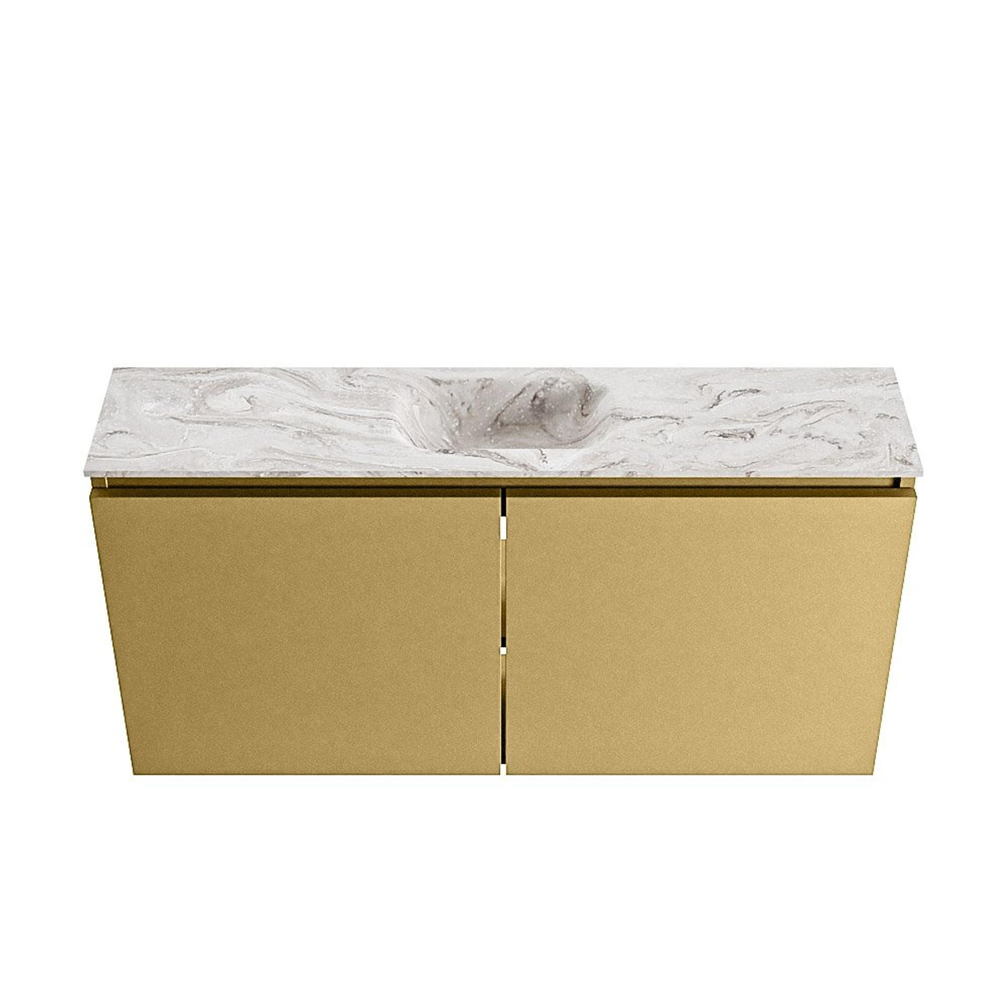 - Combinaison élégante d'un meuble doré (Oro) avec plan aspect marbre et lavabo Glace pour une apparence luxueuse.