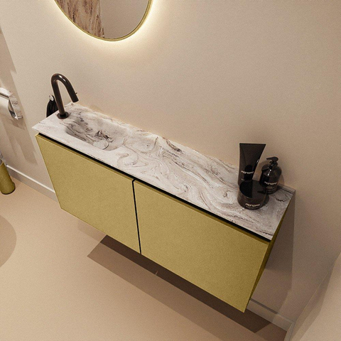 Vous recherchez un meuble de toilette luxueux qui prend peu de place tout en offrant une allure haut de gamme ? Alors cette combinaison d'un meuble fin avec lavabo intégré est un choix judicieux. La faible profondeur le rend idéal pour un WC ou une salle de bains compacte, tandis que la largeur généreuse de 100 cm crée un mur qui paraît plus large. Grâce au design moderne, au lavabo aspect marbre et à la chaleureuse teinte dorée, ce meuble s'intègre parfaitement dans des intérieurs élégants et contemporains. Il est particulièrement adapté si vous souhaitez créer un effet de style dans vos toilettes, sans faire de compromis sur la fonctionnalité et le confort d'utilisation au quotidien.