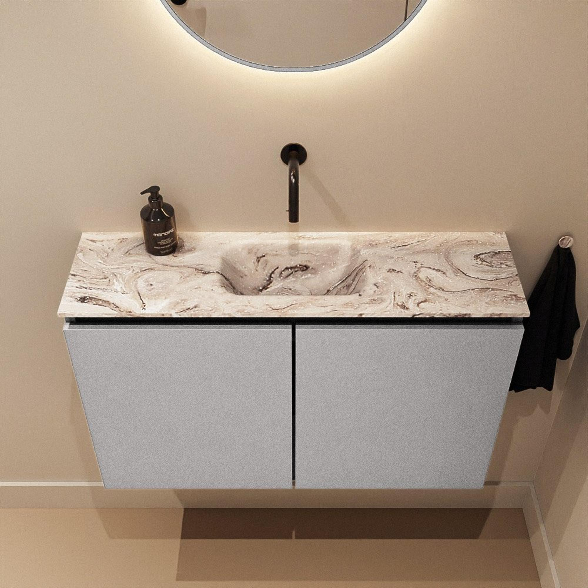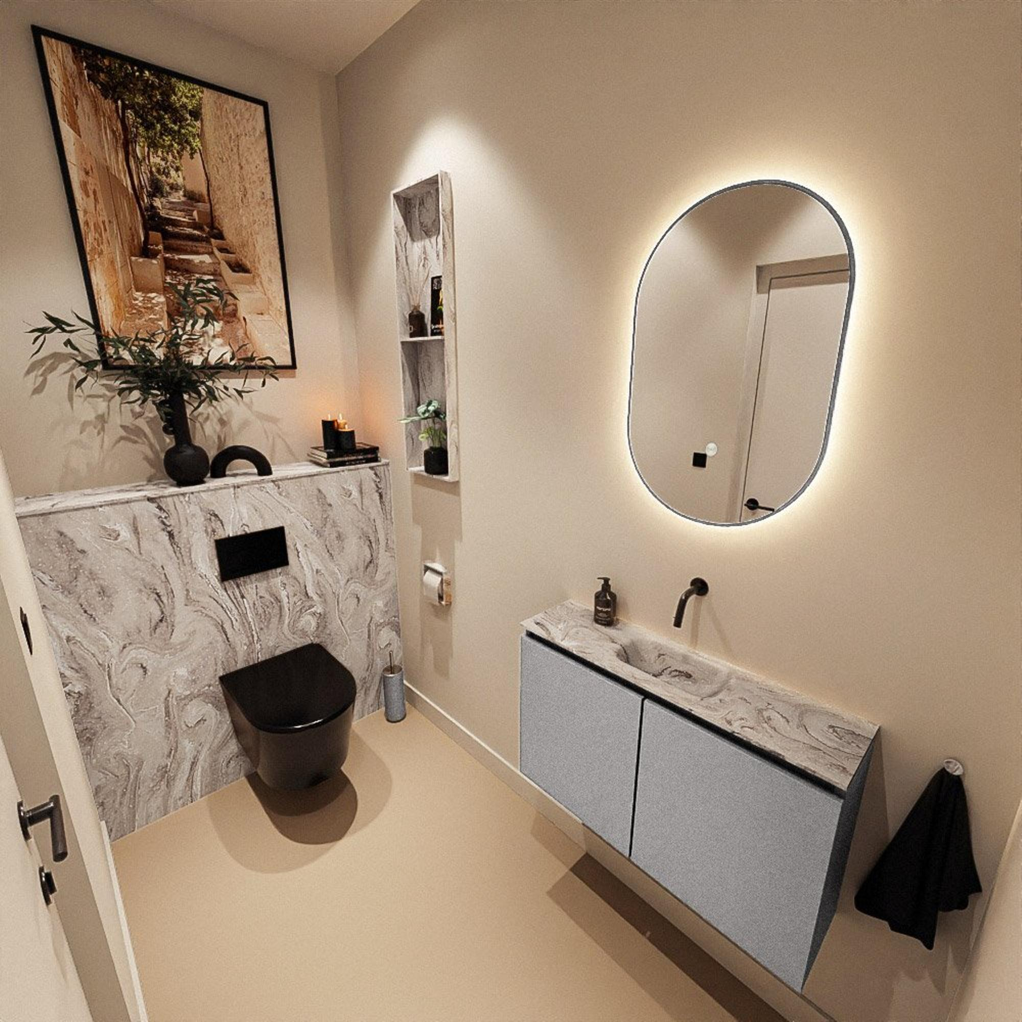 La couleur Plata confère au meuble une douce teinte de gris moderne qui se marie bien avec les articles sanitaires blancs comme avec les carrelages foncés ou les accents noirs. Le lavabo EDEN aspect marbre Glace y ajoute un détail élégant et luxueux, sans que l’ensemble ne devienne trop chargé. Grâce aux façades sans poignées, le jeu de lignes reste épuré et minimaliste ; aucune poignée saillante n’est visible, ce qui est non seulement plus esthétique, mais aussi plus pratique dans un espace étroit. Cela rend le meuble particulièrement adapté si vous souhaitez créer une atmosphère chic façon hôtel ou un style design, même dans un petit WC. Associez-le à un mitigeur posé élancé ou à un robinet mural épuré pour un ensemble complet et harmonieux.