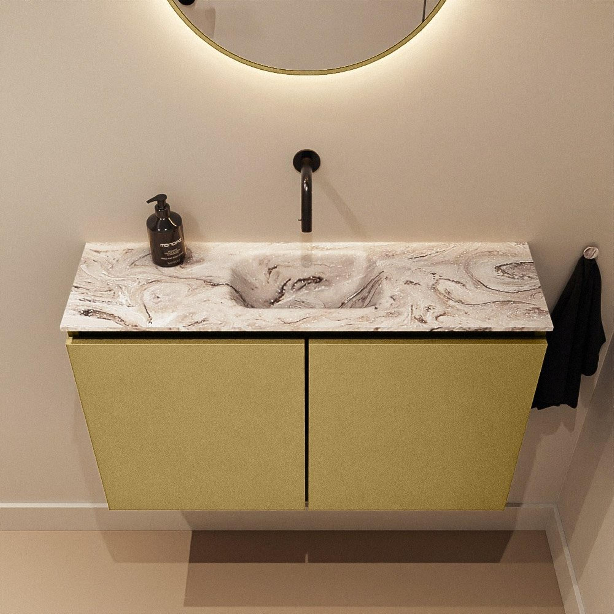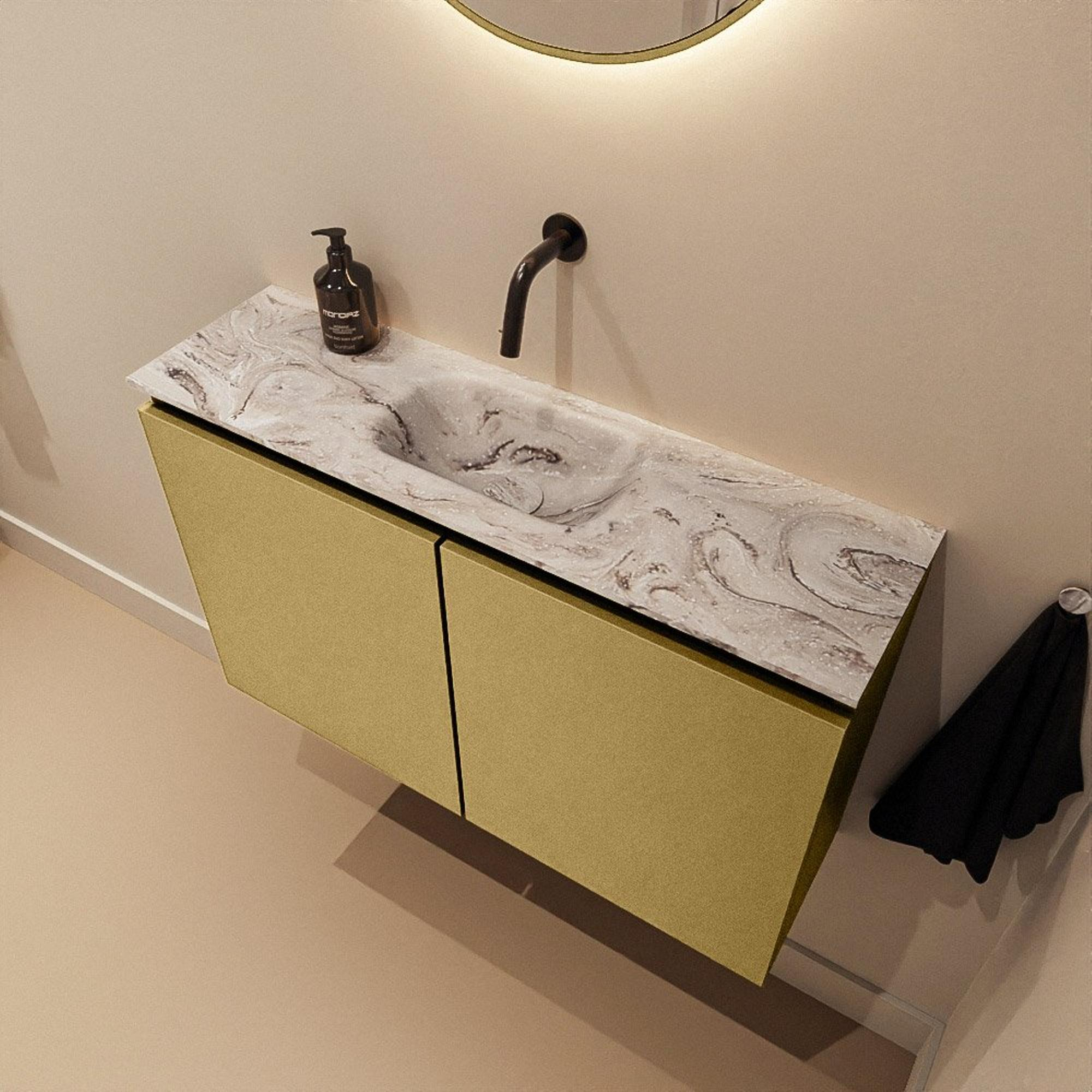 La couleur Oro, une élégante teinte dorée, confère à ce meuble une allure haut de gamme et chaleureuse. La façade et le caisson s’alignent harmonieusement, de sorte que l’ensemble reste sobre tout en constituant un véritable élément accroche-regard dans vos toilettes. Le lavabo en solid surface aspect marbre Glace renforce cette sensation de luxe : le veinage délicat du marbre se marie à merveille avec des robinets et accessoires dorés, mais reste également très chic avec du noir ou du métal brossé. Vous créez ainsi facilement un style hôtel chic ou design moderne. Grâce à la position centrale du lavabo, la symétrie de la pièce est bien équilibrée et vos toilettes paraissent immédiatement plus soignées et aménagées avec réflexion.