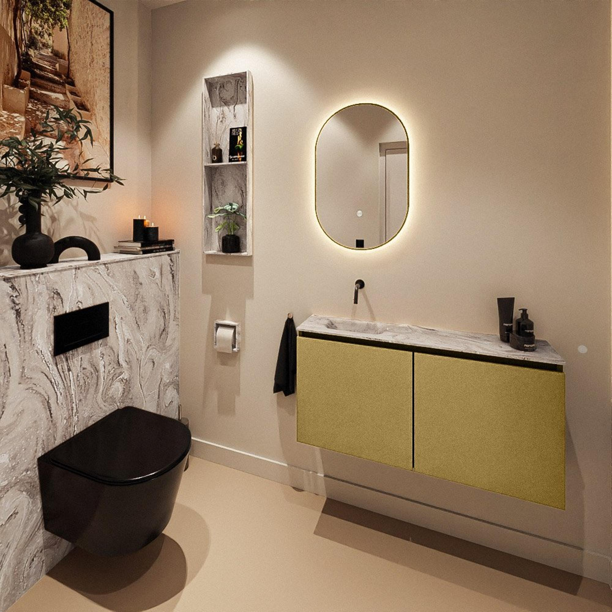 Ce meuble WC se distingue immédiatement par sa finition chic couleur or (Oro) en combinaison avec le plan de couleur marbre et la vasque intégrée. Les façades épurées sans poignée assurent une apparence minimaliste et haut de gamme qui s’intègre parfaitement dans un espace WC moderne ou luxueux. Grâce à la grande largeur de 100 cm, vous créez une ligne horizontale apaisante le long du mur, ce qui donne l’impression d’un espace plus vaste. La vasque Eden de couleur marbre en finition Glace apporte une touche chaleureuse et naturelle et se marie facilement avec des robinets et accessoires noirs, bronze ou justement couleur or. Vous pouvez ainsi décliner votre propre style jusque dans les moindres détails et créer un bel ensemble harmonieux avec le reste de votre salle de bains ou de vos toilettes.