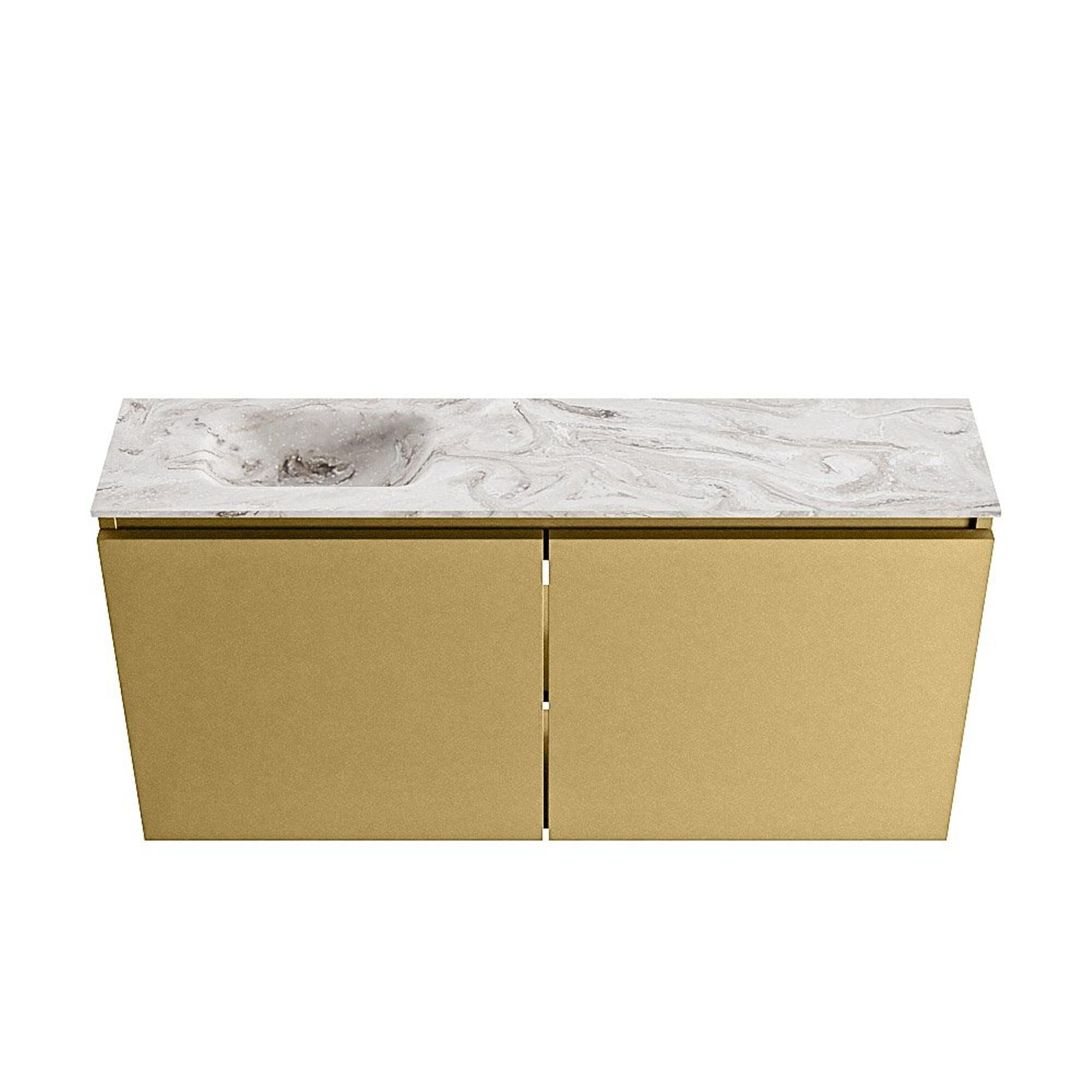 - Meuble bas couleur or (Oro) avec vasque Eden de couleur marbre en finition Glace pour une apparence luxueuse et hôtel-chic.