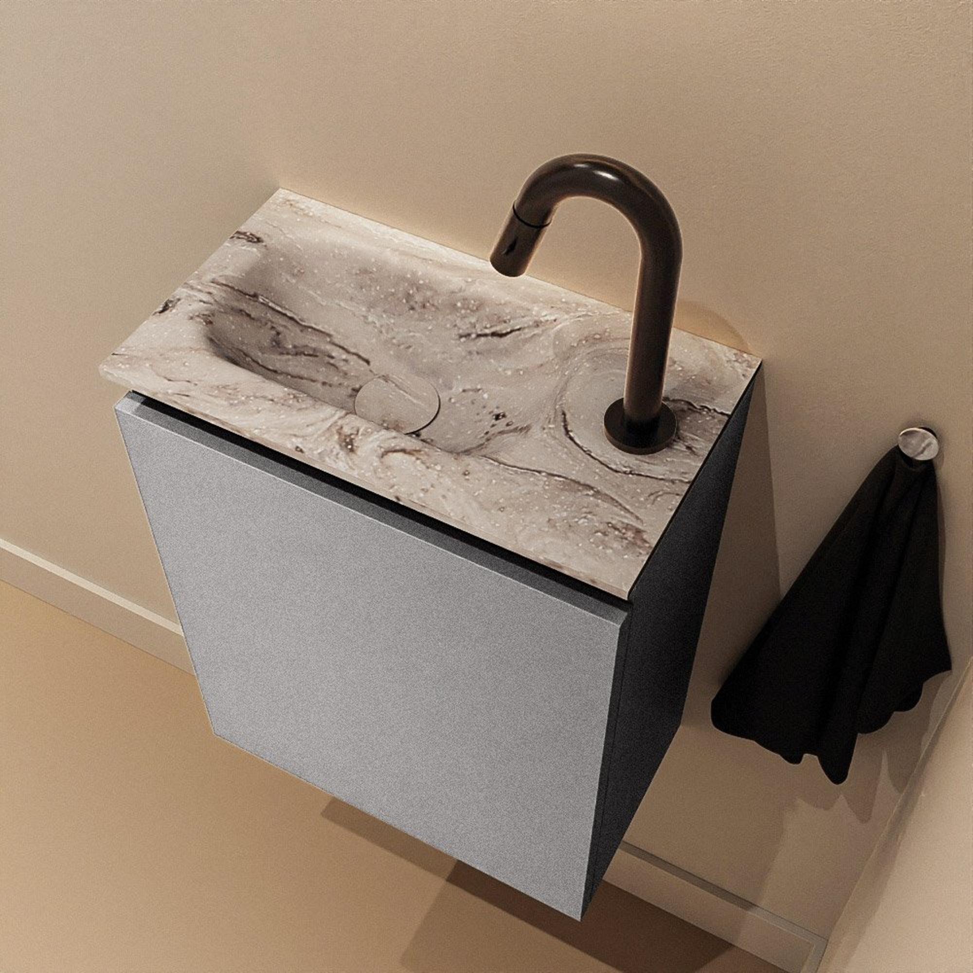 Si vous recherchez un meuble de toilettes compact, élégant et bien conçu pour vos WC ou une petite salle de bains, il s’agit d’un choix judicieux. Grâce à sa faible profondeur, il s’intègre sans effort dans les espaces étroits, tout en offrant un lavabo complet avec trou de robinet et un meuble pratique en dessous. La couleur moderne Plata se marie parfaitement avec des carreaux clairs comme foncés et s’intègre harmonieusement dans un style de salle de bains épuré et contemporain. La vasque asymétrique avec trou de robinet à gauche rend ce meuble idéal lorsque vous avez par exemple un WC suspendu ou une porte à proximité et que vous souhaitez optimiser l’espace disponible. Vous créez ainsi, avec un meuble relativement petit, une apparence soignée et luxueuse ainsi qu’un confort d’utilisation au quotidien.