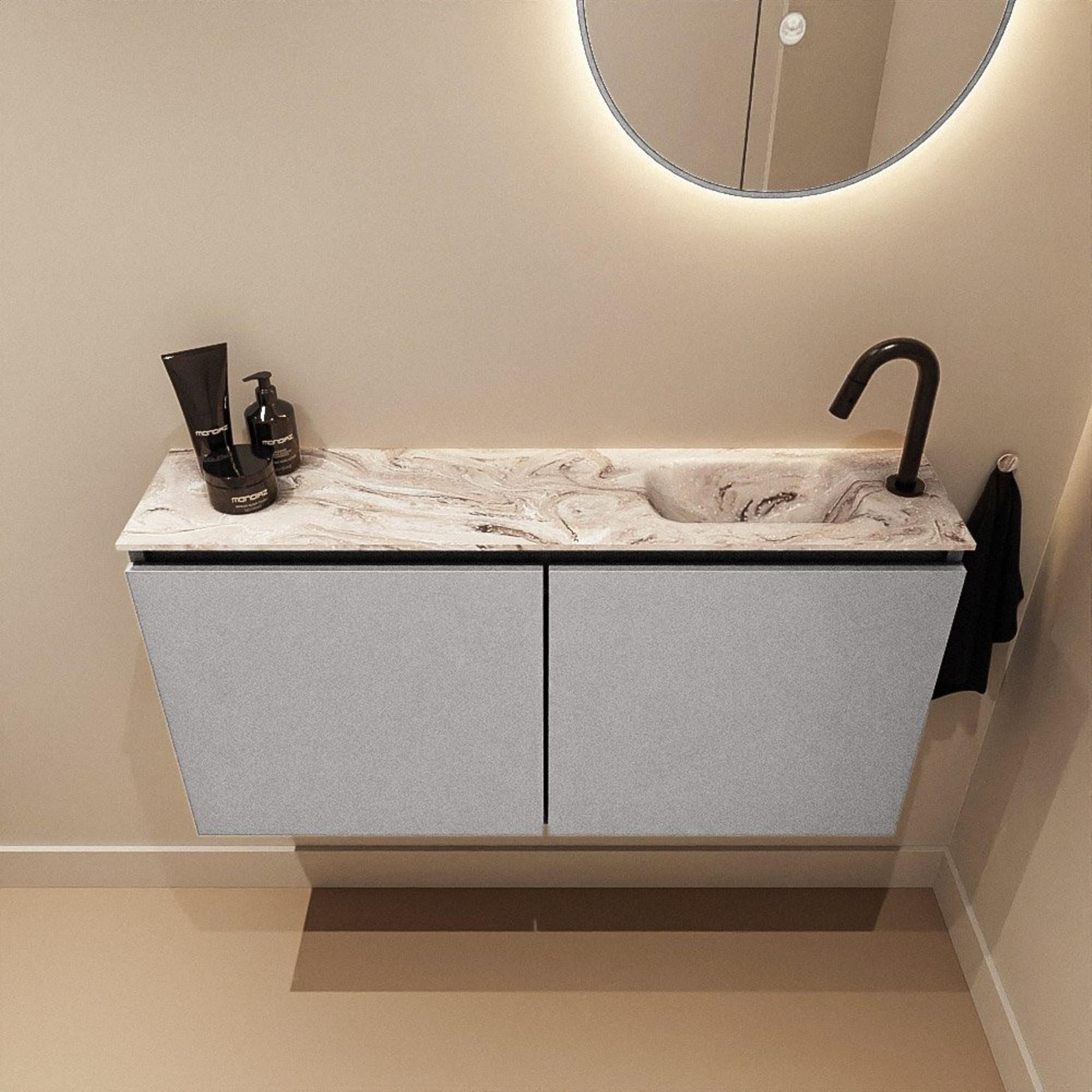 Avec une largeur de 100 cm et une profondeur de seulement 23 cm, ce meuble WC offre un lavabo généreux sans paraître massif. Ses dimensions peu profondes sont idéales pour les toilettes étroites ou les petites salles de bains où chaque centimètre compte, mais où vous voulez tout de même vous laver les mains confortablement sans vous cogner au meuble. Le lavabo est positionné à droite, ce qui vous offre, de l’autre côté, un espace de dépose supplémentaire pour le savon, un spray parfumé ou une décoration discrète. Grâce à la fixation murale, le sol reste dégagé, ce qui donne non seulement une impression de volume, mais facilite également le nettoyage sous le meuble. Vous combinez ainsi gain de place pratique et ensemble épuré et aérien.