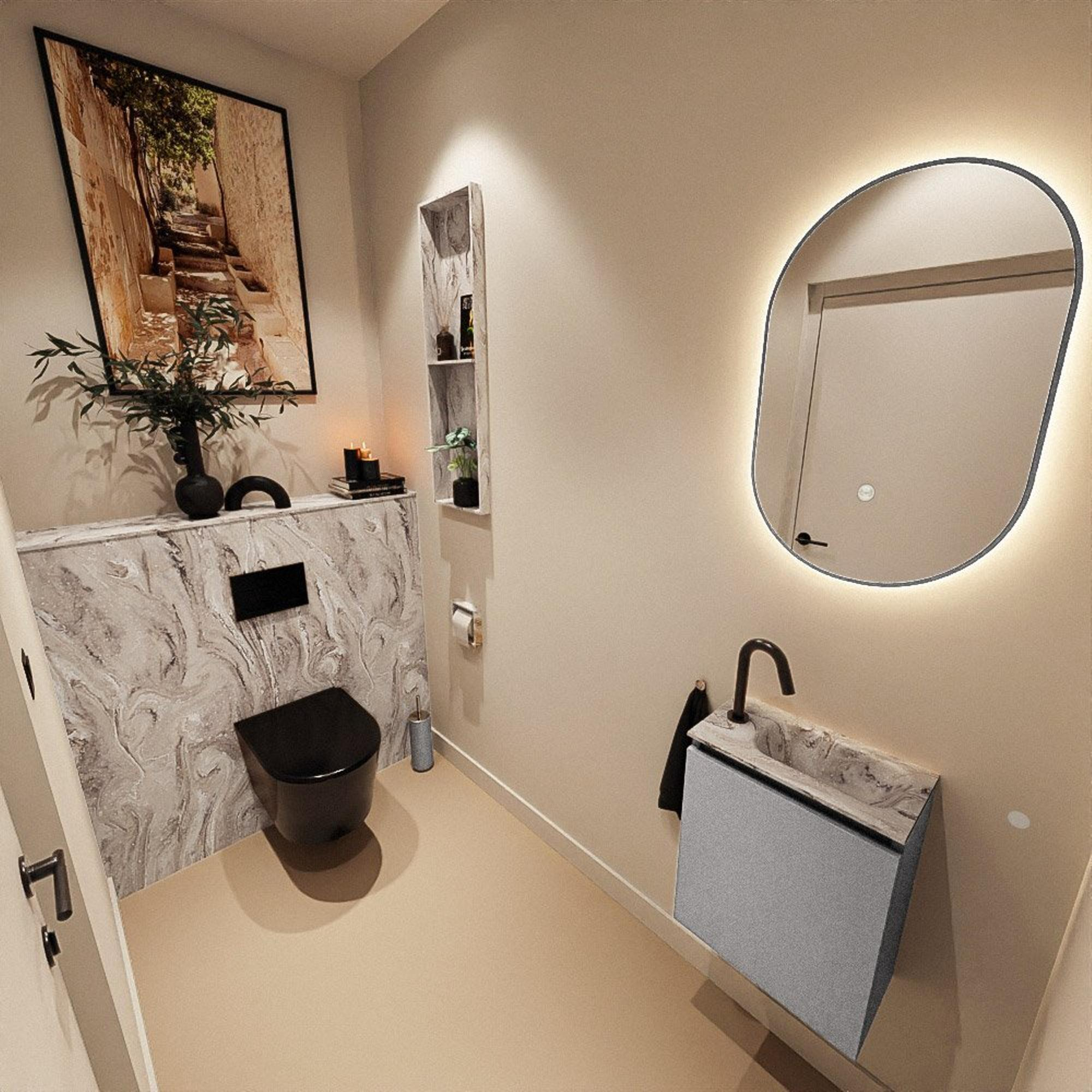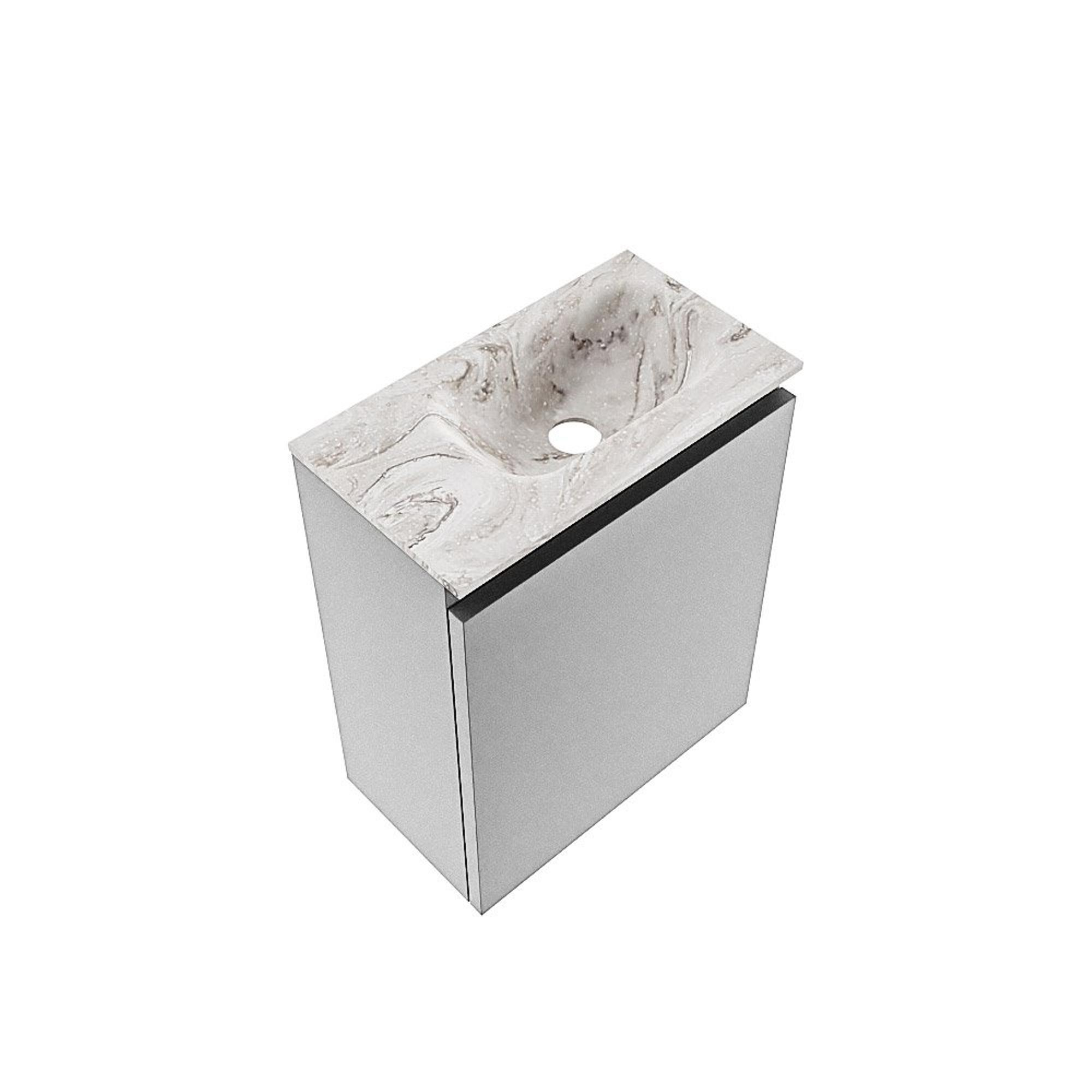 La couleur moderne Plata confère au petit meuble une apparence intemporelle et contemporaine qui se marie bien avec les carreaux aspect béton, blancs ou en pierre naturelle. Le lavabo Eden en solid surface marbré Glace ajoute une touche de luxe, donnant immédiatement à vos toilettes une apparence haut de gamme. Le contraste entre le meuble gris et la teinte marbrée claire du plan crée un ensemble élégant qui ne se démode pas facilement. Grâce à la façade minimaliste sans poignée, ce meuble s’intègre parfaitement aux intérieurs modernes et orientés design. Que vous visiez un style hôtelier épuré ou un look scandinave apaisant, ce meuble compact constitue une belle base.