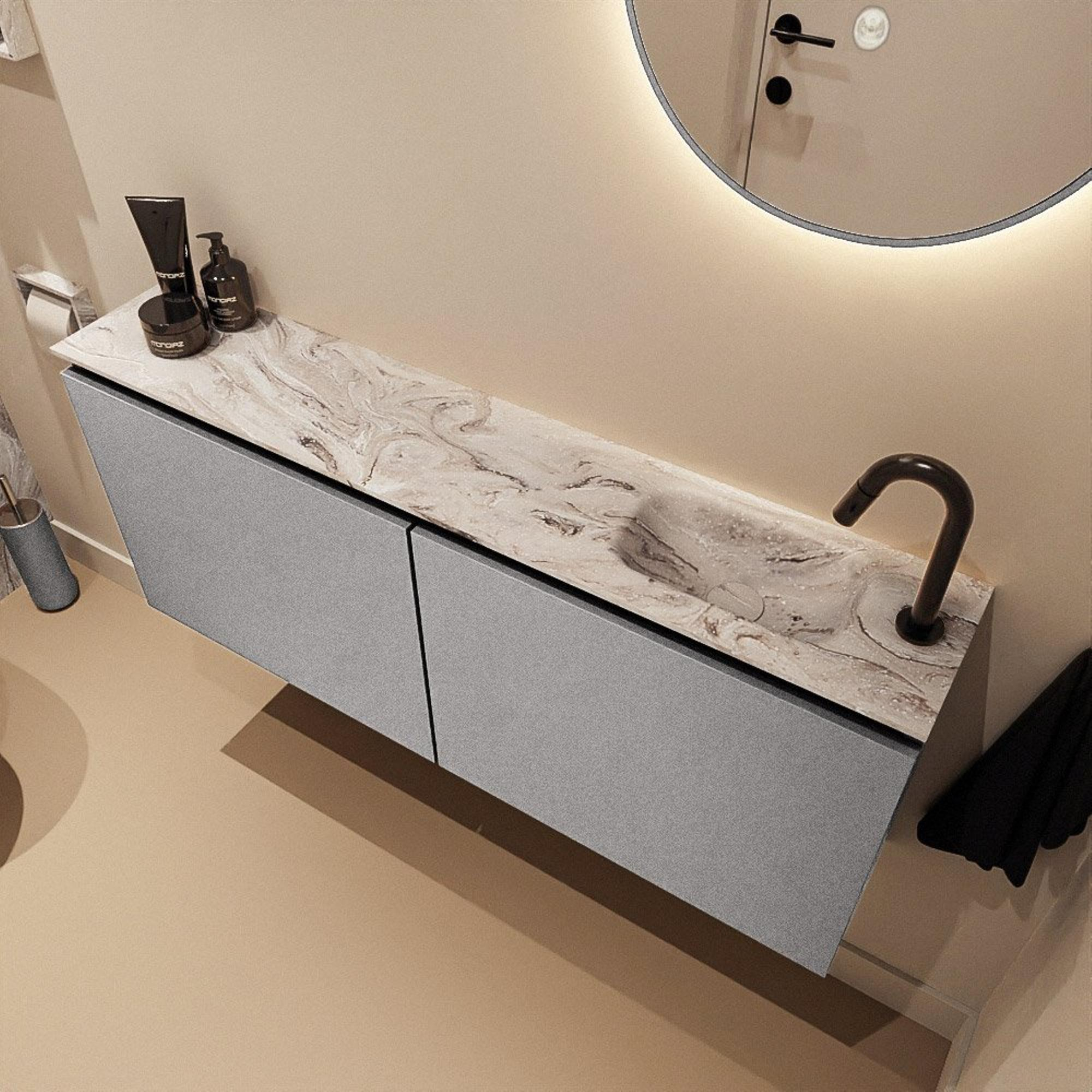 Ce meuble de toilettes compact et moderne est idéal si vous recherchez une apparence épurée et luxueuse dans un petit espace de toilettes ou une niche de salle de bains étroite. Grâce à sa faible profondeur, il s’intègre facilement dans les espaces compacts, tandis que le large plateau de 120 cm procure une sensation d’espace généreuse. La combinaison d’un lavabo en aspect marbre raffiné et d’une couleur de meuble grise élégante s’accorde parfaitement avec les intérieurs modernes et axés sur le design. Avec le lavabo sur le côté droit et un seul trou de robinet, ce meuble est particulièrement adapté si vous souhaitez créer une disposition claire, par exemple le long d’un mur avec une décoration supplémentaire ou un espace de rangement à gauche. Vous faites ainsi entrer chez vous une solution réfléchie et élégante, à la fois pratique et esthétiquement cohérente.