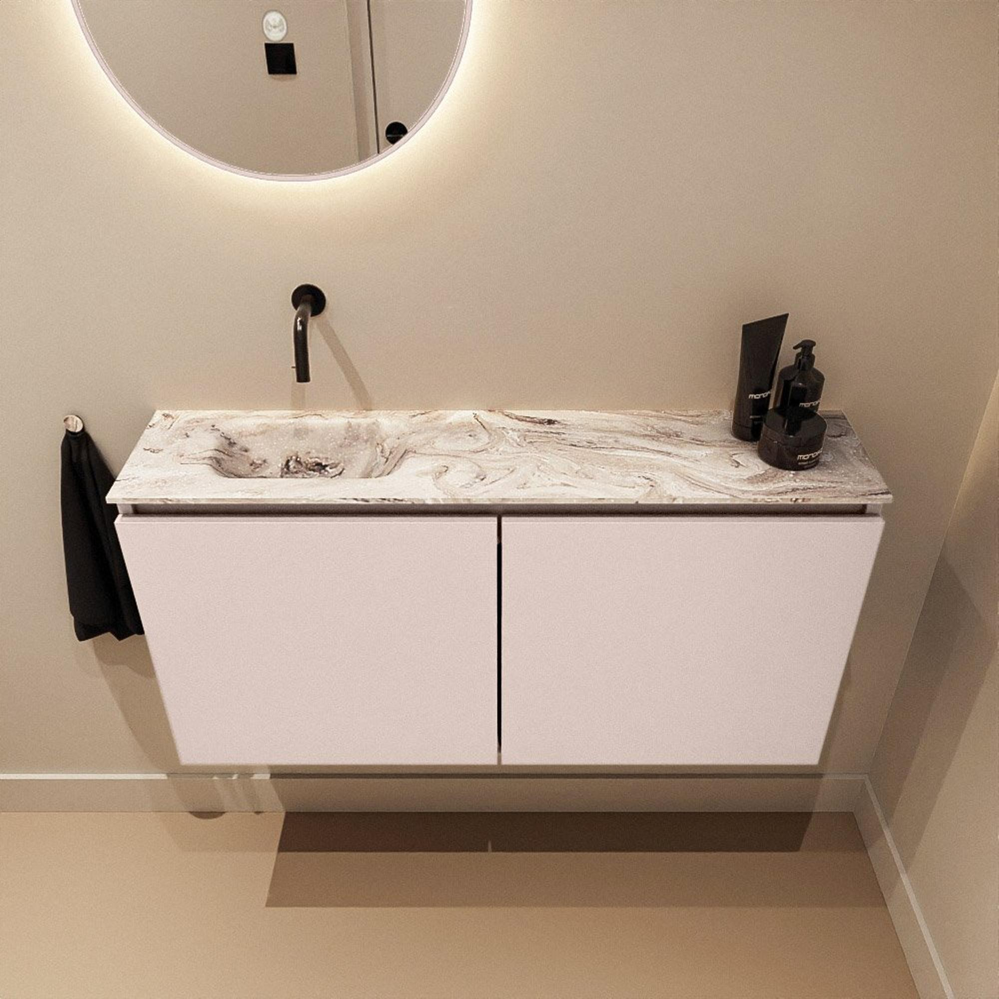 Si vous recherchez un meuble WC élégant qui prend peu de place mais dégage tout de même du luxe, alors cette solution compacte est un choix judicieux. Avec sa faible profondeur, il est idéal pour les toilettes, une petite salle de bains ou une niche étroite où chaque centimètre compte. La subtile teinte rose apporte une apparence douce et moderne, tandis que le plan aspect marbre avec lavabo intégré crée immédiatement une ambiance d’hôtel haut de gamme. Grâce aux façades épurées sans poignées, l’ensemble paraît calme et ordonné, parfait si vous visez un style moderne et minimaliste tout en conservant de la chaleur dans la pièce. Ce meuble convient parfaitement si vous recherchez une combinaison de design, de facilité d’utilisation et de confort pratique au quotidien, sans que l’espace ne paraisse plein et chargé.
