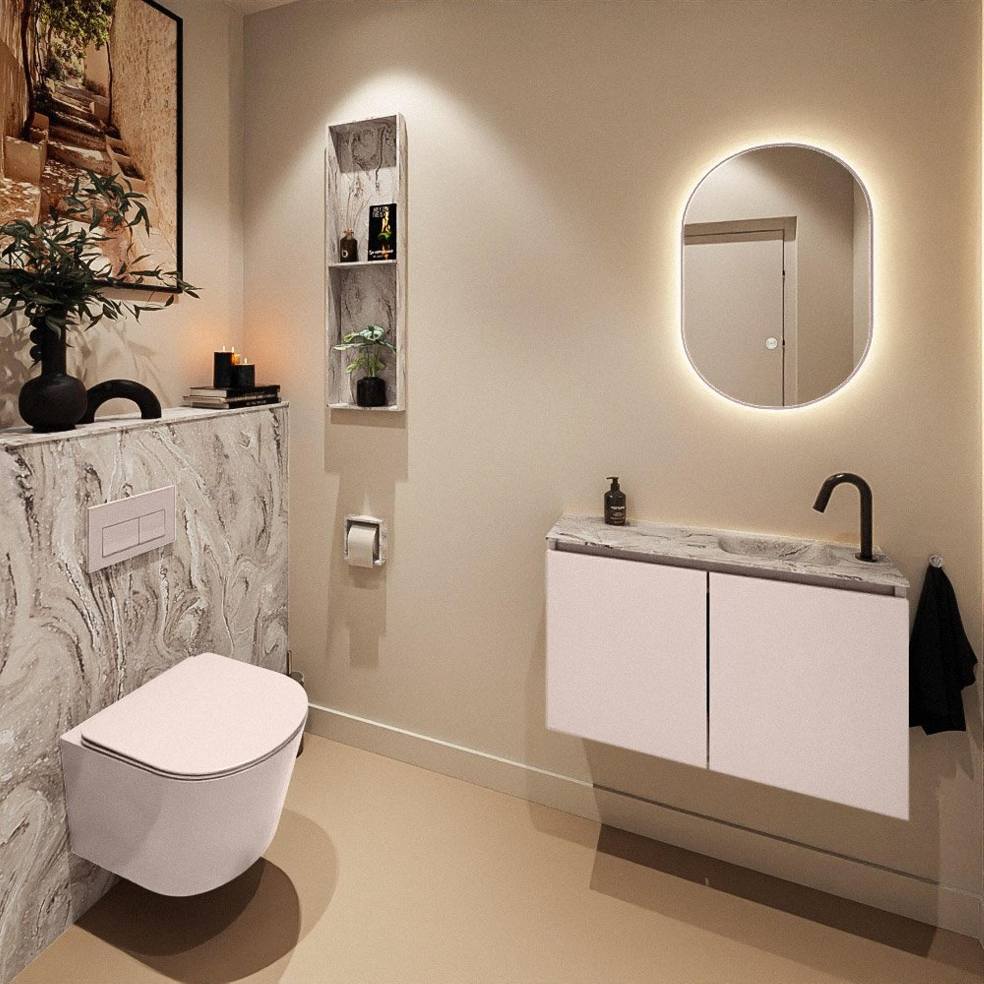 Avec une largeur de 80 cm et une profondeur de seulement 23 cm, ce meuble a été développé pour les espaces où vous disposez de peu de recul, mais où vous souhaitez tout de même pouvoir vous laver les mains confortablement. Le lavabo est intelligemment conçu avec une cuve intégrée sur le côté droit, ce qui vous offre un espace de rinçage suffisant sans que le meuble ne dépasse trop. Cela le rend particulièrement adapté aux toilettes de couloir étroites ou aux salles de bains où une profondeur standard serait tout simplement trop importante. Comme le meuble est suspendu, le sol reste dégagé et l’espace paraît immédiatement plus grand et plus aéré. Non seulement l’aspect est épuré, mais le nettoyage sous le meuble devient également beaucoup plus simple.