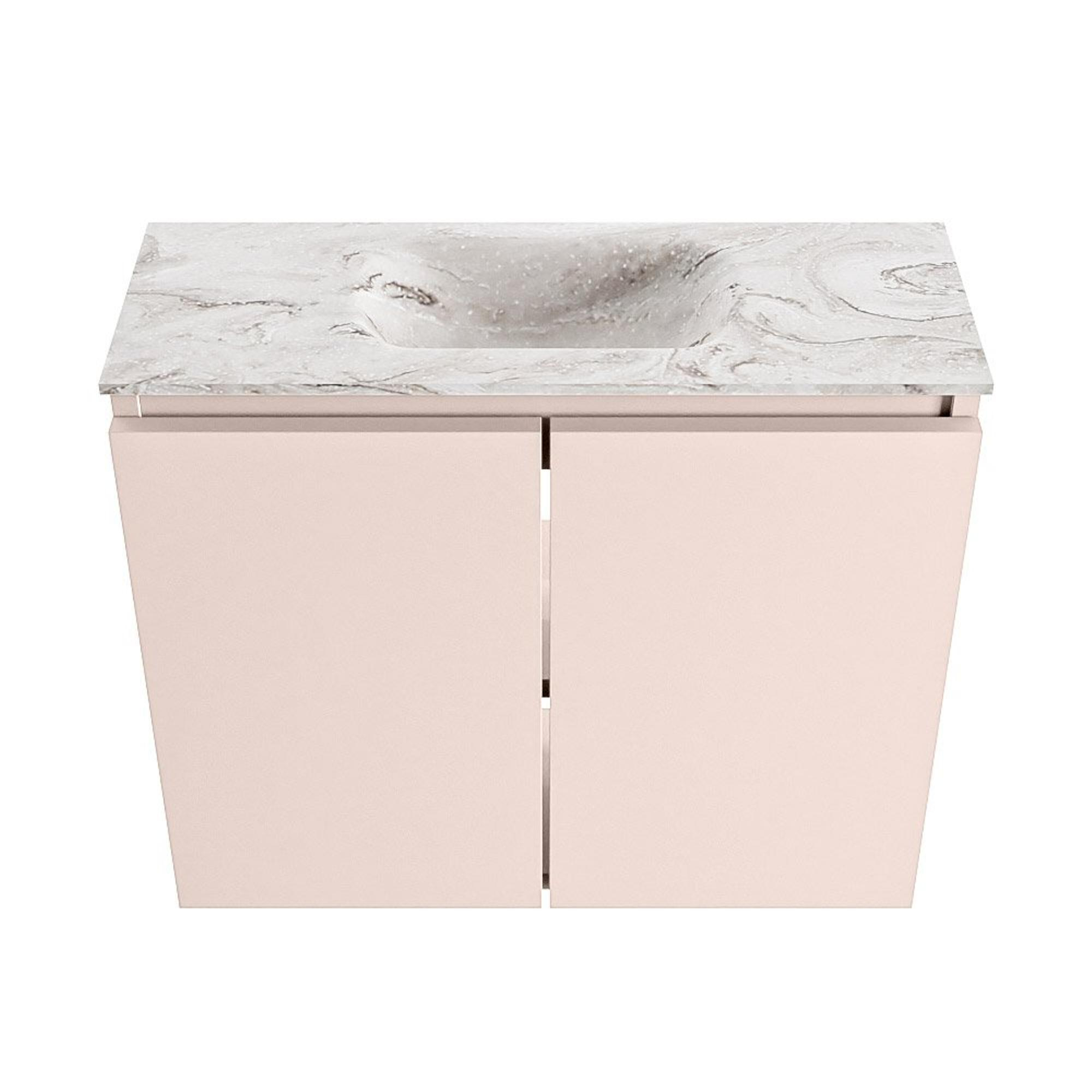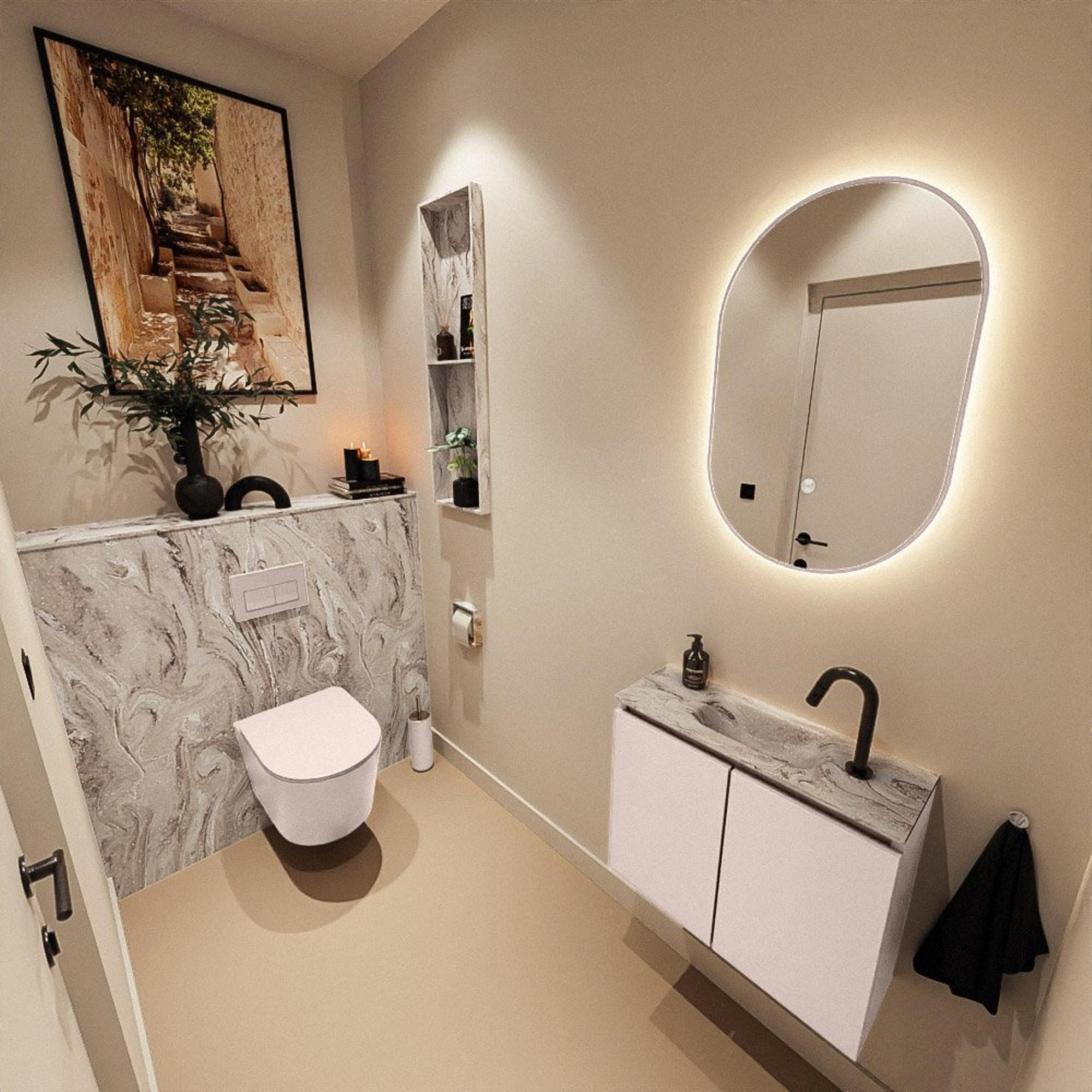 La douce couleur Rosee du meuble forme un magnifique contraste avec le plan couleur marbre en Glace, ce qui crée une allure haut de gamme, presque comme dans un boutique-hôtel. Le lavabo aspect marbre ajoute une touche de luxe, tandis que la palette de couleurs apaisante se marie facilement avec des carreaux blancs, gris ou au contraire foncés. Comme le meuble est sans poignées, la façade paraît épurée et minimaliste, ce qui convient parfaitement à un style de salle de bains moderne ou scandinave. L’aspect frais du lavabo couleur marbre fait en sorte que l’ensemble reste clair et aéré, même dans de petites toilettes. Vous créez ainsi, avec un seul meuble, un véritable élément accroche-regard qui fait immédiatement monter d’un niveau votre espace sanitaire.