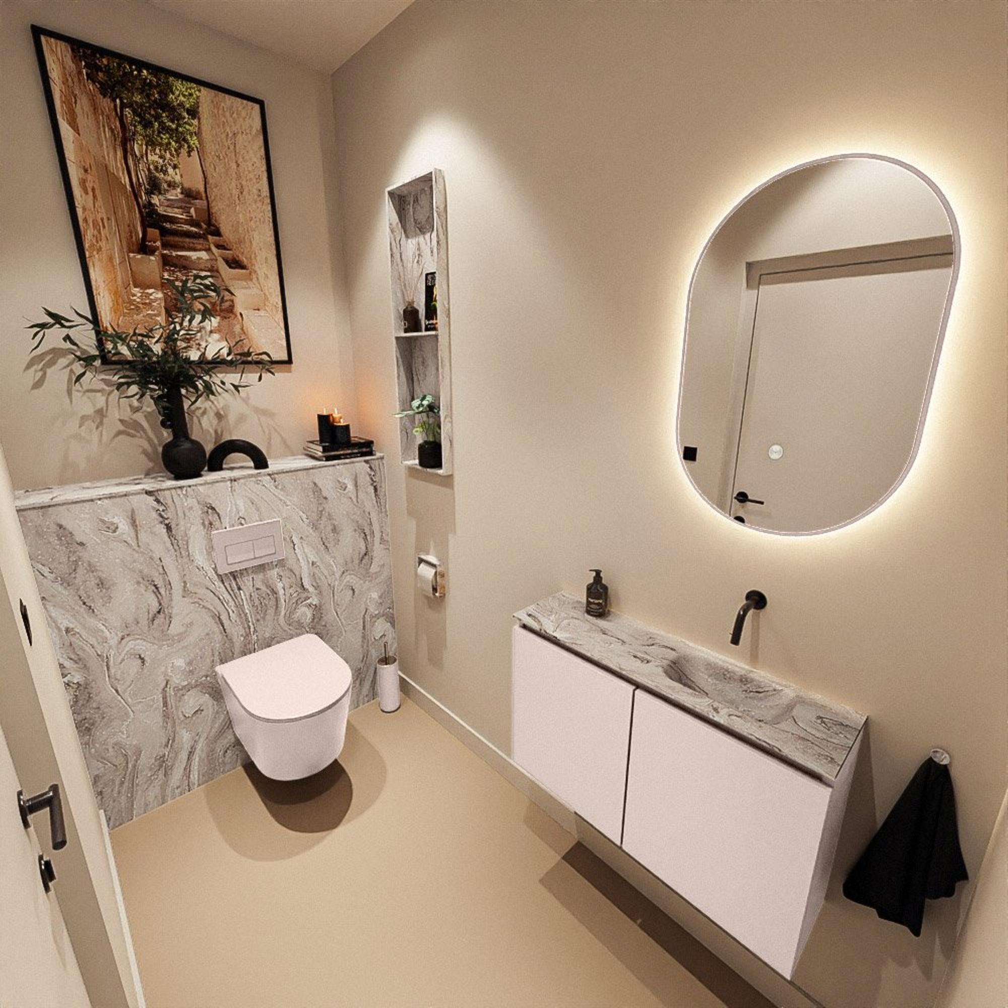 La combinaison de la couleur Rosee du meuble et de l’accent marbre du plan vasque crée un aspect luxueux mais néanmoins doux. Ce mélange moderne s’accorde parfaitement avec les tendances actuelles de la salle de bains, telles que les sols terrazzo, les robinets dorés ou noirs et les carreaux muraux clairs. Grâce à la finition sans poignées, l’ensemble paraît calme et minimaliste ; parfait si vous voulez que un petit espace paraisse plus grand et plus ordonné. Les lignes droites et les dimensions compactes (80x23x50 cm) rendent en outre le meuble très adapté à un WC design ou à une salle de bains moderne et épurée, où chaque détail est juste et forme un ensemble cohérent.