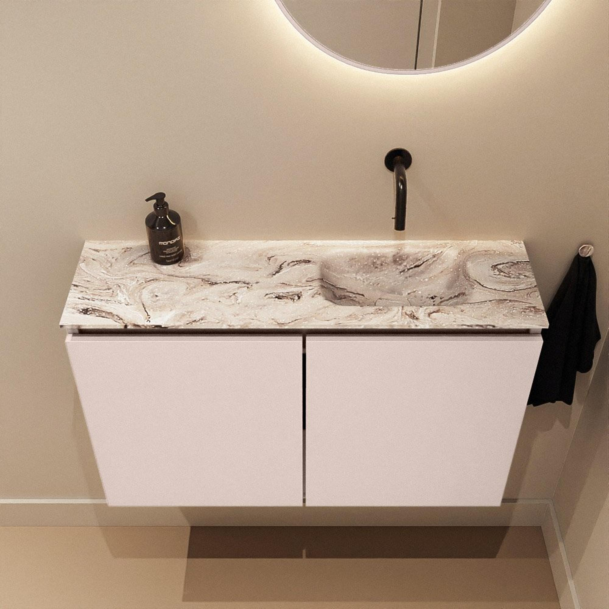 Cherchez-vous un meuble de toilettes peu profond et élégant qui s’intègre dans un espace WC moderne ou une salle de bains compacte, tout en offrant suffisamment d’espace de rangement et un lavabo à part entière ? Alors cette combinaison avec un meuble bas élégant dans une douce teinte rose et un plan en solid surface épuré est un choix judicieux. Grâce à la largeur de 80 cm et à la faible profondeur, vous créez un espace de lavage généreux, tout en pouvant continuer à circuler confortablement dans un WC étroit ou le long d’un mur de couloir. Le lavabo avec cuve à droite est idéal si votre installation ou la position de la porte l’exige, et comme il n’y a pas de trou de robinet, vous avez toute liberté pour choisir vous-même un mitigeur de lavabo à poser assorti. Les façades sans poignées, le plan vasque aspect marbre et le design moderne rendent ce meuble particulièrement adapté aux amateurs de design qui souhaitent créer une ambiance calme et luxueuse sans sacrifier la fonctionnalité.