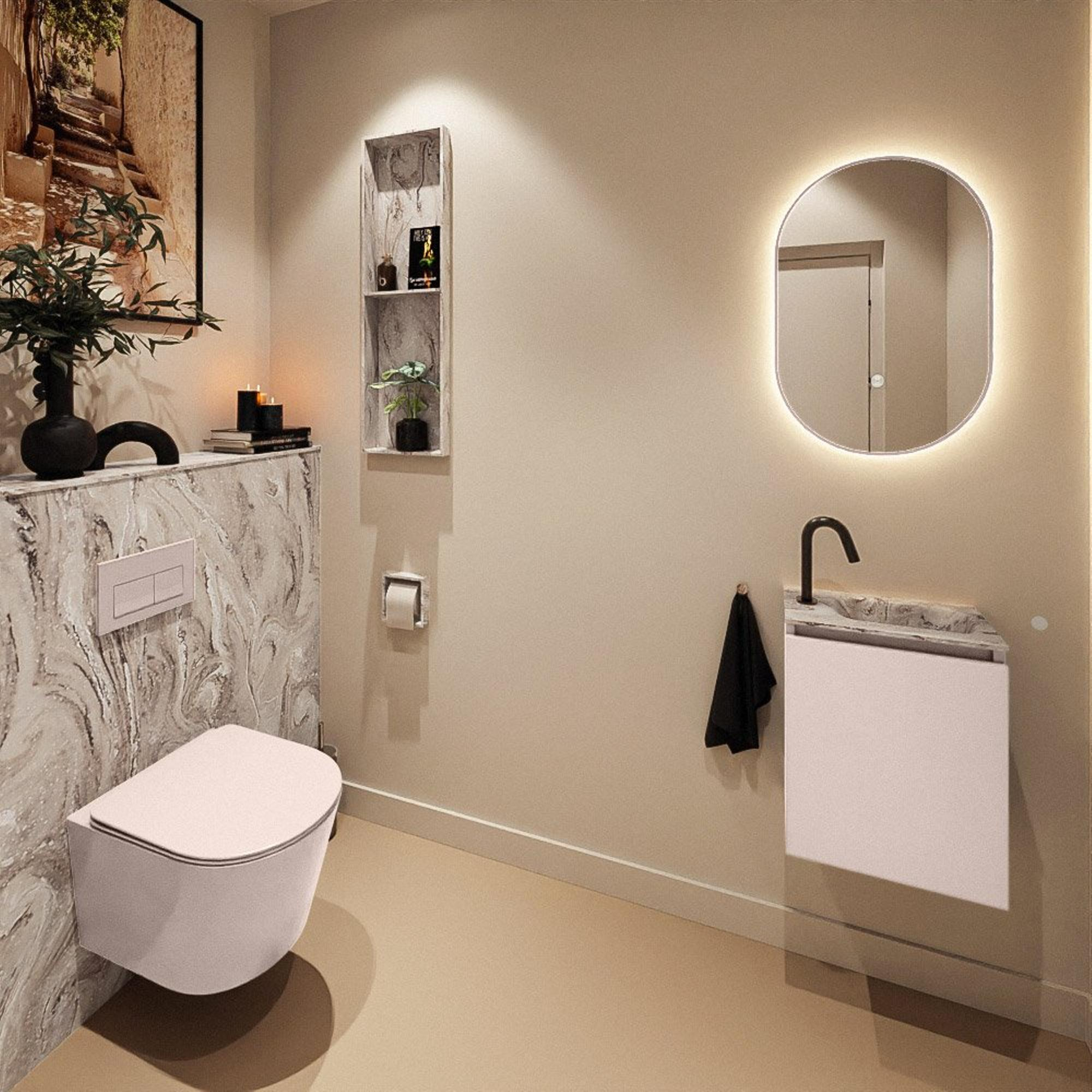 Vous recherchez un meuble de toilette compact mais remarquable qui donne immédiatement plus de style à vos toilettes ou à votre petite salle de bains ? Alors ce meuble moderne avec sa teinte rose douce et son plan vasque aspect marbre est un choix très judicieux. Grâce à sa faible profondeur, il s'intègre parfaitement dans les espaces étroits, tout en vous offrant un lavabo complet avec trou de robinet à disposition. La combinaison d'un design épuré, d'une porte sans poignée et d'un lavabo en solid surface crée un look contemporain qui s'accorde parfaitement avec un style moderne, scandinave ou hôtel chic. Idéal si vous aimez faire une déclaration dans les toilettes, sans que l'ensemble ne devienne trop chargé. De plus, le meuble est pratique à utiliser et facile à entretenir, de sorte que même les jours de grande affluence vous pouvez rapidement tout remettre propre et en ordre.