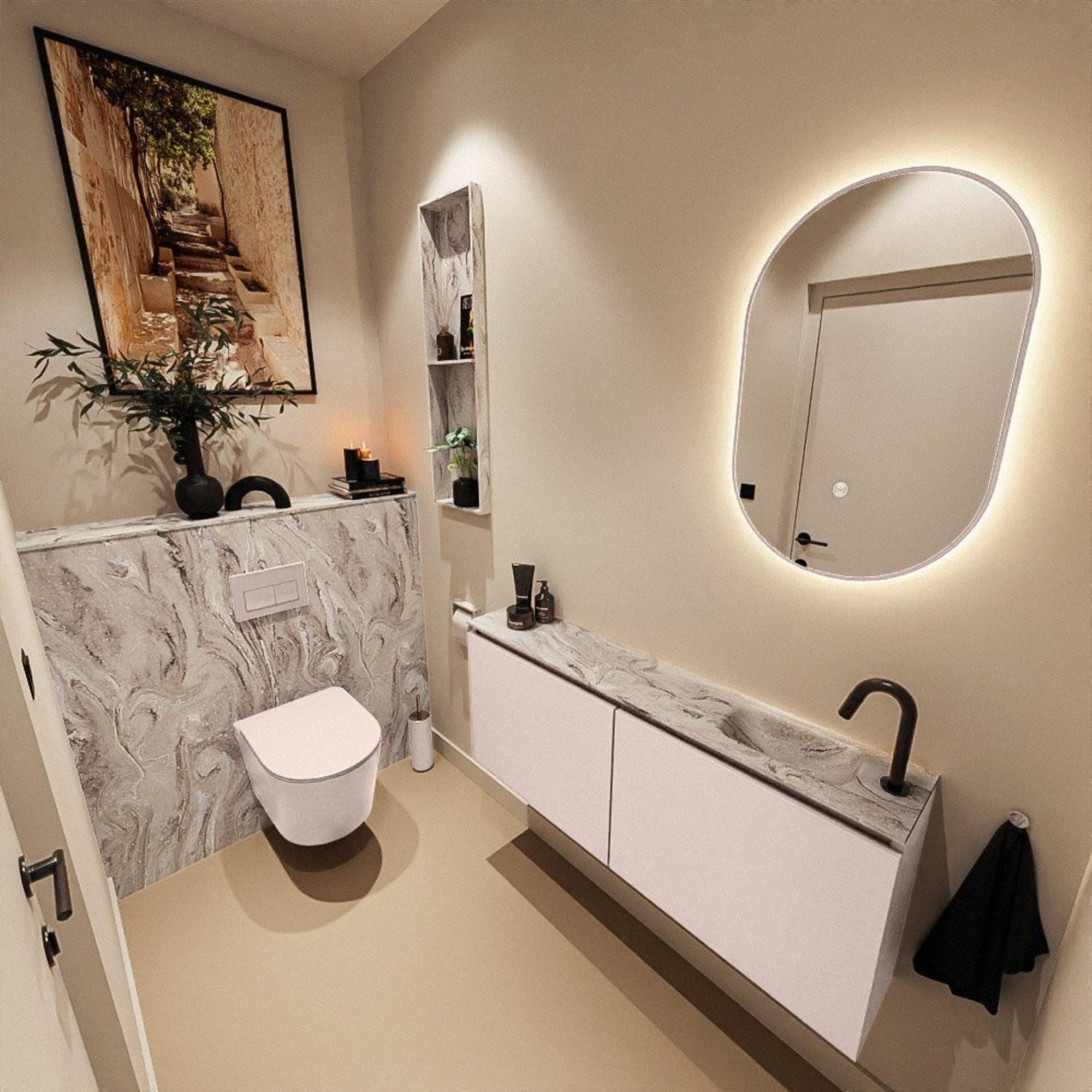 Vous recherchez un meuble de toilettes élégant qui prend peu de place, mais offre tout de même une apparence luxueuse ? Alors cette solution compacte est un choix judicieux. Grâce à sa faible profondeur, le meuble s’intègre parfaitement dans un espace toilettes ou une petite salle de bains, tandis que la largeur généreuse de 120 cm crée au contraire un jeu de lignes calme et chic le long du mur. La combinaison d’un lavabo moderne aspect marbre et d’un meuble rose doux en fait un véritable accroche-regard dans un intérieur moderne ou design. Idéal si vous souhaitez créer une ambiance d’hôtel ludique mais néanmoins raffinée. Avec le lavabo à droite et un seul trou de robinet, ce meuble est particulièrement adapté si vous avez une configuration bien définie, par exemple avec une position fixe de la porte ou du WC suspendu, et que vous aimez une apparence ordonnée et minimaliste sans poignées visibles.