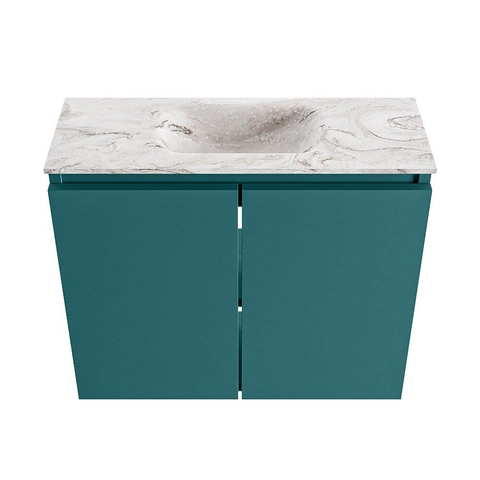 Le caisson dans la couleur Smag, une élégante teinte de vert, donne immédiatement du caractère à vos toilettes et s’accorde parfaitement avec les tendances modernes et naturelles en matière de salle de bains. Le plan et le lavabo intégré en aspect marbre Glace créent une apparence luxueuse, presque digne d’un spa. Le veinage subtil du marbre donne de la vie à la surface sans devenir chargé. Comme le bassin et le plan ne forment qu’un seul ensemble, l’ensemble paraît épuré et minimaliste. Cette combinaison de couleurs se marie parfaitement avec des accents noirs, laiton ou inox, ce qui vous permet de décliner facilement votre propre style dans les accessoires et le robinet.