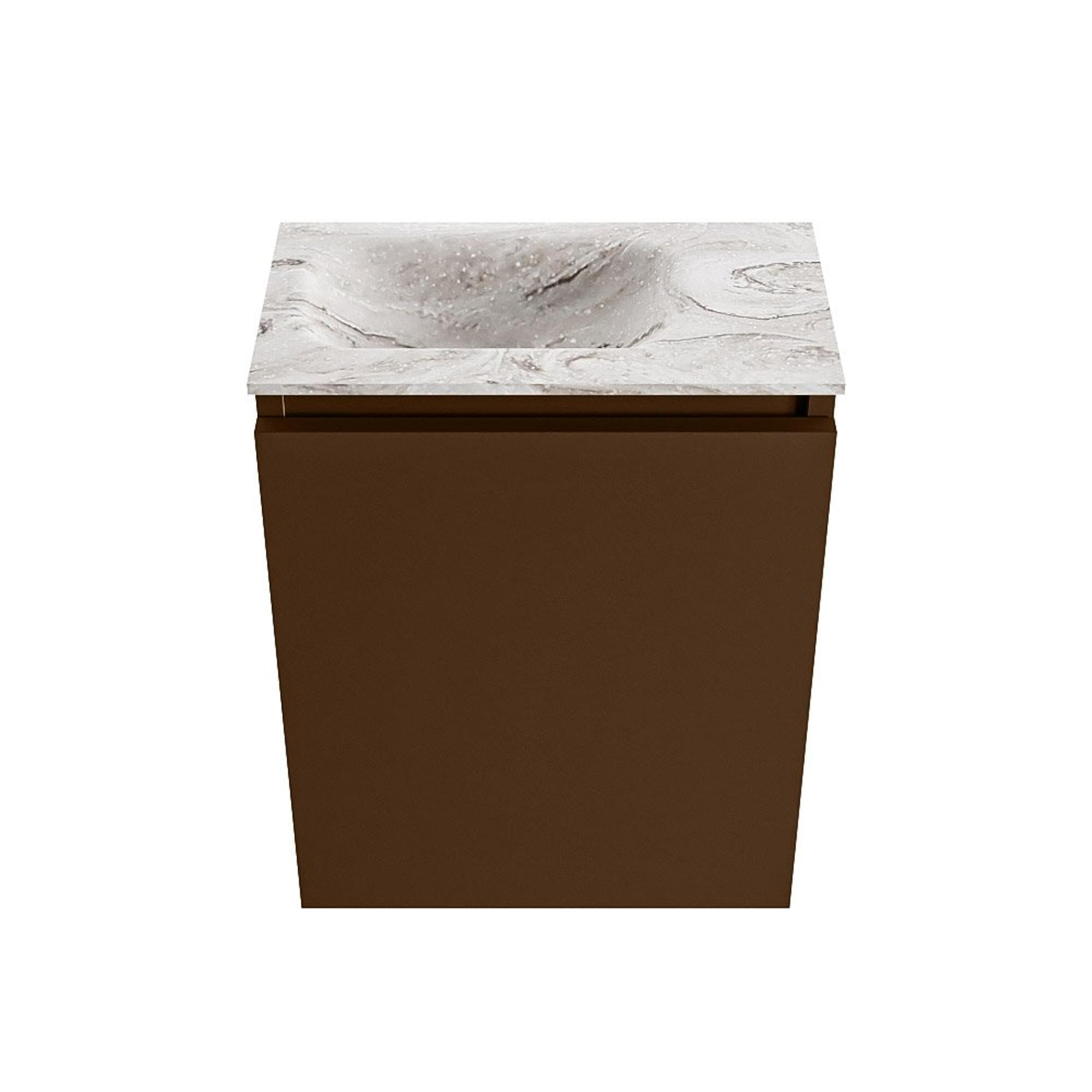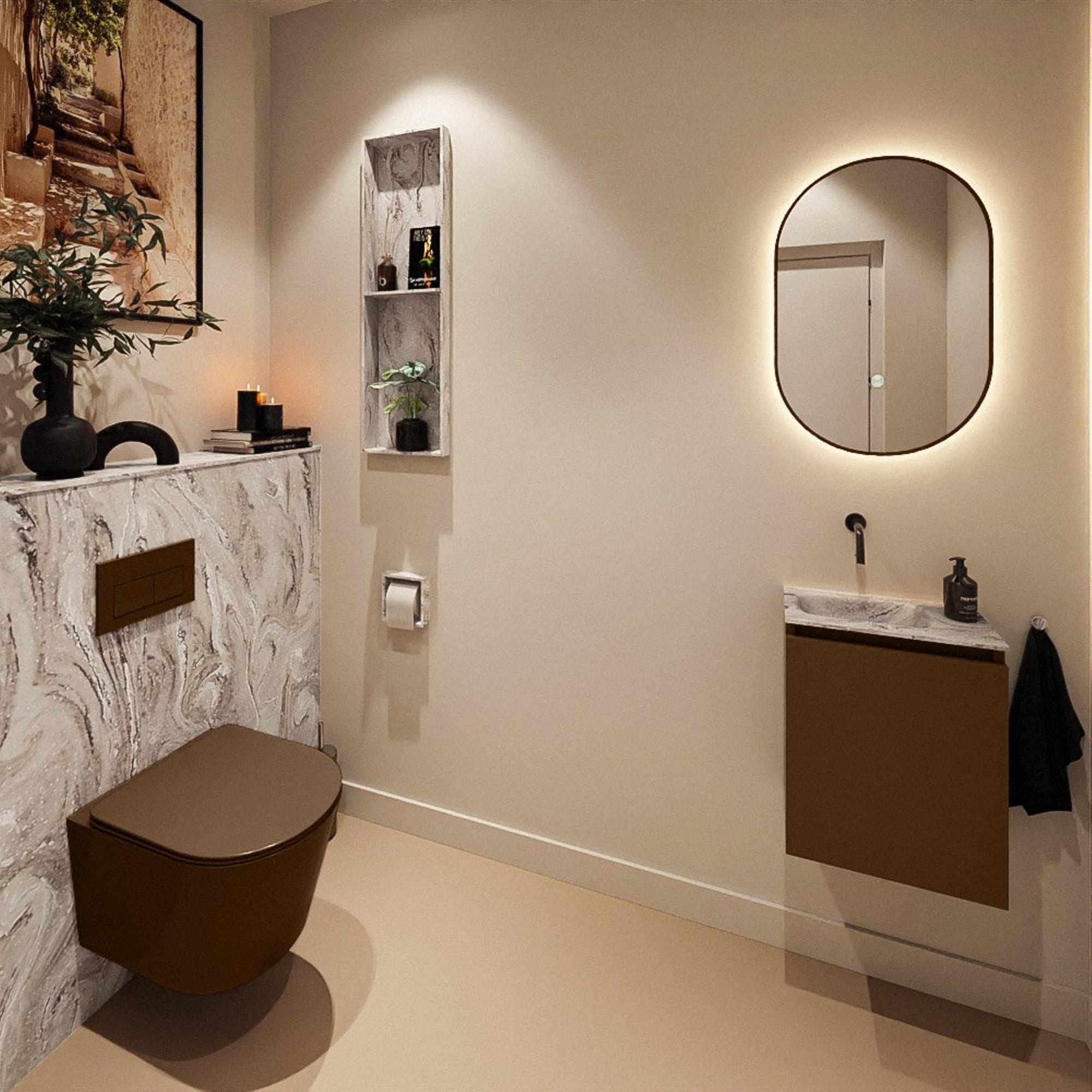 La chaude couleur brun rouille du meuble s'accorde parfaitement avec les intérieurs modernes et industriels, mais se marie tout aussi bien avec des tons naturels, de l'acier noir ou de la céramique sanitaire blanche. Le plan de toilette couleur marbre avec lavabo intégré ajoute une sensation de luxe façon hôtel, sans donner une impression surchargée. Comme le lavabo est positionné à gauche, une zone de dépose pratique se crée à côté de la cuve pour le savon ou les accessoires. Vous créez ainsi, dans un petit espace, un point d'eau réfléchi et élégant qui donne immédiatement le ton dès que vous entrez dans les toilettes.