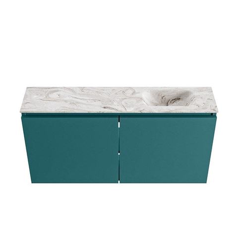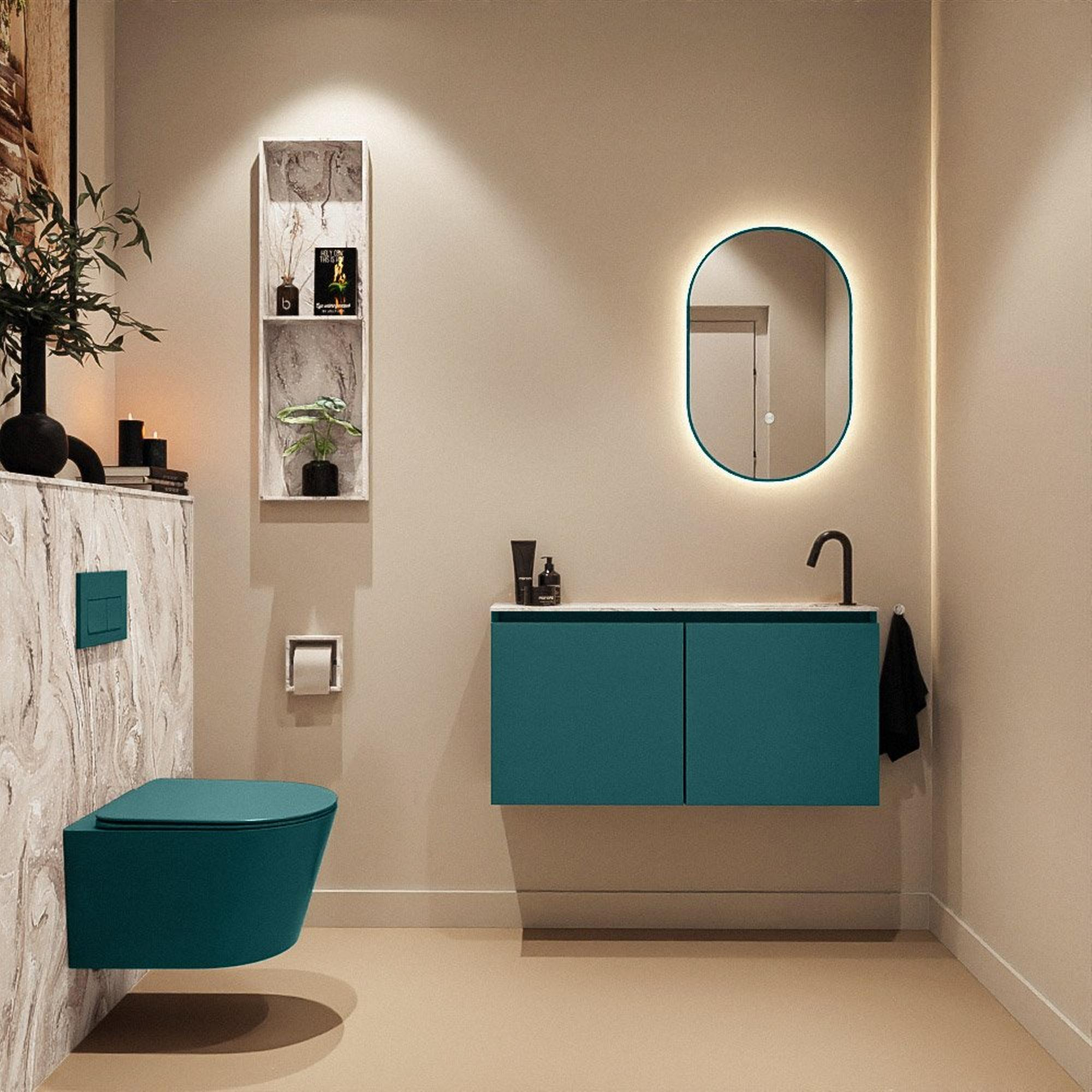 La teinte profonde et moderne Smag – un élégant ton bleu-vert – confère immédiatement à vos toilettes une allure luxueuse et contemporaine. Associé au plan aspect marbre et à la vasque Glace, l’ensemble évoque une solution design haut de gamme, comme on en voit dans les hôtels raffinés et les intérieurs modernes. Le calme de l’effet marbre s’harmonise aussi bien avec des robinets et accessoires noirs, laiton que chromés, ce qui vous laisse une grande liberté pour exprimer votre style. La façade sans poignées s’inscrit parfaitement dans un intérieur épuré et minimaliste : aucune ligne superflue, mais un ensemble sobre qui reste beau longtemps et dont on ne se lasse pas facilement.