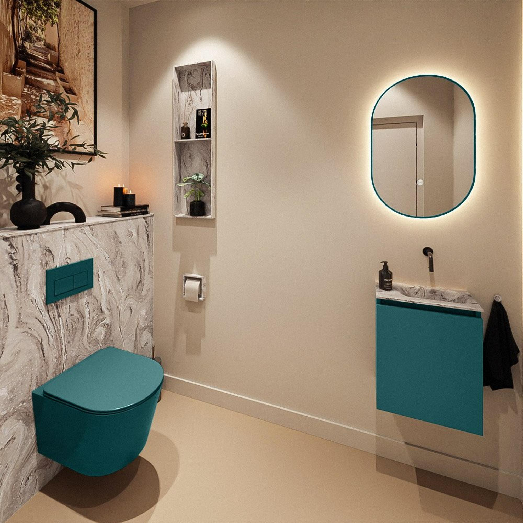 La couleur contemporaine Smag - une teinte verte moderne - donne immédiatement du caractère à vos toilettes et se distingue du traditionnel ensemble lave-mains blanc. En combinaison avec le plan vasque aspect marbre et le lavabo Eden en Glace, il en résulte une allure luxueuse digne d'un hôtel, même dans une pièce très petite. En choisissant cette combinaison marquée mais néanmoins intemporelle, vous créez un intérieur qui dure des années et qui se marie facilement avec des accessoires noirs, laiton ou chromés. Pensez à un robinet lave-mains assorti au mur, un crochet porte-serviette élégant et un porte-rouleau discret : ainsi, tous les éléments forment un ensemble harmonieux.