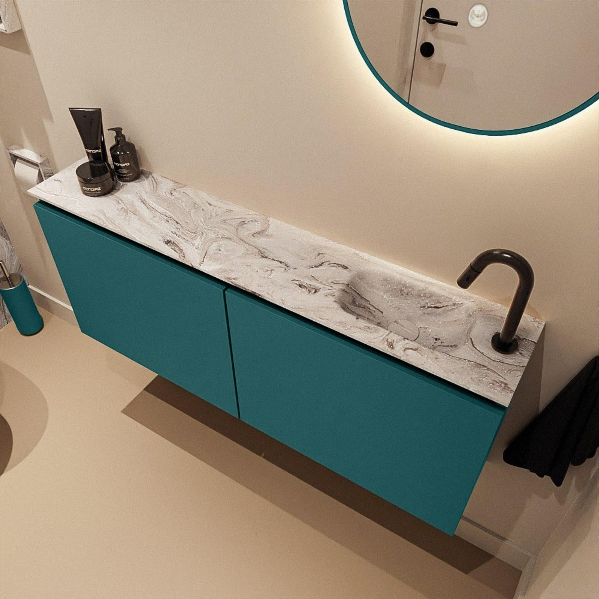 Ce meuble WC mince avec vasque intégrée est spécialement conçu pour ceux qui souhaitent hisser les toilettes invités ou une petite salle de bains à un niveau supérieur. Grâce à sa faible profondeur, il s’adapte même aux espaces étroits, tandis que sa longueur généreuse de 120 cm offre une apparence luxueuse et suffisamment de place pour les accessoires. L’association du meuble dans une douce teinte verte avec un plan vasque aspect marbre a un rendu moderne et élégant, et s’accorde parfaitement avec des styles d’intérieur populaires tels que l’hôtel chic, le style scandinave et le minimalisme moderne. Si vous recherchez une solution pratique avec une zone de lavage fixe à droite et de l’espace pour poser de la décoration ou un ensemble de savon, il s’agit d’un choix très réfléchi. Idéal comme élément accrocheur dans les toilettes de l’entrée ou comme meuble compact dans une seconde salle de bains où le design et l’usage quotidien doivent se rejoindre.