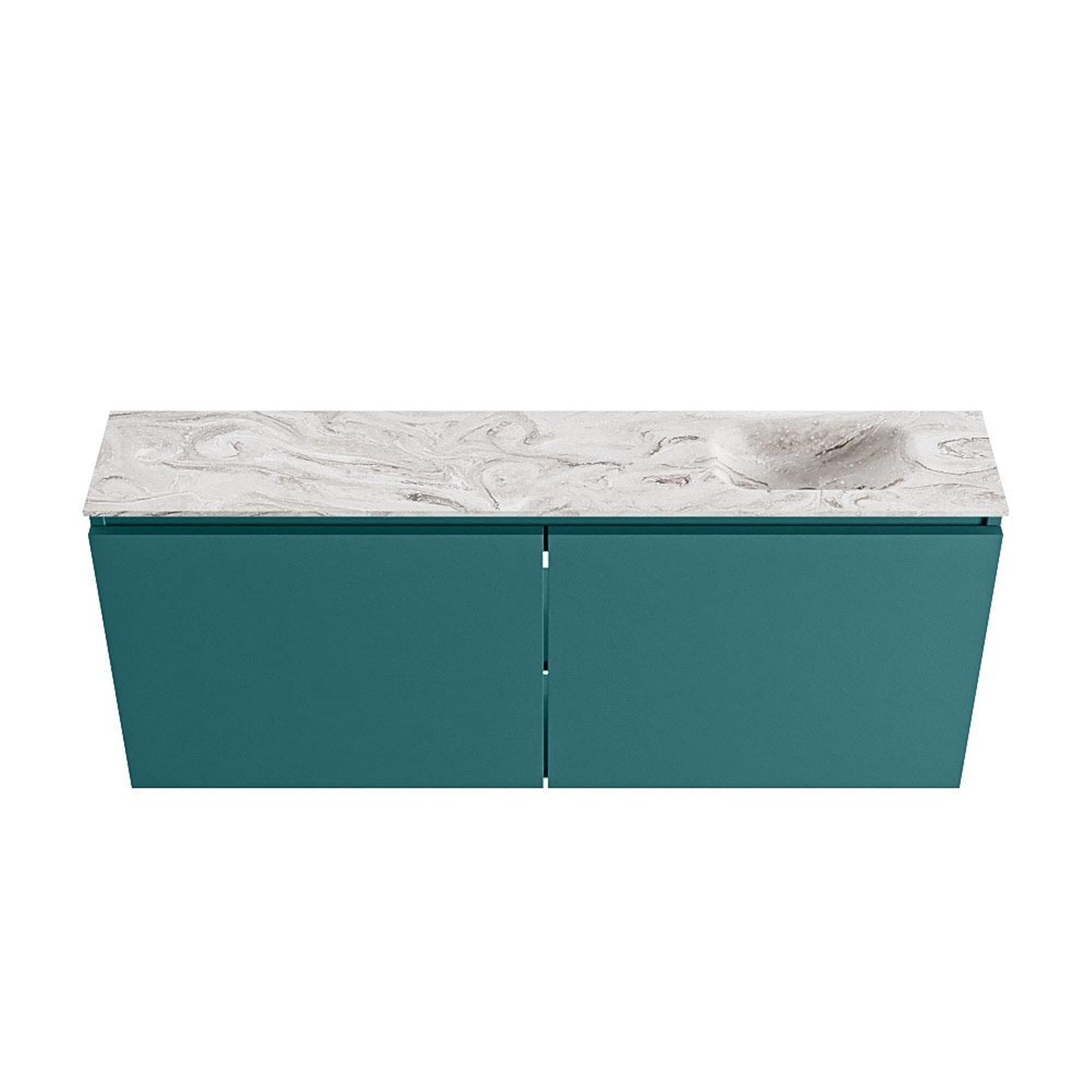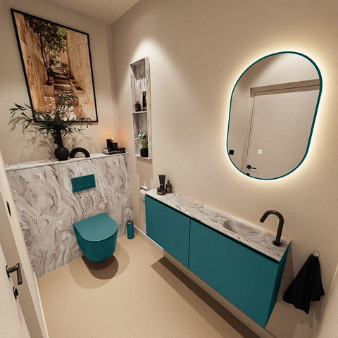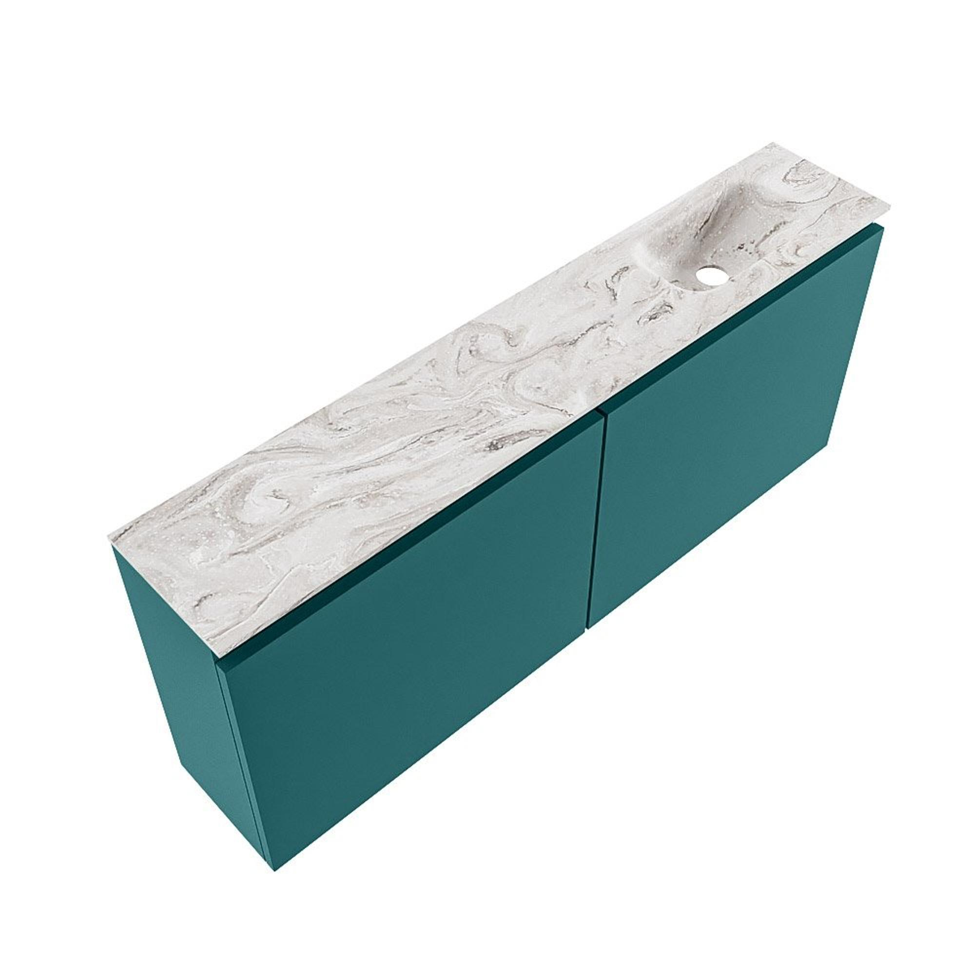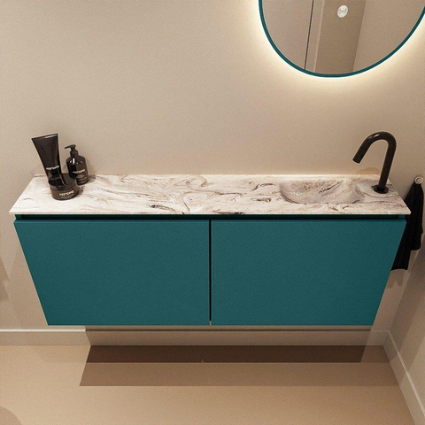 Avec une profondeur de seulement 23 cm, ce meuble est parfait pour les petites toilettes ou les petites salles de bains, sans que vous ayez à sacrifier le confort. La longueur de 120 cm assure une apparence généreuse et vous offre sur le dessus du plan suffisamment d’espace pour placer par exemple un joli savon pour les mains, un diffuseur de parfum ou une petite plante. La zone de lavage se trouve à droite, ce qui permet de conserver une ligne de circulation nette dans la pièce et de limiter les risques de heurts. L’association de la couleur verte Smag avec le plan vasque aspect marbre Glace donne à l’ensemble un aspect raffiné, presque comme un meuble de séjour. Vous créez ainsi des toilettes élégantes et harmonieuses qui donnent l’impression d’être le prolongement de l’aménagement de votre salon.
