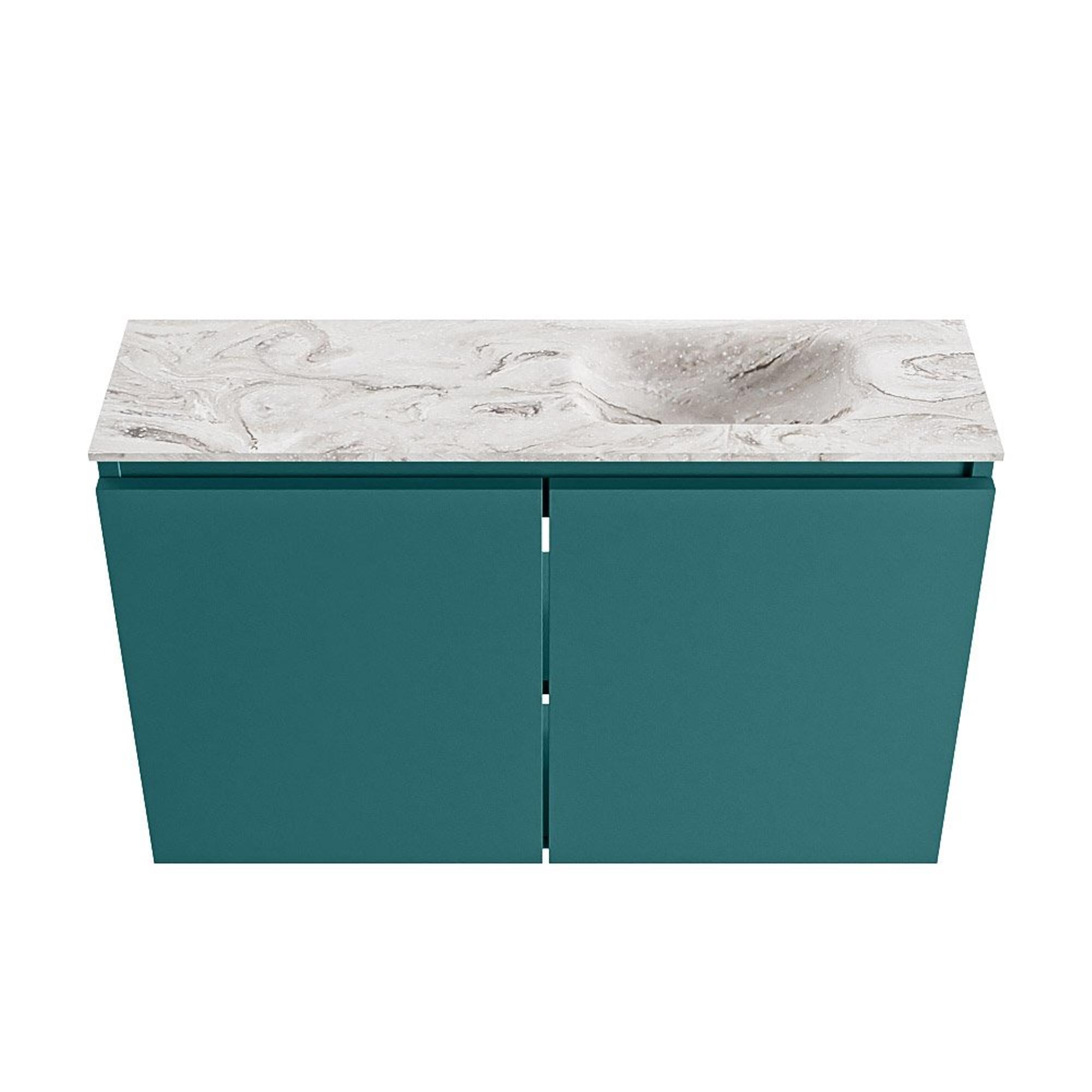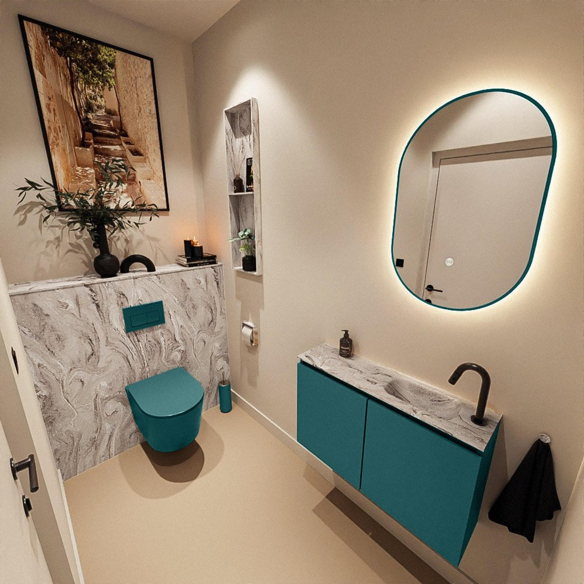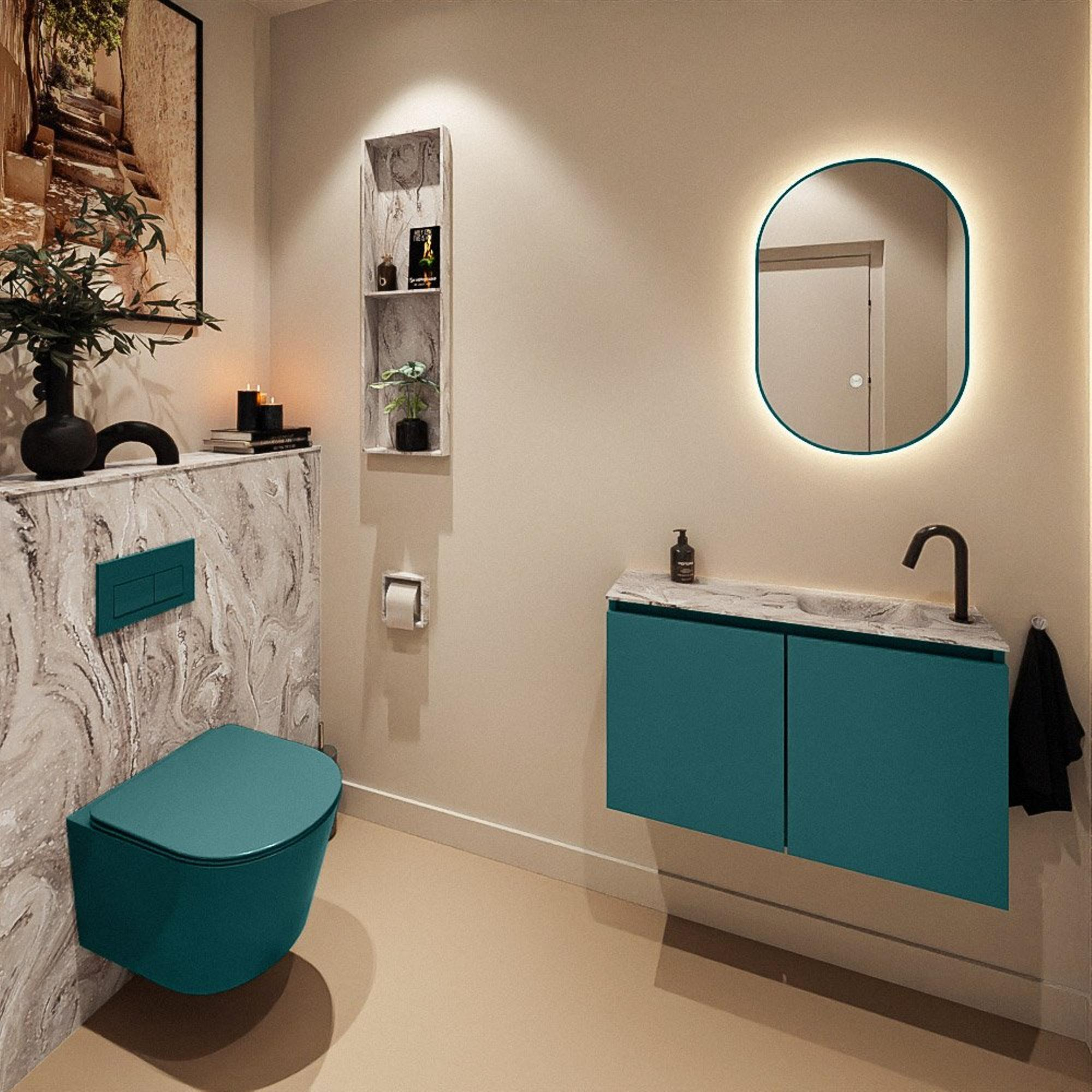 Avec ce meuble de toilettes élégant et peu profond, vous créez en une seule fois un point d’eau à la fois pratique et raffiné, même dans le plus petit des espaces. La combinaison du meuble vert et du plan aspect marbre donne immédiatement à vos toilettes une apparence moderne et haut de gamme. Complétez votre salle de bains de rêve avec ce produit élégant et constatez vous-même sa qualité.