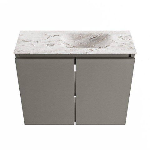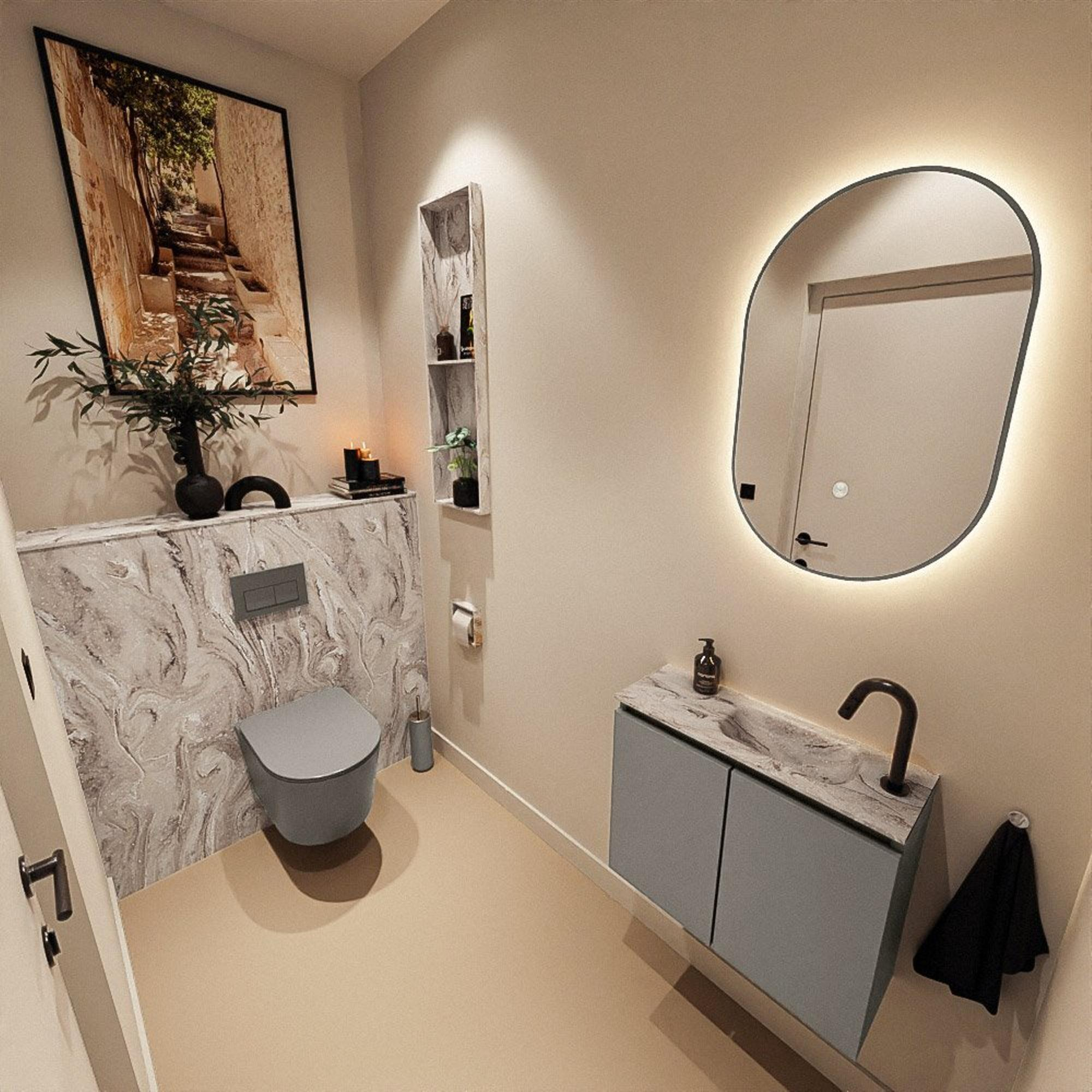 Vous recherchez un meuble élégant et compact pour vos toilettes ou une petite salle de bains, qui soit non seulement esthétique mais aussi pratique au quotidien ? Alors cette combinaison avec meuble fin et lavabo intégré est un choix judicieux. Grâce à sa faible profondeur, il prend à peine de place, tout en offrant un véritable point d'eau avec trou de robinet et un espace de rangement soigné. La couleur moderne fumée du meuble, combinée au plan vasque aspect marbre, apporte une apparence luxueuse qui convient parfaitement aux intérieurs épurés et contemporains. Idéal pour les toilettes, la salle de bains des invités ou une niche étroite où vous souhaitez du confort, sans que l'espace ne paraisse exigu. De plus, le lavabo est positionné à droite, ce qui est pratique si vous êtes par exemple à côté d'un mur, d'une porte ou d'un radiateur et que vous devez en tenir compte dans votre aménagement.