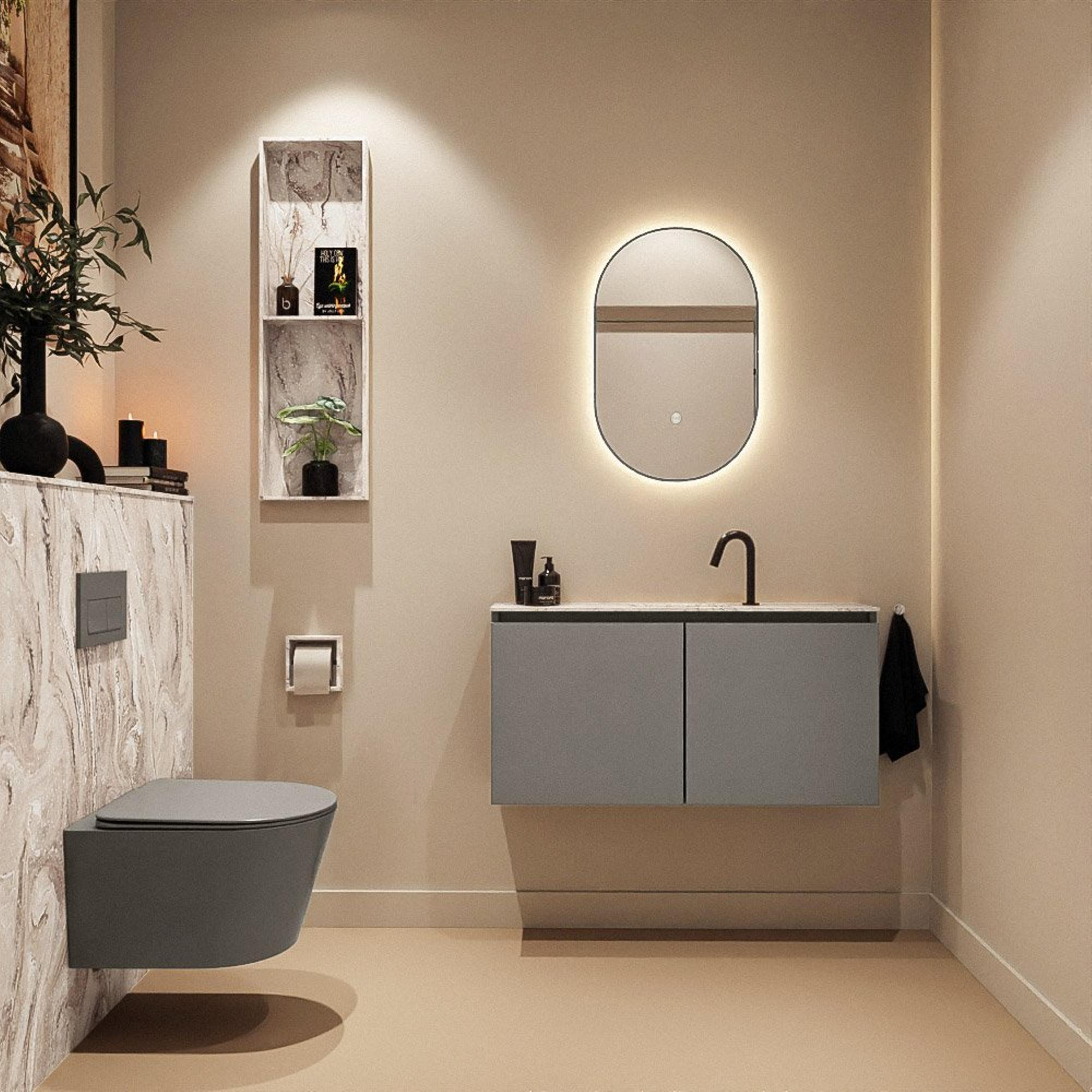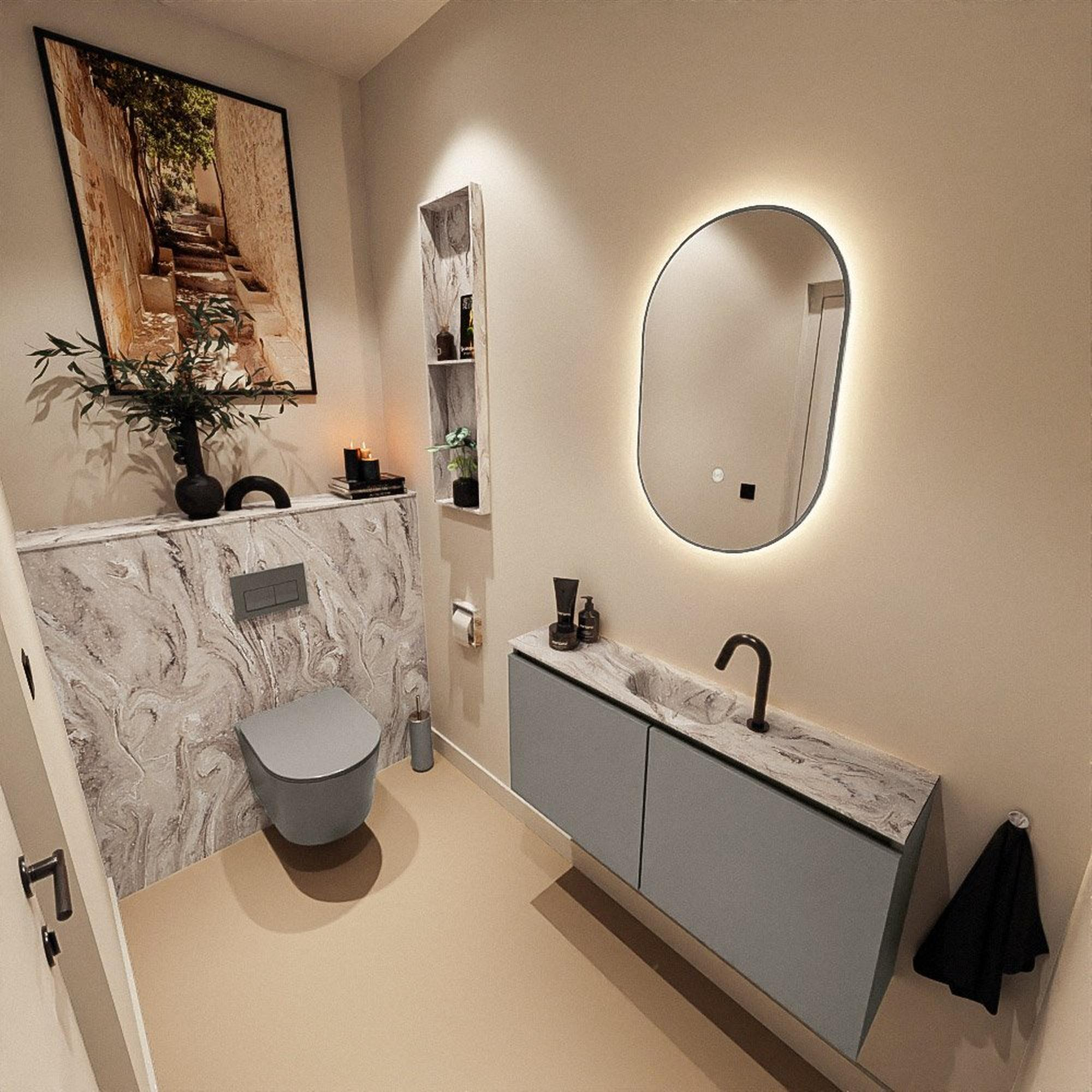 Avec ce meuble de toilettes compact, vous créez en une seule fois un look luxueux et spacieux dans vos toilettes ou votre petite salle de bains. La faible profondeur le rend idéal pour les espaces étroits ou un WC de couloir, tout en vous offrant un véritable lavabo. La combinaison d’un meuble épuré dans une teinte smoke profonde et d’un élégant lavabo avec effet marbre donne immédiatement une apparence haut de gamme, digne d’un hôtel. Grâce au trou de robinet central, vous pouvez facilement choisir un robinet assorti à votre style, du noir minimaliste au chrome intemporel. Si vous recherchez un meuble moderne et gain de place qui non seulement est esthétique, mais aussi pratique au quotidien, il s’agit d’un choix judicieux aussi bien pour la rénovation que pour la construction neuve.