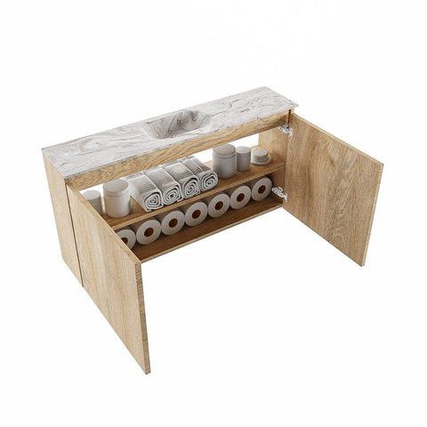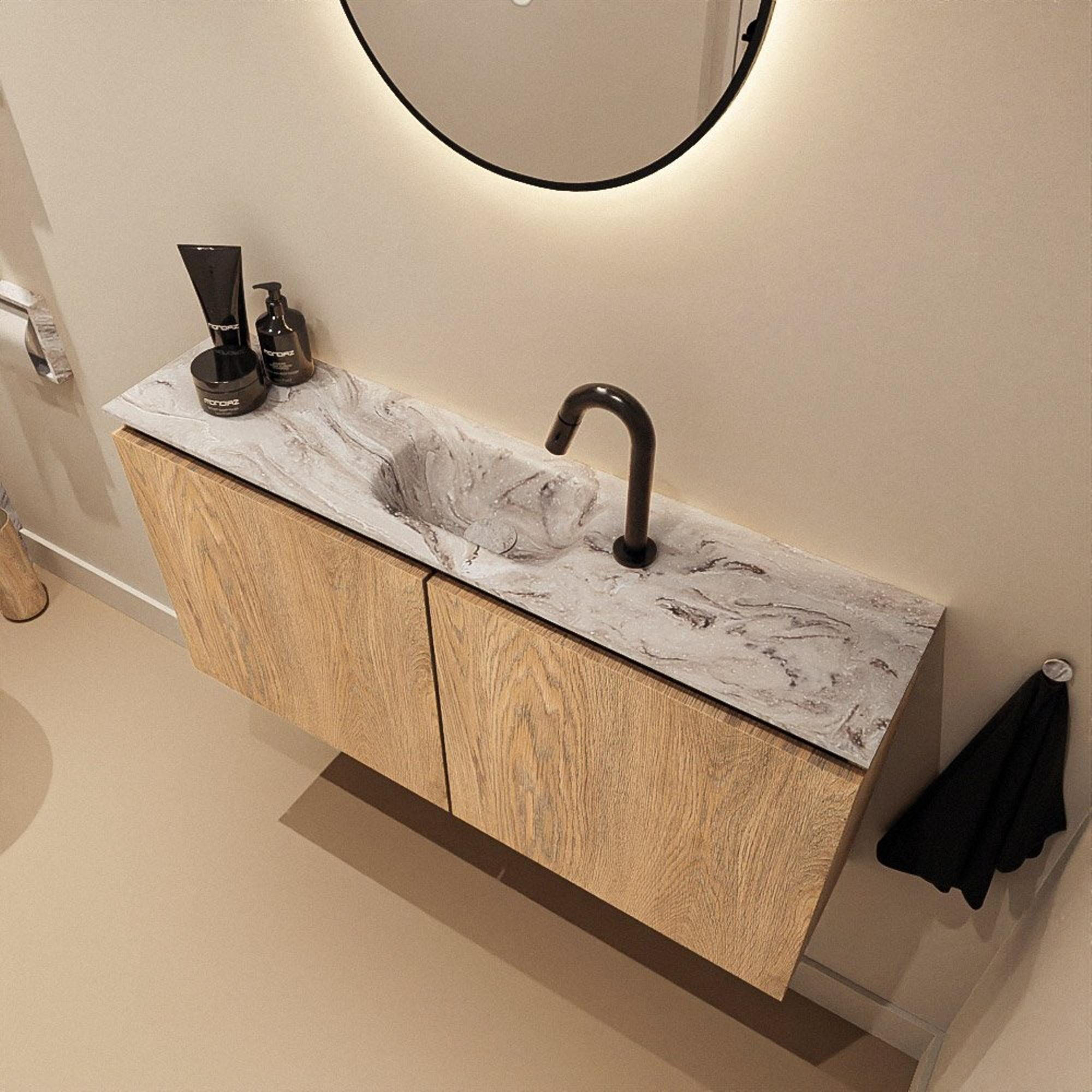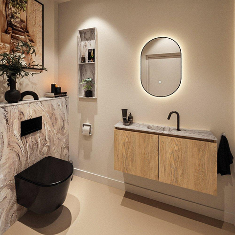 La combinaison d’un caisson en Washed Oak avec un plan en Solid Surface de couleur marbre offre un beau mélange de chaleur et de luxe. La teinte bois apporte de l’ambiance à votre espace toilettes, tandis que le plan aspect marbre crée immédiatement un aspect haut de gamme et moderne. Le design sans poignées renforce ce look épuré et minimaliste et s’accorde bien avec les tendances d’habitation contemporaines. Grâce aux tons neutres, ce meuble se combine facilement avec des robinets blancs ou noirs, des accessoires noir mat ou au contraire en métal brossé. Vous pouvez ainsi créer plusieurs styles à partir d’un seul meuble de base, du style hôtel chic à une atmosphère scandinave apaisante.