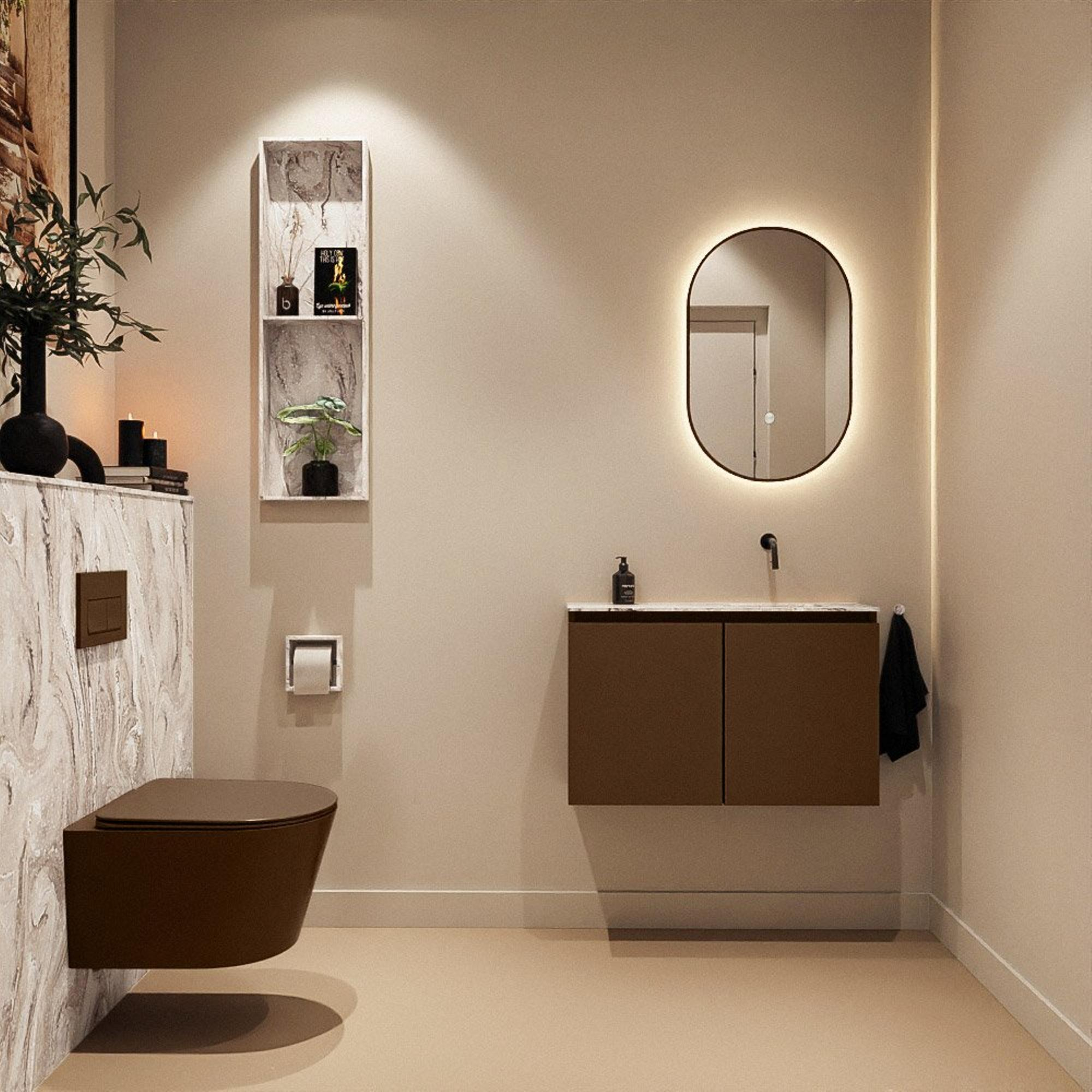 Si vous recherchez un meuble WC compact et moderne qui apporte néanmoins chaleur et ambiance à vos toilettes ou à votre petite salle de bains, cette combinaison est alors un choix judicieux. La teinte bois chaleureuse s’accorde parfaitement avec un style industriel, moderne ou hôtel-chic et se marie facilement avec des robinets et accessoires noirs, chromés ou en laiton. Grâce à la profondeur limitée, le meuble est idéal pour les espaces étroits ou une niche de toilettes exiguë, tandis que la largeur généreuse vous garantit tout de même un lavabo à part entière et suffisamment d’espace de rangement derrière les portes. Le lavabo épuré en solid surface avec effet marbre offre une apparence luxueuse et, grâce à la cuve compacte et au montage en pose sur plan, il est particulièrement adapté au lavage quotidien des mains sans éclaboussures. Vous obtenez ainsi une solution à la fois élégante et pratique qui donne visuellement plus d’ampleur et de calme aux petits espaces.