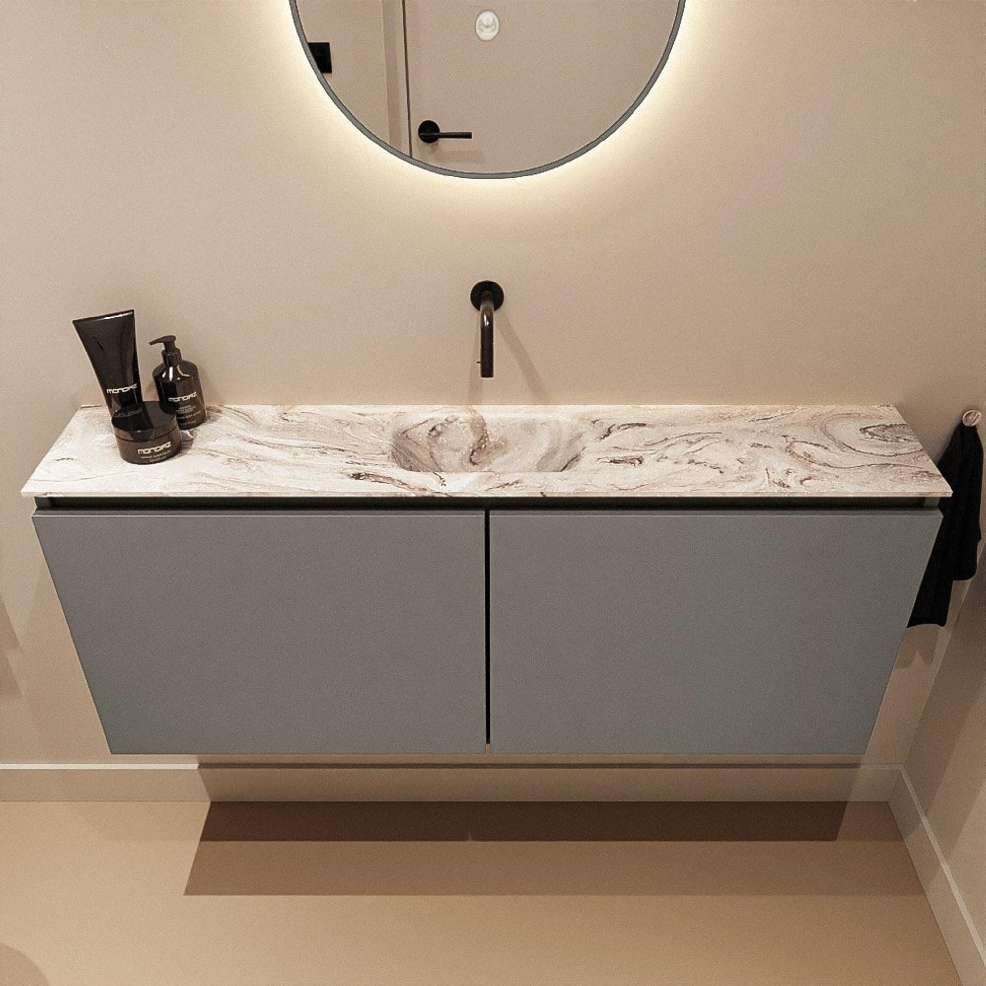 Le lavabo Eden intégré aspect marbre confère immédiatement une allure luxueuse au meuble. Le fait qu’aucun trou de robinet ne soit pré-percé vous offre une grande liberté : vous pouvez choisir un mitigeur encastré dans le mur ou un robinet posé à côté du lavabo, parfaitement adapté à votre style et à l’agencement de la pièce. La position centrale de la cuve garantit un usage confortable pour un utilisateur, idéal dans un WC invités ou une petite salle de bains. La combinaison du plateau en Solid Surface aux lignes épurées avec le meuble bas anthracite s’harmonise parfaitement avec d’autres meubles de salle de bains modernes, afin de créer un bel ensemble cohérent dans toute la pièce.