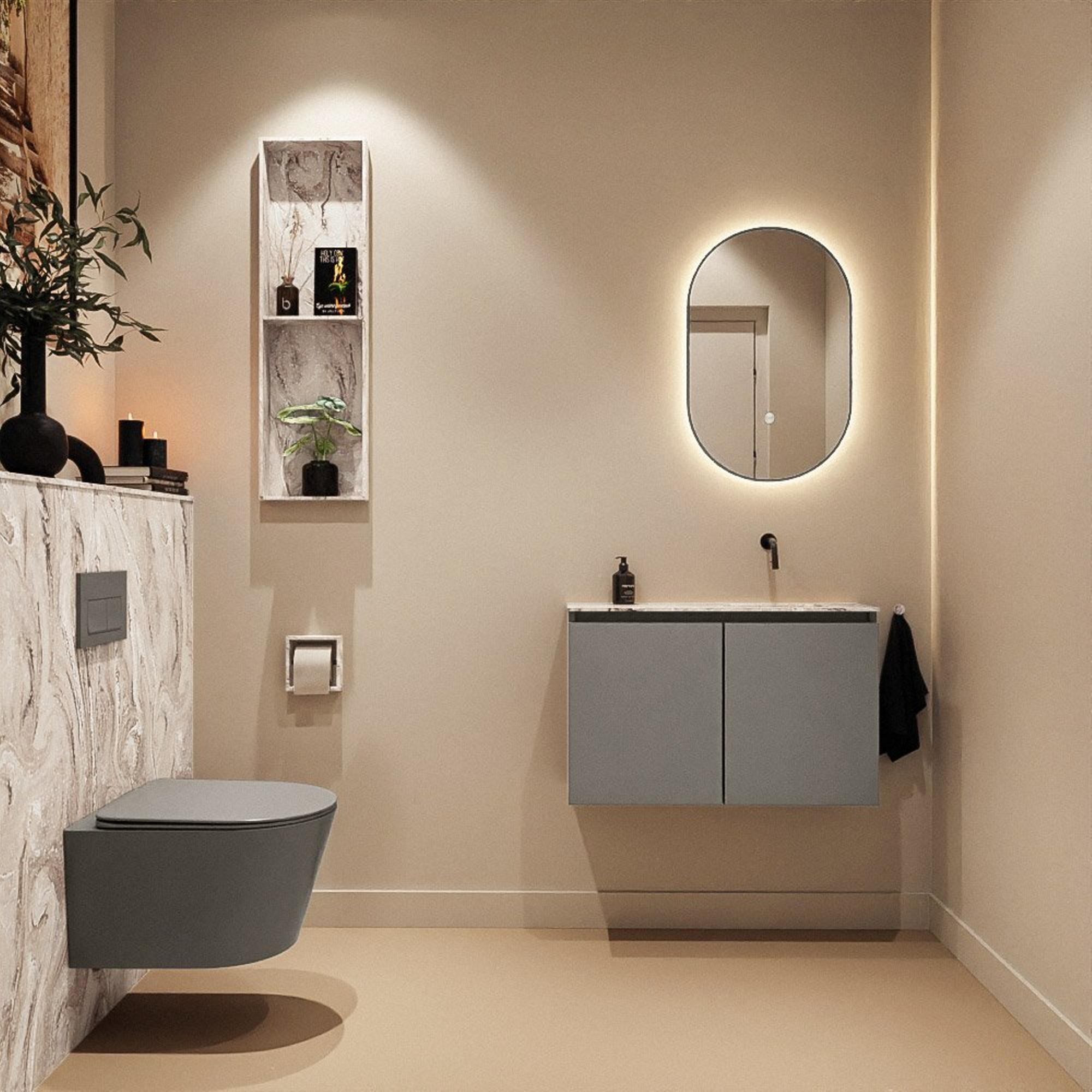 La couleur smoke (anthracite) donne au meuble un aspect moderne et élégant qui se marie à merveille avec des carreaux clairs comme foncés. La façade épurée sans poignées souligne le look minimaliste : aucune poignée saillante, mais un ensemble sobre qui s’intègre parfaitement dans un style contemporain. Le lavabo et le plateau sont réalisés dans un chic effet marbre, ce qui vous permet de profiter d’un aspect luxueux sans entretien intensif. Cette combinaison de meuble foncé et de plateau effet marbre clair est non seulement intemporelle, mais aussi un excellent choix si vous souhaitez créer un effet hôtel chic dans vos WC ou votre salle de bains.