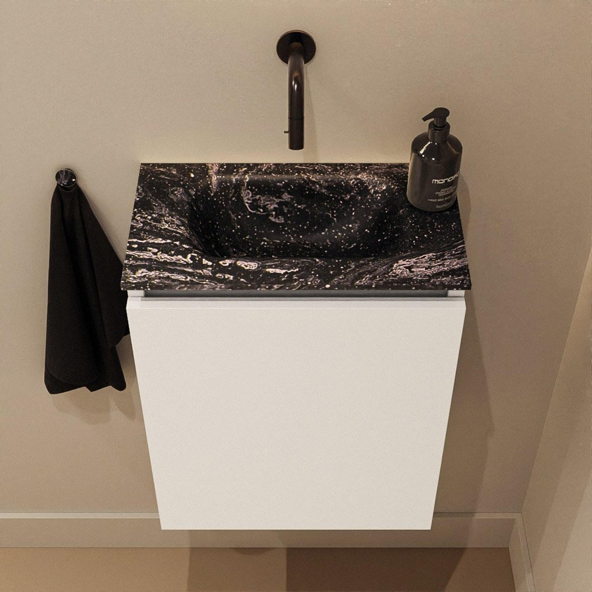 Vous recherchez un meuble de toilettes ou de petite salle de bains élégant et compact, qui ne soit pas seulement esthétique mais aussi pratique à utiliser au quotidien ? Alors ce meuble de toilettes élancé est un choix judicieux. Grâce à sa faible profondeur, il s’intègre parfaitement dans les espaces étroits, par exemple dans un WC sous l’escalier ou une petite salle de bains d’appoint. Le design moderne sans poignées s’harmonise parfaitement avec un style d’intérieur épuré et minimaliste, tandis que la combinaison d’une couleur de meuble claire avec un lavabo foncé offre immédiatement un aspect luxueux. Comme le lavabo est positionné au centre, vous disposez d’une surface d’utilisation agréable, sans que le meuble ne dépasse trop dans la pièce. Cela le rend idéal si vous souhaitez un peu plus de confort et de style, sans faire de compromis sur l’espace de circulation et la liberté de mouvement.