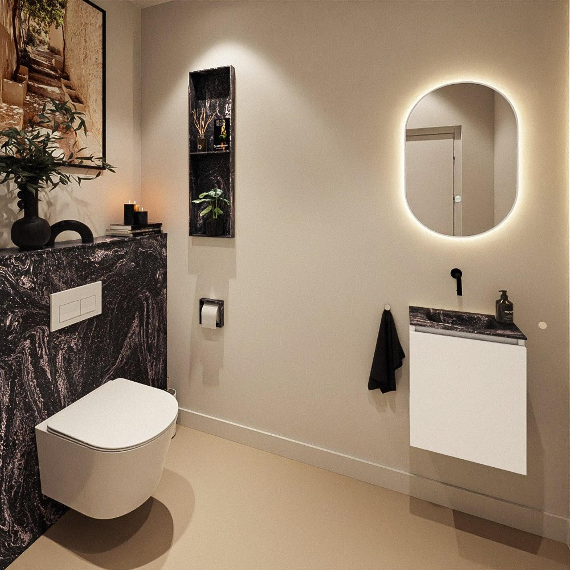 Le meuble dans la couleur Talc appartient à la famille des blancs et offre une base calme et lumineuse dans vos toilettes. Cela donne à la pièce une impression de grandeur et de fraîcheur, ce qui est un atout majeur surtout dans les petits espaces. Le lavabo Eden dans la couleur Lava, plus foncée, crée un joli contraste avec le meuble clair et confère un aspect luxueux et design. Cette combinaison de couleurs se marie facilement avec des robinets noirs, du sanitaire blanc mat ou des accessoires dans des tons bois. Vous pouvez ainsi créer facilement un look moderne et cohérent, sans être lié à une couleur tendance très marquée dont vous pourriez vous lasser rapidement. La finition sans poignée renforce le caractère minimaliste et assure une apparence ordonnée.