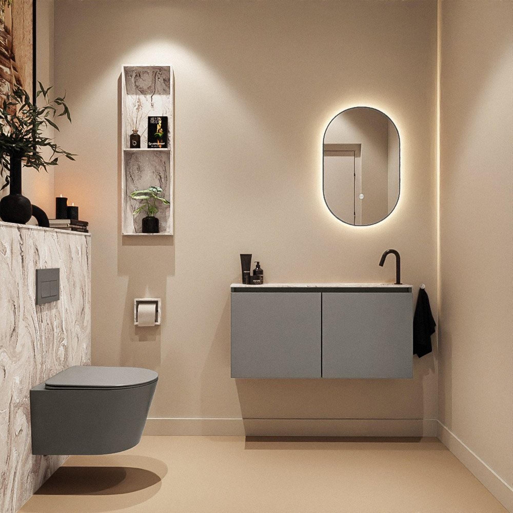 Vous recherchez un meuble élégant et extra peu profond pour des toilettes ou une salle de bains compacte, mais vous ne voulez pas sacrifier l’apparence et le confort ? Alors ce meuble moderne avec plan à l’aspect marbre et vasque intégrée est un choix très judicieux. Grâce à sa profondeur de seulement 23 cm, il dépasse à peine dans la pièce, ce qui vous permet de vous déplacer confortablement même dans un petit espace de toilettes ou une niche étroite. La combinaison de la couleur smoke anthracite avec la vasque Eden aspect marbre offre une allure luxueuse et contemporaine, tandis que les deux portes vous procurent suffisamment d’espace de rangement pour les accessoires de toilette, produits d’entretien ou serviettes invité. Le trou de robinet se trouve sur le côté droit, idéal si, par exemple, vous avez un mur à gauche du meuble ou si vous souhaitez conserver la circulation à droite. Vous combinez ainsi design, agencement pratique et utilisation optimale de l’espace dans une solution bien pensée qui restera belle pendant de nombreuses années.