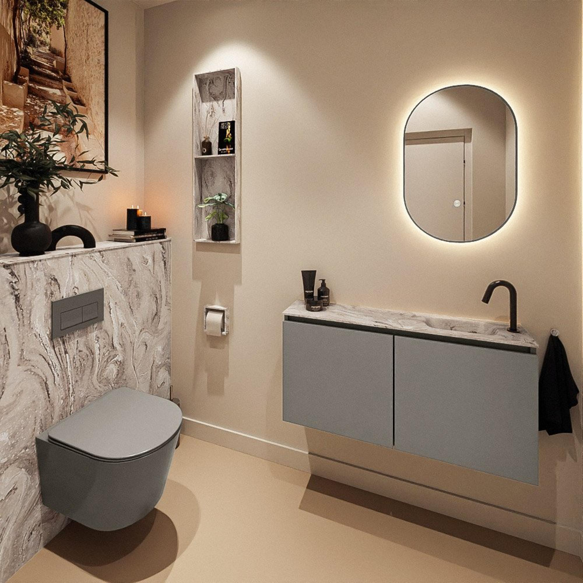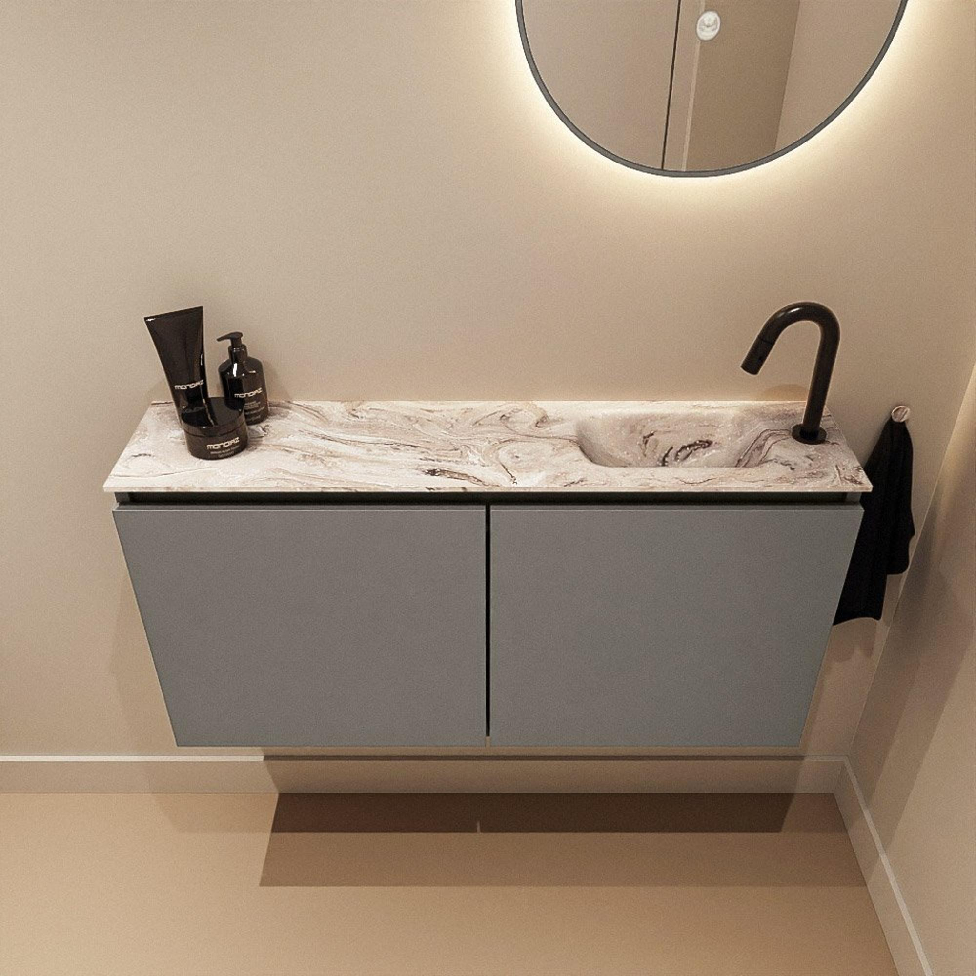 Avec des dimensions de 100x23x50 cm, ce meuble est spécialement conçu pour les toilettes, les petites salles de bains ou des WC invités modernes. Sa faible profondeur permet de préserver au maximum l’espace de circulation, tout en profitant d’une vasque complète et d’un plan généreux. Grâce à sa largeur de 100 cm, vous créez une composition qui paraît spacieuse le long du mur, par exemple sous un large miroir ou une armoire de toilette. La vasque est positionnée à droite, ce qui vous laisse à gauche une belle partie de plan libre pour un distributeur de savon, des bâtonnets parfumés ou un accessoire décoratif. Même un espace compact donne ainsi rapidement l’impression d’un ensemble soigneusement conçu.