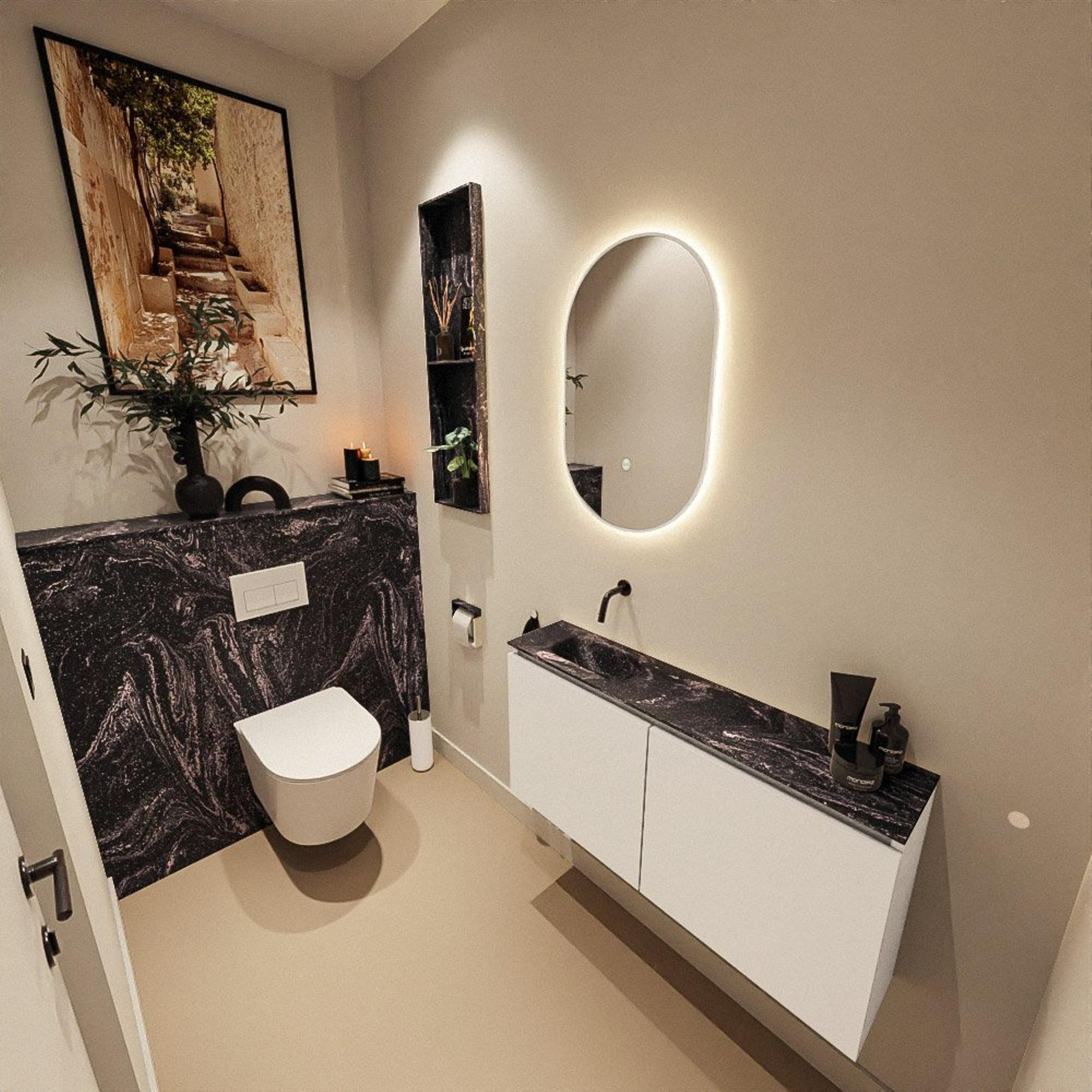 Le lavabo EDEN en Lava est fabriqué en solid surface, un matériau haut de gamme, lisse, robuste et agréable à entretenir. Comme aucun trou de robinet n’est pré-percé, vous avez la liberté de choisir par exemple un robinet encastré mural, ce qui rend l’espace encore plus calme visuellement et plus facile à nettoyer. La cuve est positionnée à gauche, idéal si votre installation ou la configuration de la pièce l’exigent. Le meuble est dépourvu de poignées, de sorte que vous ne soyez jamais gêné par des poignées saillantes dans un espace étroit et que vous puissiez simplement passer un chiffon sur les façades. Grâce aux propriétés antibactériennes des matériaux, vous contribuez en outre à des toilettes hygiéniques pour un usage quotidien.