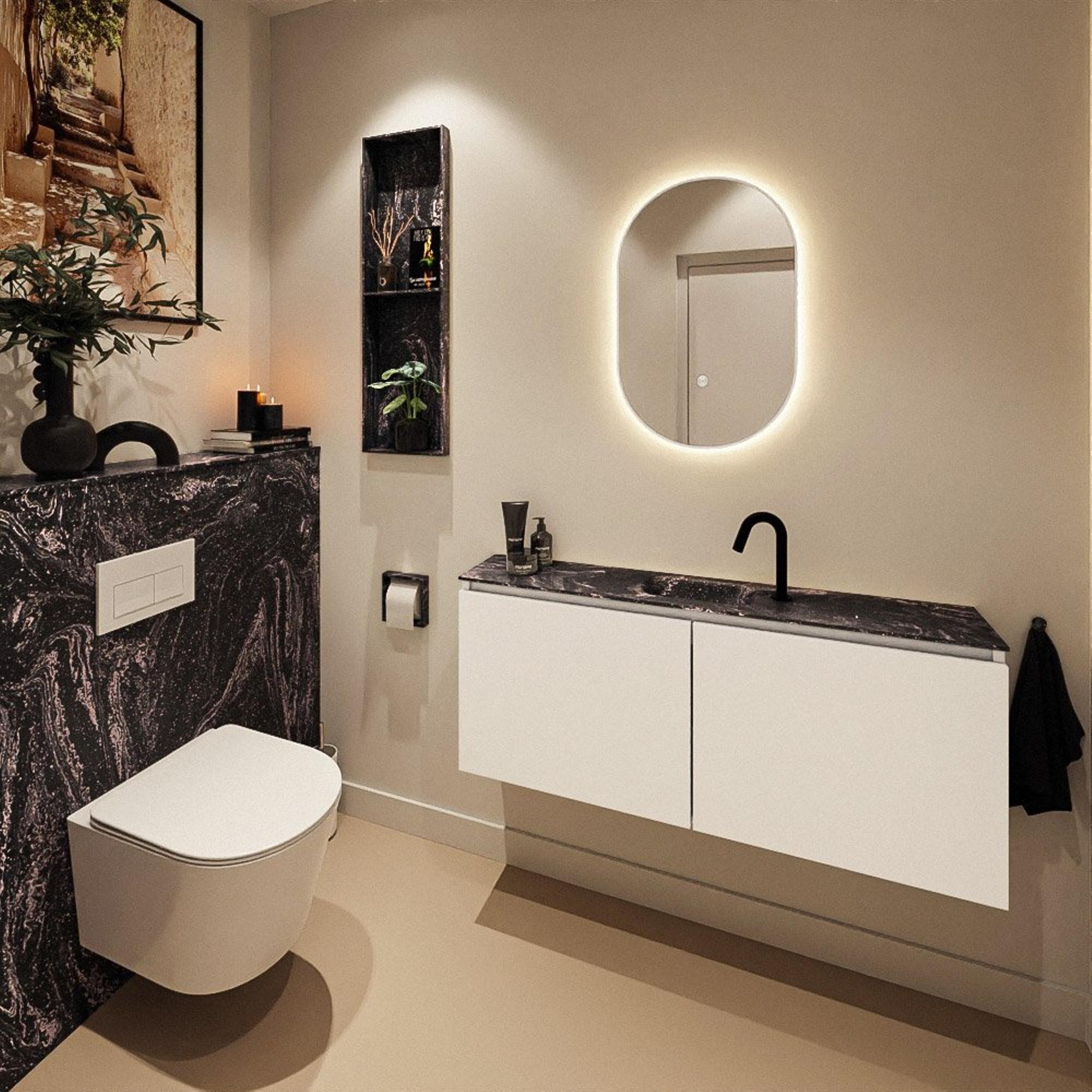La combinaison du meuble bas couleur talc et du lavabo Eden couleur Lava offre un aspect calme, tout en ayant suffisamment de contraste pour donner instantanément plus de classe à vos toilettes. Les façades sans poignées créent un look épuré et minimaliste, sans interruptions, idéal si vous aimez un ensemble sobre et ordonné. Le lavabo est placé au centre, ce qui donne au meuble un aspect bien symétrique et permet de l’aligner parfaitement sous un miroir de toilettes ou une applique de miroir. Grâce à la palette de couleurs moderne, cet ensemble se combine facilement avec des accessoires noirs, chromés ou en inox, afin que vous puissiez décliner votre propre style dans les robinets, le porte-rouleau de papier toilette et le crochet porte-serviette.