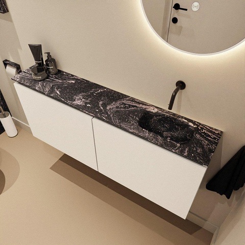 La douce couleur Talc du meuble appartient au groupe des tons blancs, mais paraît un peu plus chaude et plus luxueuse qu'un blanc standard. Elle offre immédiatement une base raffinée et apaisante à vos toilettes. Le plan en Solid Surface de couleur Lava forme un contraste puissant : profond et sombre, avec une apparence haut de gamme qui s'inscrit parfaitement dans les tendances sanitaires modernes. Le lavabo Eden intégré est positionné à droite, ce qui vous laisse à gauche un joli plateau pour un distributeur de savon, des bâtonnets parfumés ou un accessoire stylé. Cette combinaison de clair et de foncé crée un ensemble intemporel qui se marie facilement avec des robinets et accessoires noirs, chromés ou en métal brossé.