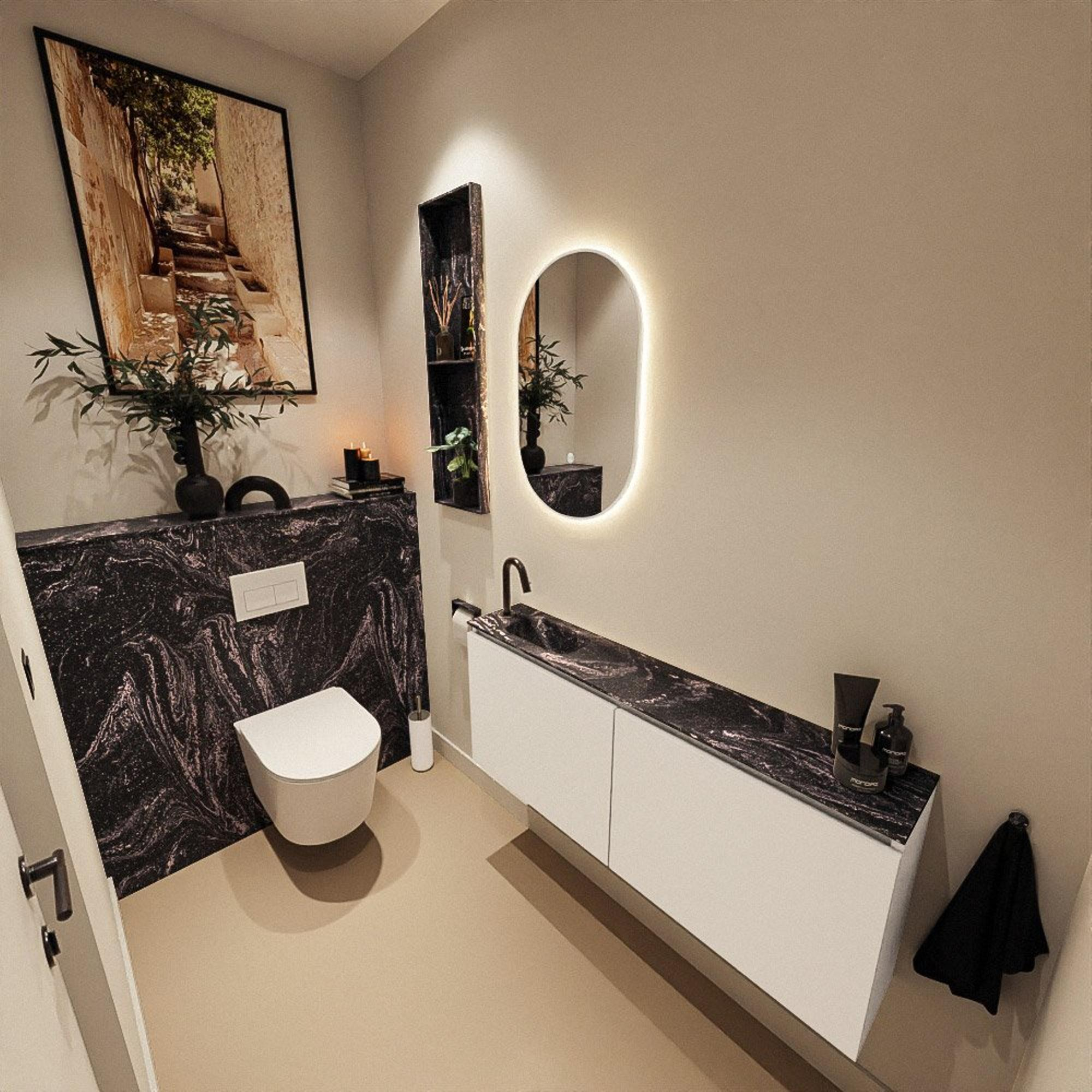 Si vous recherchez un meuble élégant et peu encombrant pour vos toilettes ou votre petite salle de bains, ce meuble de WC fin est un choix astucieux. Grâce à sa faible profondeur, vous conservez suffisamment d’espace pour bouger, tout en disposant d’un véritable lavabo et d’un espace de rangement pratique. La combinaison du décor calme Talc du meuble et du plan de lavabo en solid surface noir coloris Lava offre un aspect moderne et chic, sans être criard. Idéal si vous souhaitez créer un ensemble épuré dans un style moderne, scandinave ou minimaliste. Le lavabo est placé à gauche avec un trou de robinet, ce qui vous permet de choisir facilement un robinet assorti et de conserver un agencement logique et confortable de vos toilettes. Ce meuble donne le meilleur de lui-même dans des toilettes, une salle de bains d’appoint ou une niche étroite où vous souhaitez combiner design, fonctionnalité et facilité d’entretien.