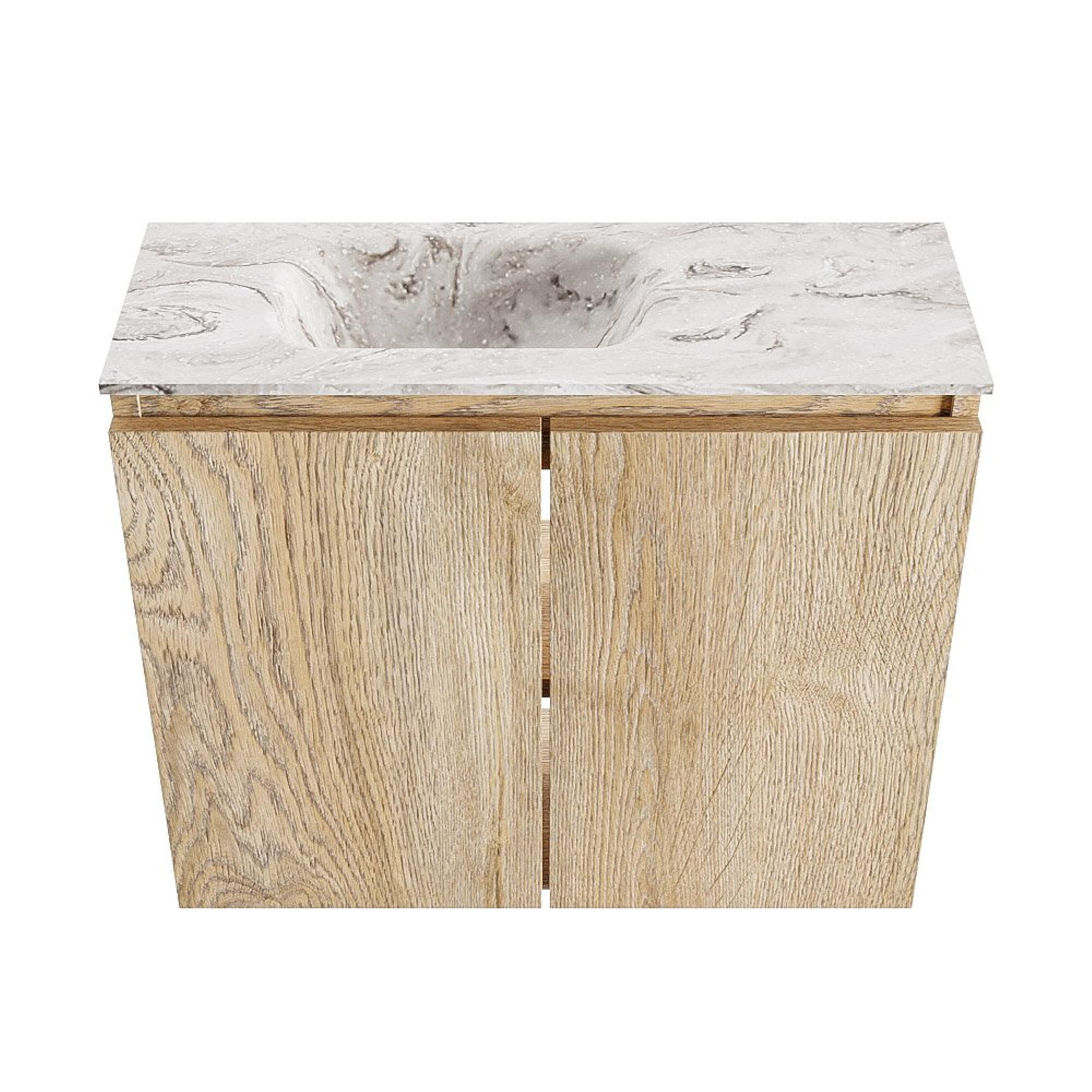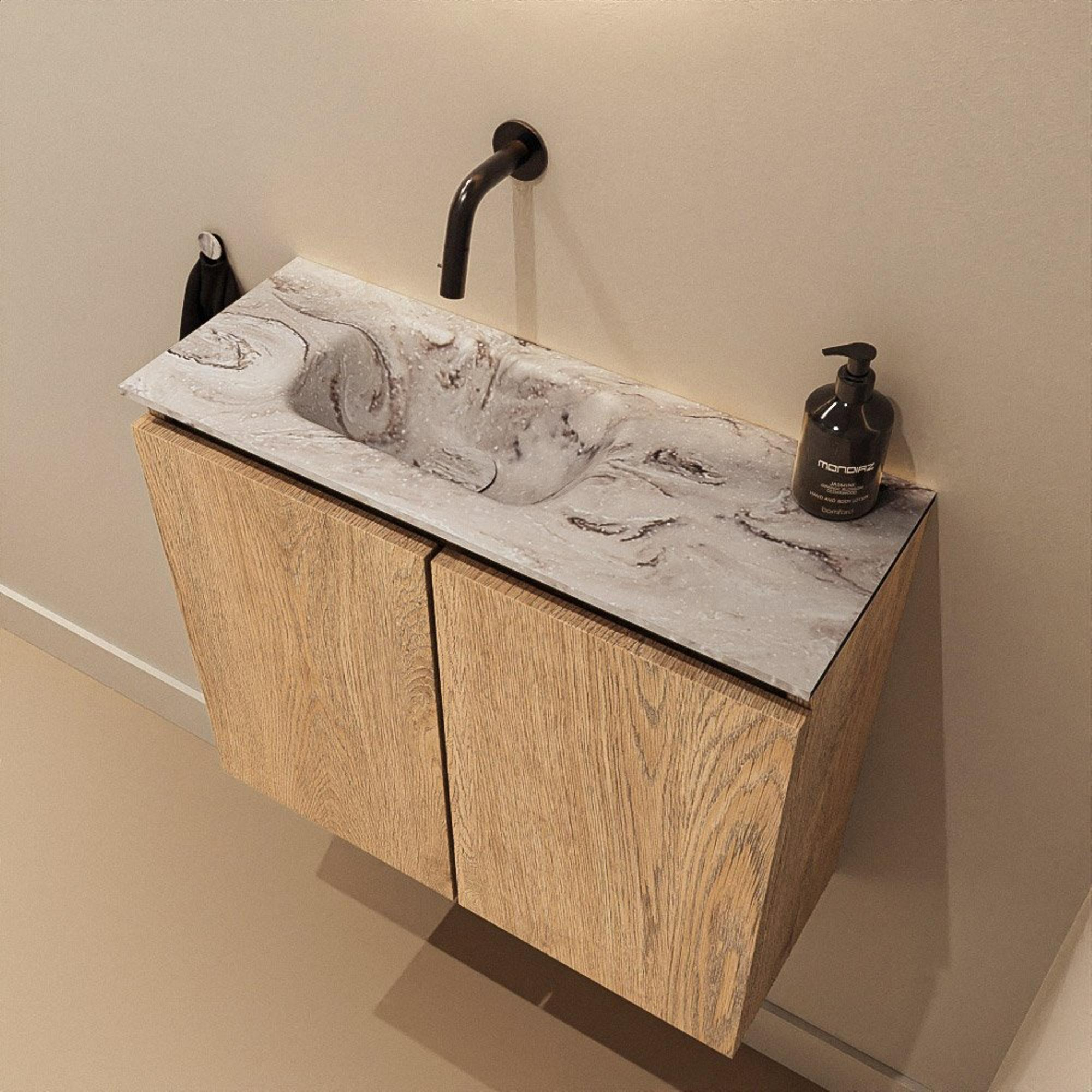 MONDIAZ TURE-DLUX Meuble WC 60cm Washed Oak. Lavabo EDEN Glace position gauche. Sans trou de robinet.