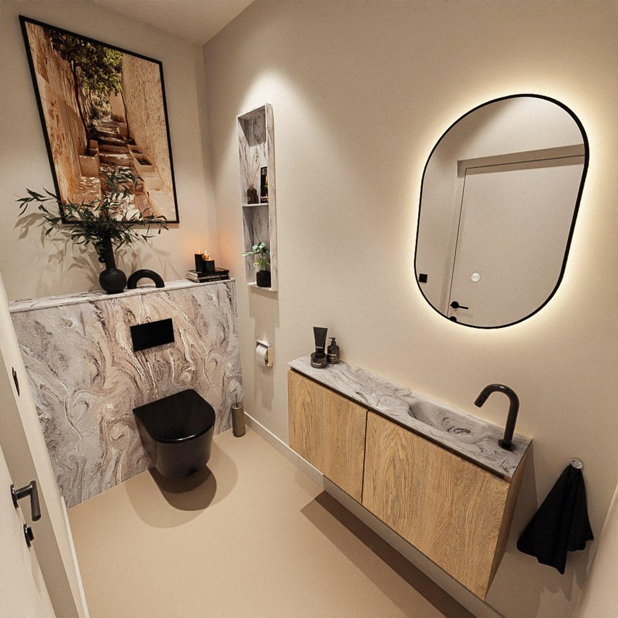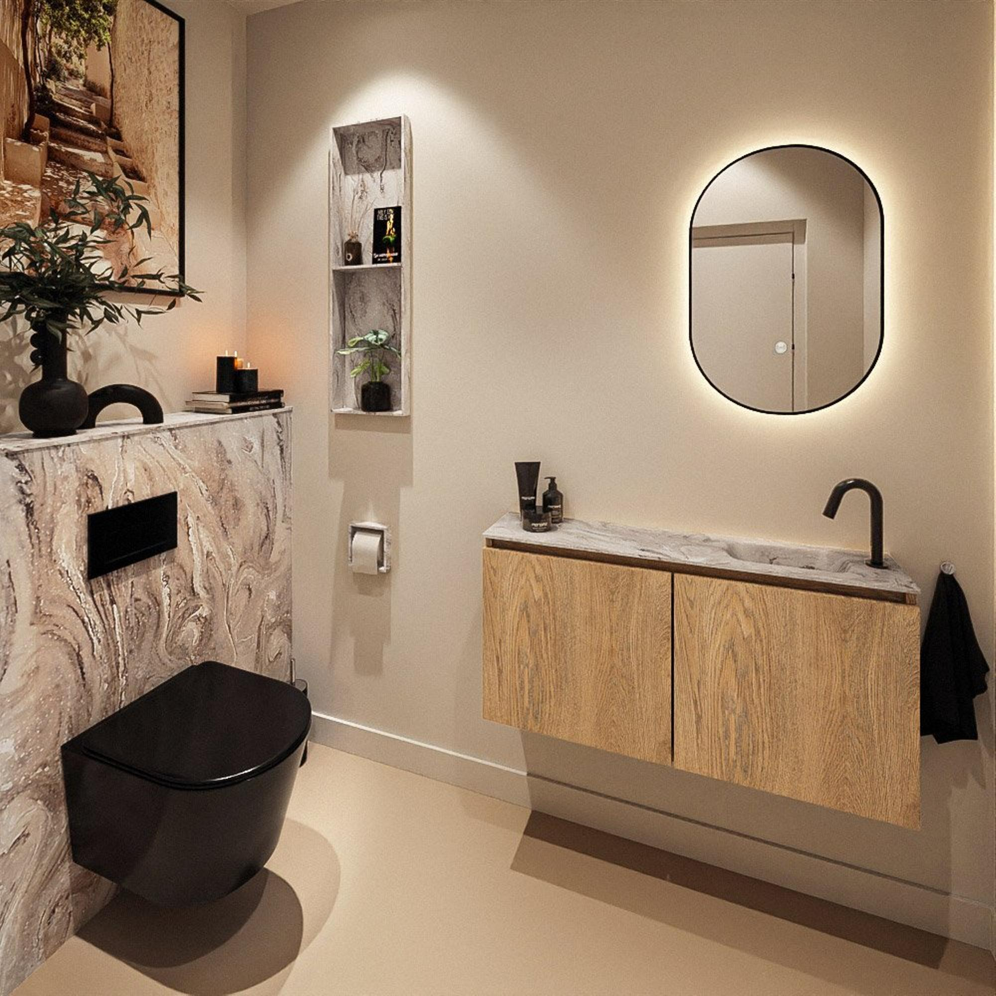 La teinte chaude Washed Oak offre une apparence naturelle et accueillante qui se marie parfaitement avec des carreaux clairs, un effet béton ou des accents noirs et laiton. La façade épurée, sans poignées, renforce le look moderne et assure un ensemble sobre et minimaliste. Le lavabo Eden assorti dans la couleur Glace y ajoute une touche raffinée et contemporaine : son aspect doux et clair paraît chic et intemporel, de sorte que votre intérieur ne semblera pas vite démodé. Grâce aux lignes nettes et au plan de toilette fin, vous créez une atmosphère d’hôtel de luxe, mais dans un format parfaitement adapté au WC ou à une petite salle de bains.
