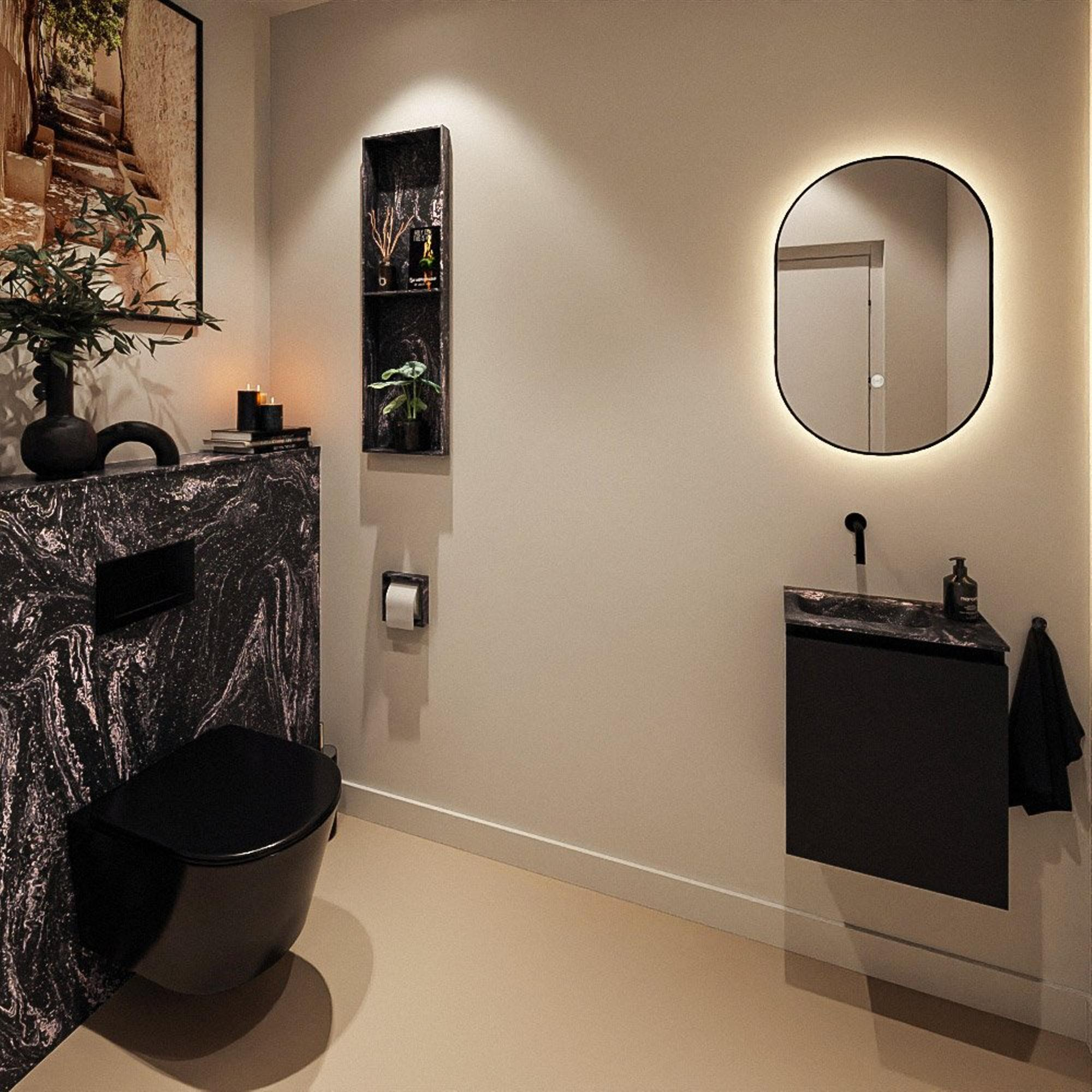 Vous recherchez un meuble de salle de bains compact mais luxueux pour les toilettes ou une petite salle de bains, qui non seulement est magnifique mais aussi pratique à l’usage au quotidien ? Ce meuble peu profond avec lavabo intégré est particulièrement adapté aux espaces étroits, aux toilettes et aux petites salles de bains où chaque centimètre compte. Grâce à des dimensions bien étudiées, le passage reste dégagé, tout en offrant un point d’eau complet. Son allure moderne aux tons sombres s’accorde parfaitement avec un style contemporain, industriel ou urban. Grâce à son matériau facile d’entretien et à son aménagement astucieux, ce meuble vous offre confort, design et une apparence soignée pour votre intérieur, sans compromis sur la qualité.