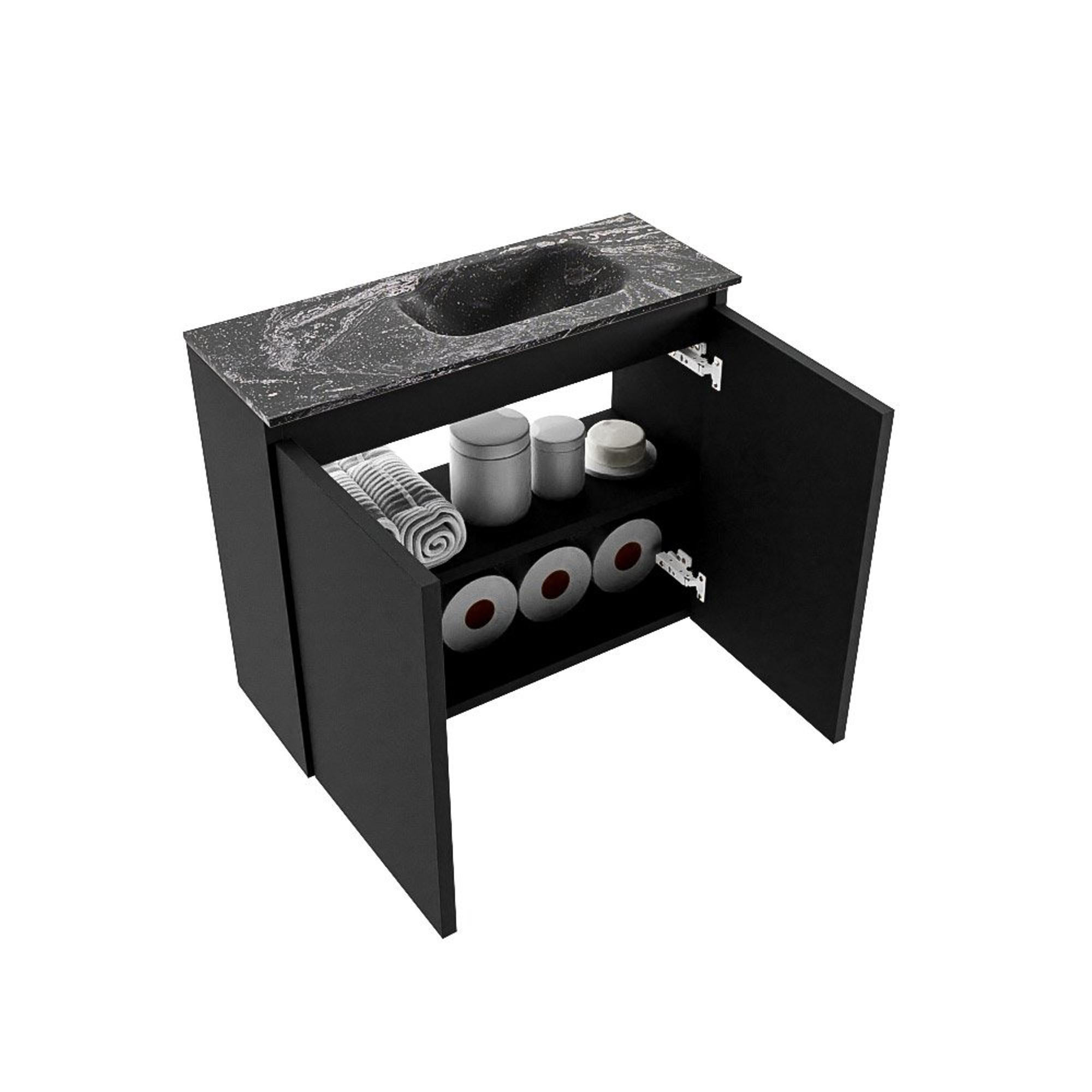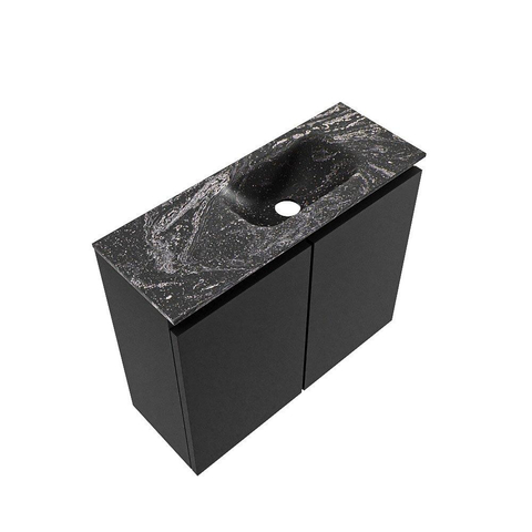 Avec ses dimensions de 60x23x50 cm, ce meuble convient parfaitement aux WC étroits et aux salles de bains compactes. La faible profondeur garantit que vous conservez suffisamment d’espace de circulation, tout en disposant d’un lavabo complet et d’un meuble pratique. Le lavabo est positionné à droite, ce qui laisse à gauche une surface de dépose confortable pour le savon, un bâton parfumé ou un accessoire décoratif. Comme aucun trou de robinetterie n’est pré-percé, vous avez toute liberté pour choisir un mitigeur encastré ou une robinetterie murale ; vous aménagez ainsi l’espace exactement comme vous le trouvez pratique et esthétique.